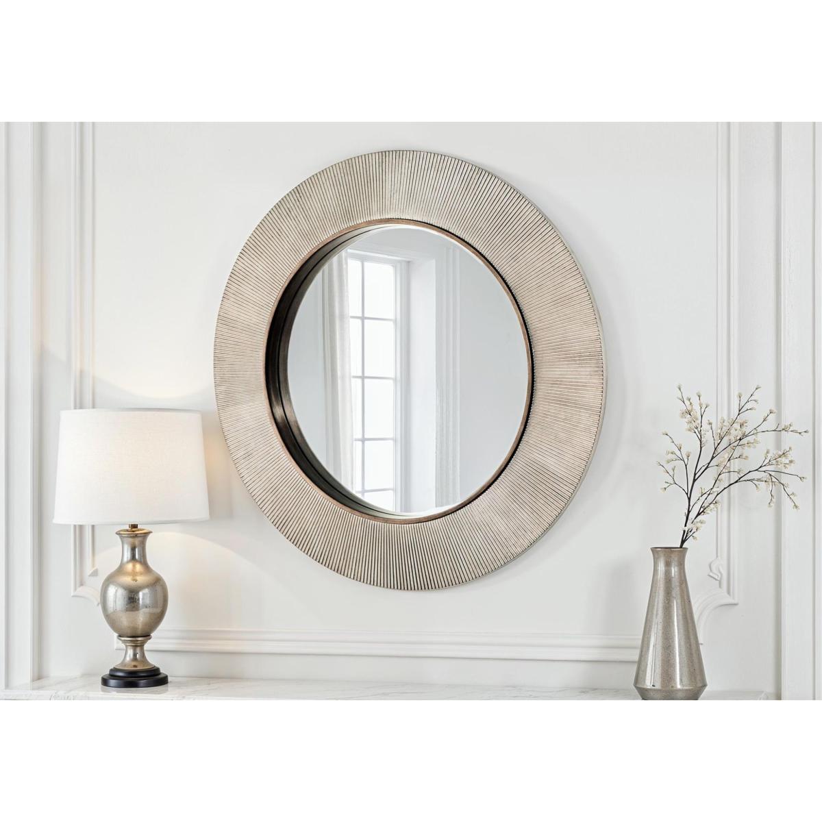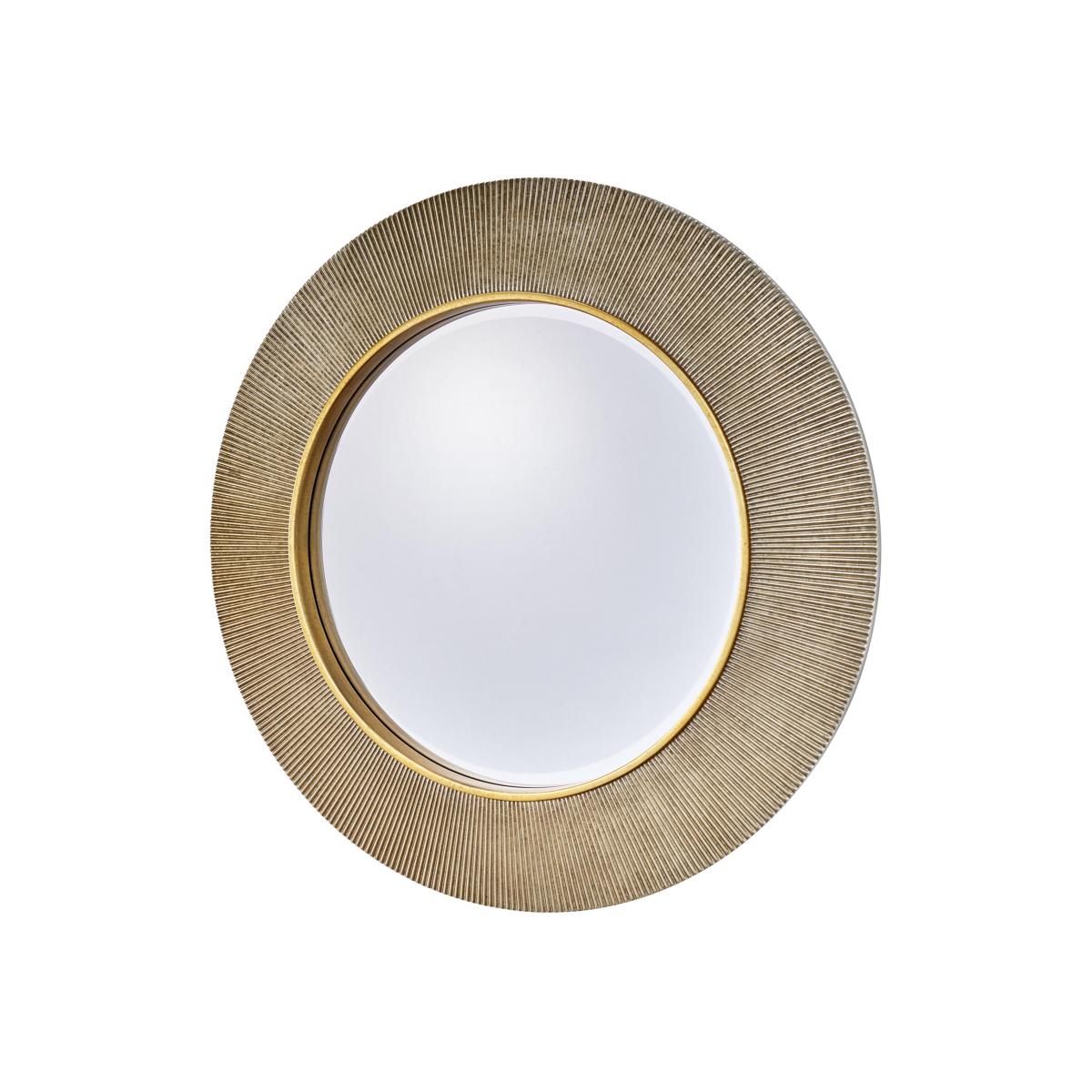 Here’s the perfect wall mirror for an entryway, hallway or feature wall. Our Elira circular bevelled mirror has an elegant timeless quality and makes an impact with its two-tone metallic frame. In a choice of finishes. Why you'll love it This circular mirror blends timeless style with a modern aesthetic. Wide metallic frame has a stylish ribbed texture. High-quality bevelled glass. Hand-gilded with a two-tone finish in a choice of metallic colours. Supplied with hooks attached – so easy to hang. This round mirror is part of the Furniture Village home accessories collection. What you need to know Resin frame. For indoor use only. To clean, apply cleaner to a soft, lint-free cloth and then wipe surface. Do not spray cleaner directly onto the mirror. Dimensions Diameter: 90 cm (36 in). Depth: 3 cm (2 in). Item code: ELIR-MIRGOLD-001