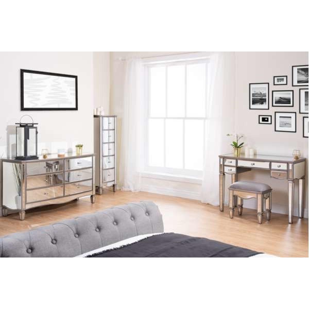 A refined glass structure with curved bevelled edges makes the Elis collection ideal for luxe bedrooms. The beautiful glass mirrored finish and crystal decoration instantly transform your space, providing a sense of space and light. Two spacious drawers with luxurious velour lining Crystal handles and decoration A glass mirrored finish Care instructions; wipe with a dry cloth Pre-assembled for ease