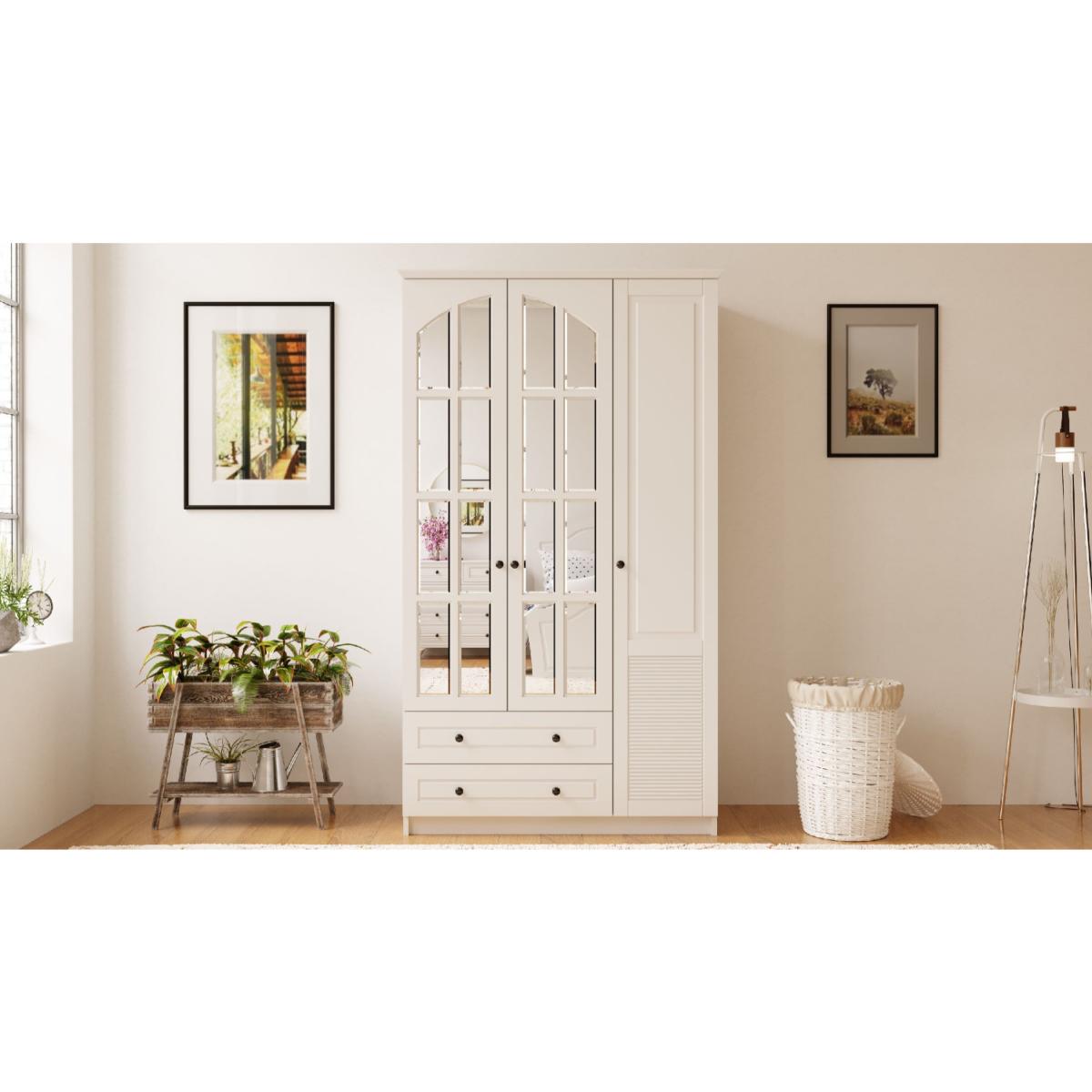 Fresh and grand are the best words describes our French inspired ELISE furniture collection. Modern and traditional elements blended with the practicality to create this well-styled range. This 3 door 2 drawer wardrobe is a stylish storage solution for all your clothes and accessories. The glass mirrors on the doors creates a dressing room atmosphere while reflecting light and space around your room. Featuring a tapered style cornicing, carved doors and finished with metal handles it offers a large hanging area combined with two deep drawers. Material Membrane coated MDF board, finished with CNC process. Glass mirror. Colour White Dimensions Width105cm,Height184cm,Depth52cm. Delivered flat packed in 4x Boxes. Total Gross Weight95.9kg.!!!IMPORTANT INFORMATION!! Due to the size and the weight of this item, it is shipped out flat packed with 2MA N White Glove Guaranteeed Next Day Delivery Service to your room of choice with PANTHER logistics. After placing your order you can book your delivery by following the email instructions from PANTHER Logistics. !! Once the item is dispatched from our warehouse , cancelation or change of delivery date is subject to 50 charge!! Please note that items can not be left in a safe place or with a neighbour. If you are not happy with this service please let us know before item is dispatched and we will send your item with a standard 2man 7-10 days delivery service instead of next day service.