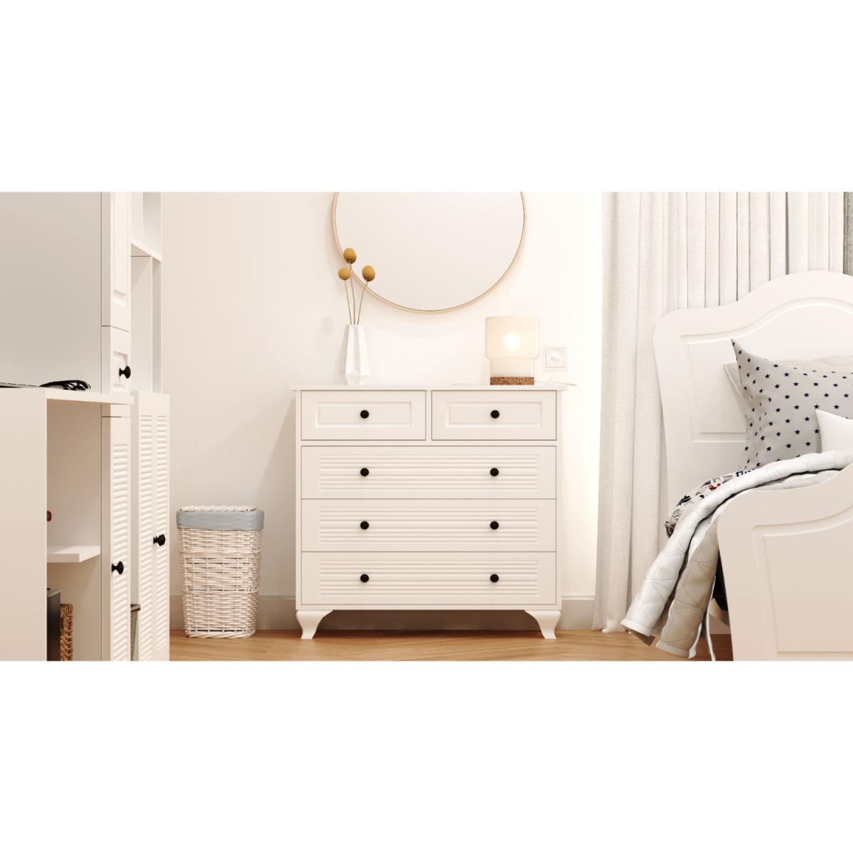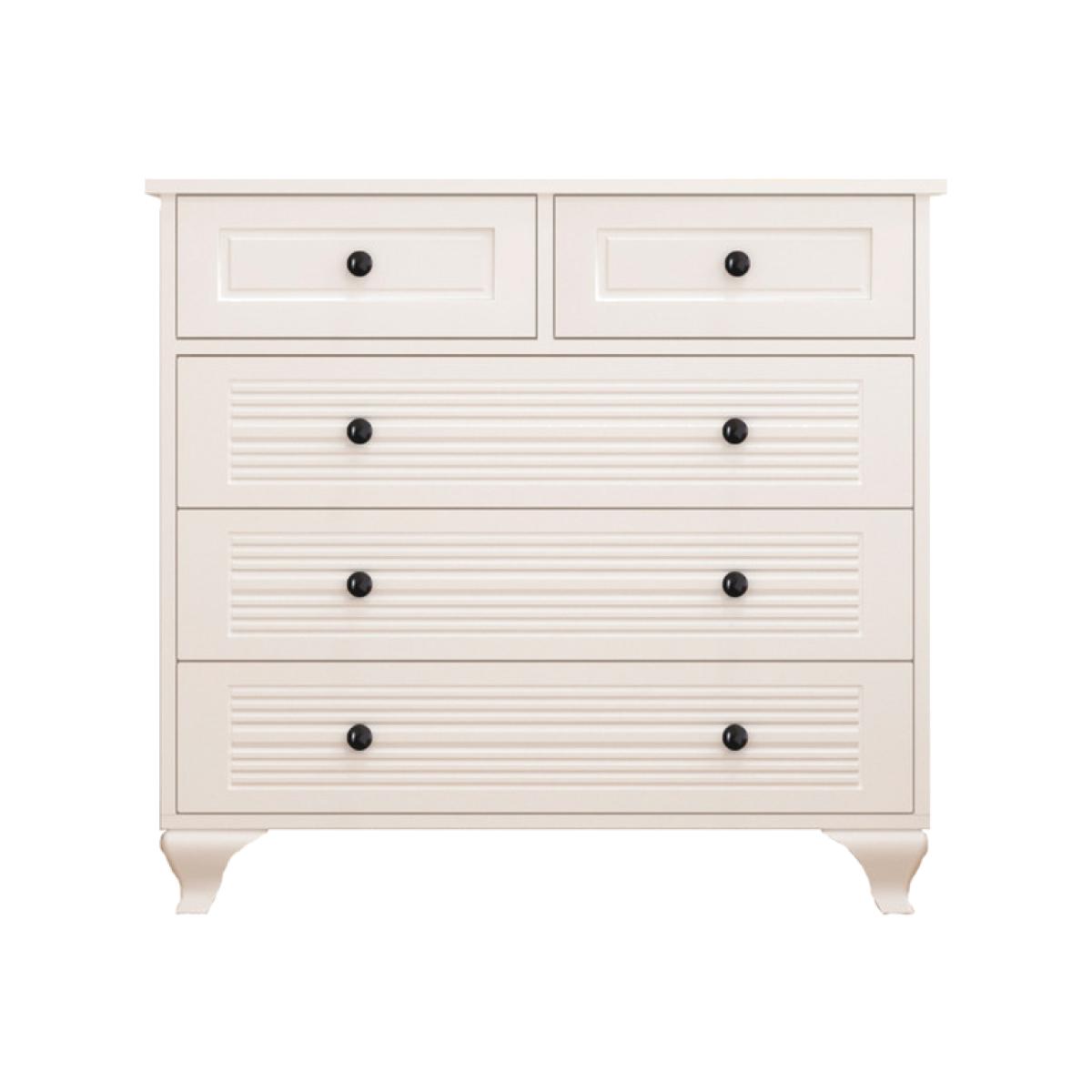 Fresh and grand are the best words describes our French inspired ELISE furniture collection. Modern and traditional elements blended with the practicality to create this well-styled range. Featuring five deep drawers, tapered feet and finished with black metal handles it boosts timeless design while offering you ample space for your folded clothes or accessories, such as sweaters, jeans, hats, hand bags, etc. Material Membrane coated MDF board, finished with CNC process. Colour White Dimensions Width90cm,Height86cm,Depth40cm. Delivered flat packed in 2x Boxes. Total Gross Weight40.7kg.