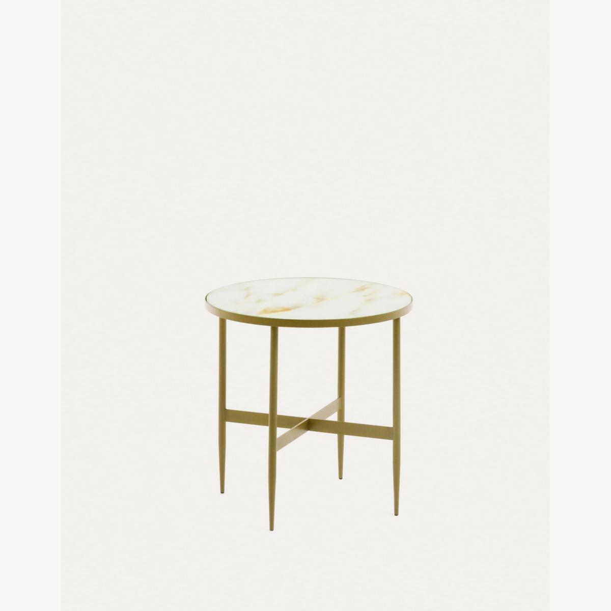 The Elisenda side table, with a round, tempered glass top and steel legs with a golden finish, is unique, because under the glass there is a marble-finish layer which gives it a different and elegant touch, so the Elisenda side table gains a very chic look. In addition, with 50 cm, you can comfortably put your accessories on it thanks to its spaciousness. Be unique.