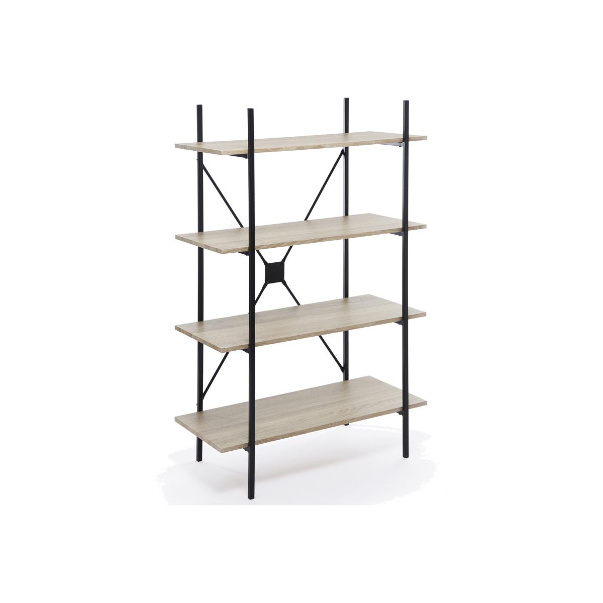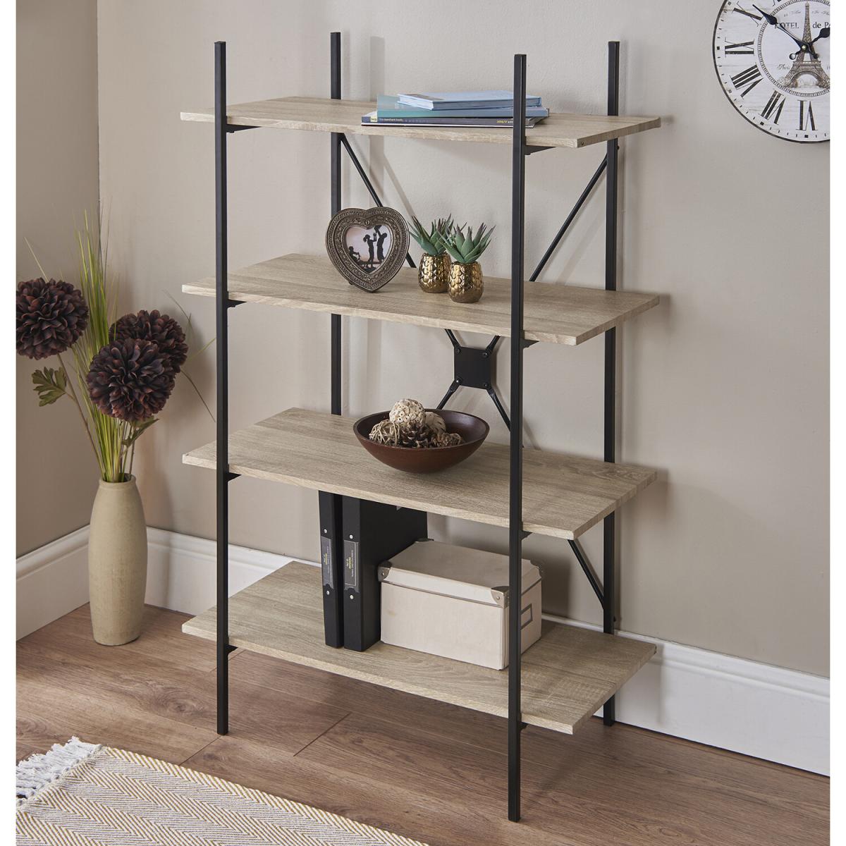 The Elite Elite 4 Tier Book Shelf has an urban look that is perfect for a contemporary, industrial-chic look. The four-tier unit provides ample space to hold A4 lever arch files, books, collectables, treasured photos, while complementing any home office, living room, hallway or bedroom. Manufactured from a sturdy powder coated steel frame with grey woodgrain laminated PB shelves. Home assembly required.