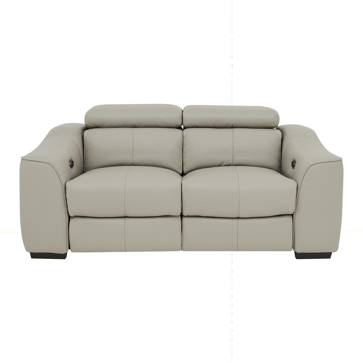 The Elixir modular collection is the essence of sleek, contemporary, comfortably cushioned elegance. Choose between 100% premium leather or soft to the touch woven fabric upholstery. Adjustable headrests allow low back style or high back support. The distinctively curved arms are accentuated by contrasting or matching piping, while chrome accents add to the high-end style. Exclusive to Furniture Village, with the option of power or manual recliners. The Elixir two seater leather sofa is compact but it feels roomy, and it is every bit as comfortable as it is stylish. It’s easy to love the sleek, contemporary lines, distinctively curved arms, beautiful soft premium leather upholstery with feature stitching, chrome accents and modern pewter effect feet. This small leather sofa is beautiful to look at, and beautiful to sit in. Feel the bounce and support of the no-sag spring seat suspension and relax into the comfort of the high-density foam with fibre cushioning. It has a fashionably low profile but the adjustable headrests mean that this clever sofa offers high-backed comfort whenever you need it. And if you opt for power or manual recliners you can put your feet up – the power recliners have useful USB ports. Choose your favourite colour for the upholstery and either matching or contrasting piping. The Elixir leather two seater sofa is part of the Elixir collection, exclusive to Furniture Village. Did you know;. Natural leather has unique marks and characteristics with variance in colour and texture, and softens wtih use. Smoothing seat cushions prevents 'puddling'.