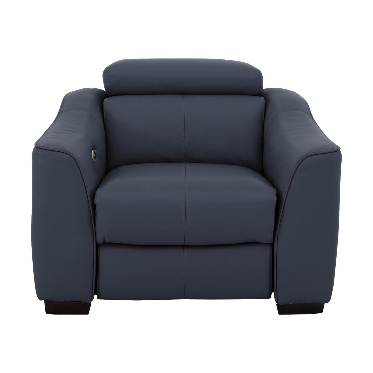 The Elixir modular collection is the essence of sleek, contemporary, comfortably cushioned elegance. Choose between 100% premium leather or soft to the touch woven fabric upholstery. Adjustable headrests allow low back style or high back support. The distinctively curved arms are accentuated by contrasting or matching piping, while chrome accents add to the high-end style. Exclusive to Furniture Village, with the option of power or manual recliners. The Elixir leather armchair invites you to sit down and relax in elegant, modern style. We love its clean, modern lines and beautiful soft premium leather upholstery with feature stitching and chrome accents. With its sleek, contemporary design and luxuriously deep cushioning this leather chair looks and feels fantastic. Lovely finishing touches are the Elixir’s distinctively curved arms and pewter-effect feet. Choose your favourite colour for the upholstery and either contrasting or matching piping. The seat and back cushions keep their shape for longer and are wonderfully comfortable because of their high-density foam with fibre fillings, no-sag spring seat give support and bounce. And thanks to the adjustable headrest you can enjoy high-backed comfort whenever you need it. You can even put your feet up with an optional power or manual recliner – the power recliner has a useful USB port. The Elixir leather armchair is part of the Elixir collection, exclusive to Furniture Village. Did you know?. Leather is a beautiful, natural material with its own unique marks and characteristics, so texture, tone and colour can vary slightly in and between panels. Leather stretches, softens and settles with use. When you sit on a new leather sofa or chair it’s normal for the leather to ‘puddle’ slightly due to initial stretching. A simple smoothing of the leather across the top of the seat cushion if this occurs keeps your sofa or chair looking good. Interiors settle over time so, to maximise comfort, please plump the seat and back cushions regularly, and – where possible – turn and rotate to ensure even wear. Wipe leather upholstery with a damp cloth, and please use only the recommended cleaning products. If your sofa or chair is a recliner model, please allow time for the recliner to settle. Minor gaps are necessary for ease of motion, and vary depending on floor type. Manual recliners can feel a little stiff at first, but the motion eases with use.