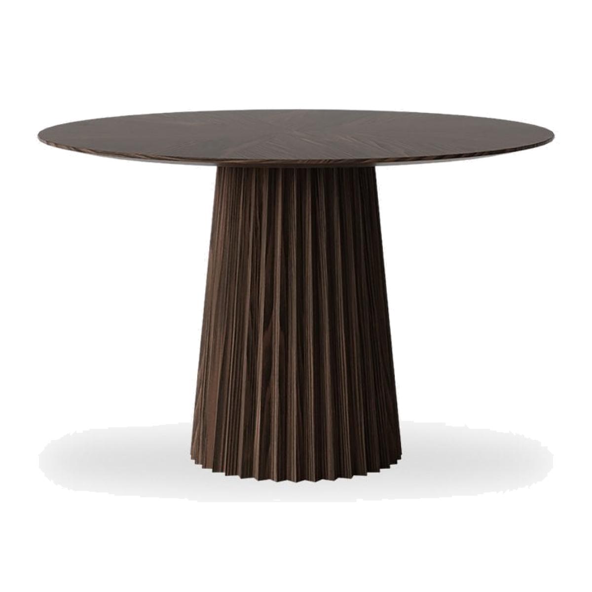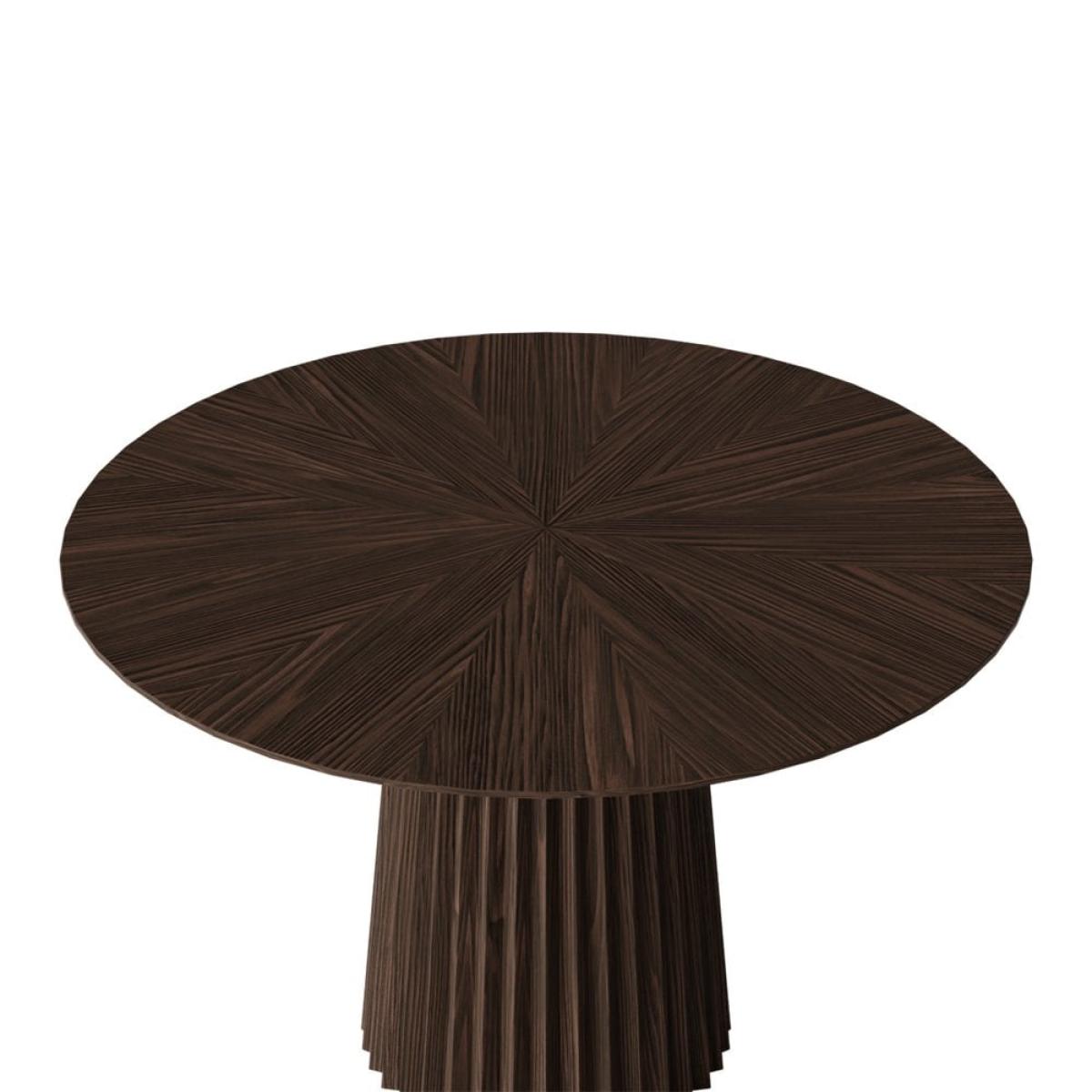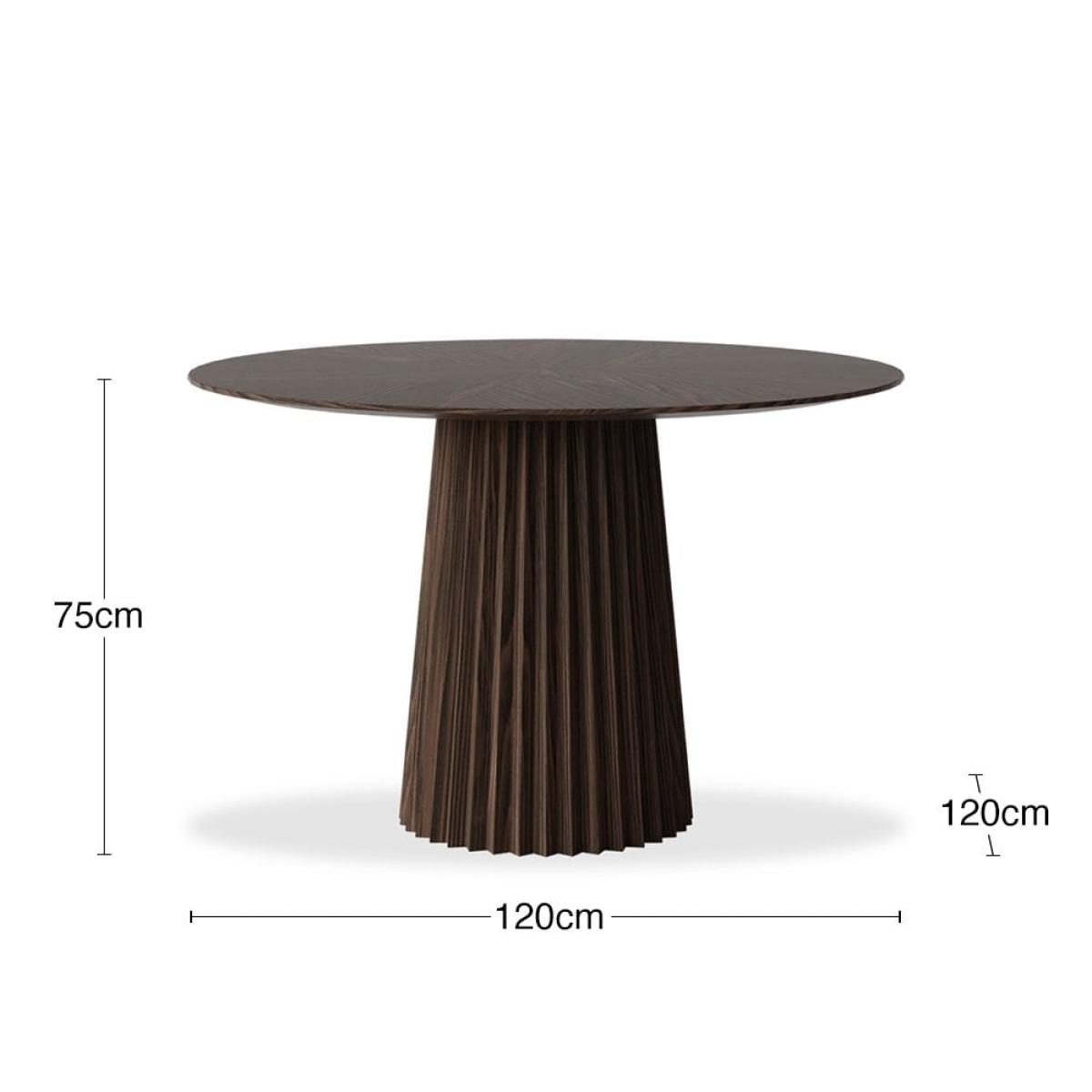 For a polished look, monotonal furniture offers a sleek and refined style to living spaces. The Eliza Wooden Dining Table is just that with the clean lines and functionality you've been looking for; a thick cylindrical base in a pointed ribbed design finished with a starburst style wooden surface, all coated is a smooth walnut-stain that highlights and natural grains within the wood.