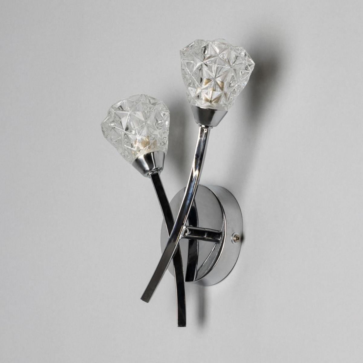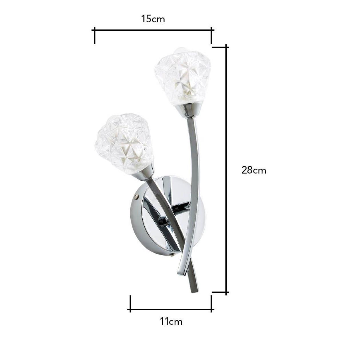 Add a touch of glamour to your bathroom décor with the Eliza 2 Light Wall Light. This wall light comes in a sleek chrome finish for a high shine aesthetic and features diamond effect shades. It is also IP44 rated, ensuring that it is water resistant for use in the bathroom, looking ideal when styled on either side of a bathroom mirror.