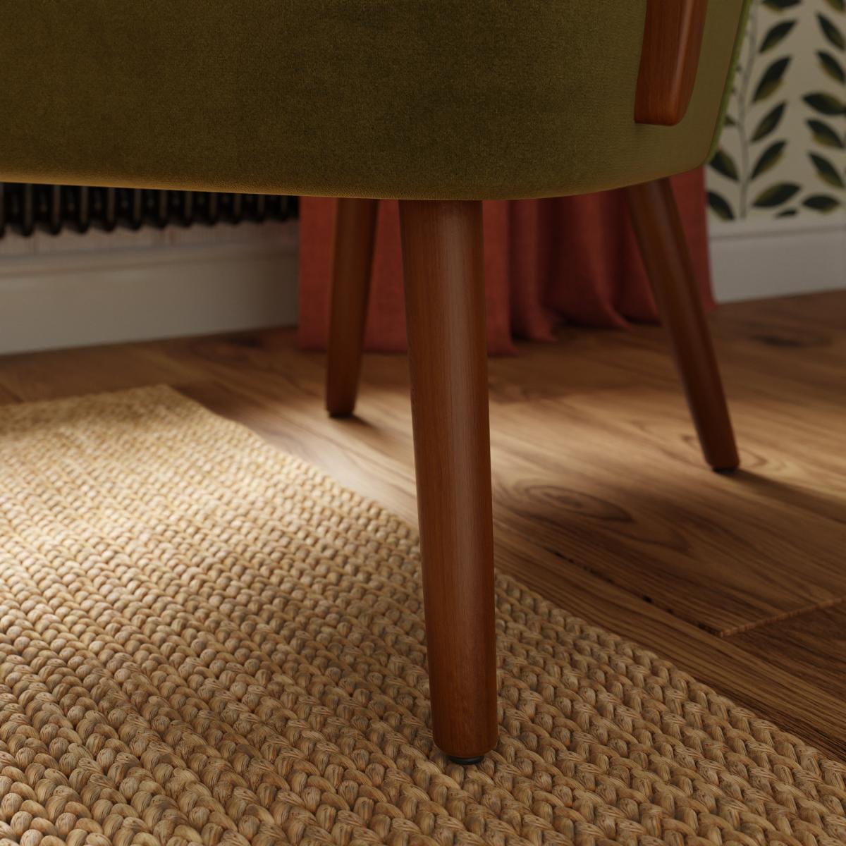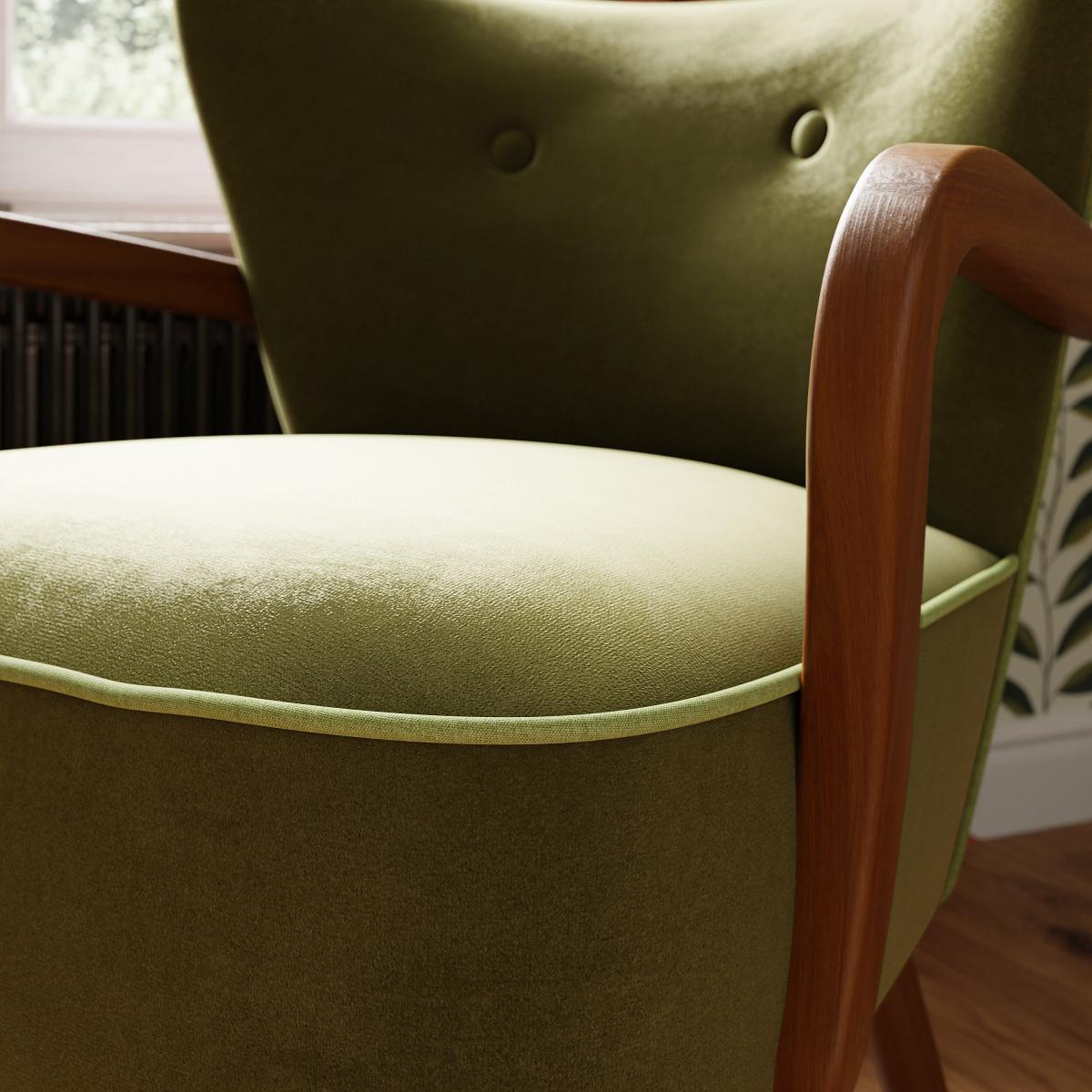 I’m a fan of the Eliza chair for its clean, mid-century silhouette and subtle contrast piping, which means it slips easily into Scandi, retro-inspired or eclectic schemes. The olive-green fabric and warm timber legs bring just enough colour without dominating, so it works as a standalone feature or paired with neutral walls and natural textures. For styling, tuck it into a cosy reading corner by a slimline floor lamp and small side table. Layer in a knitted throw or a cushion in a complementary tone (mustard, terracotta or soft grey) to add depth. It also responds well to a jute rug or leafy houseplant nearby, keeping the look relaxed yet considered.
