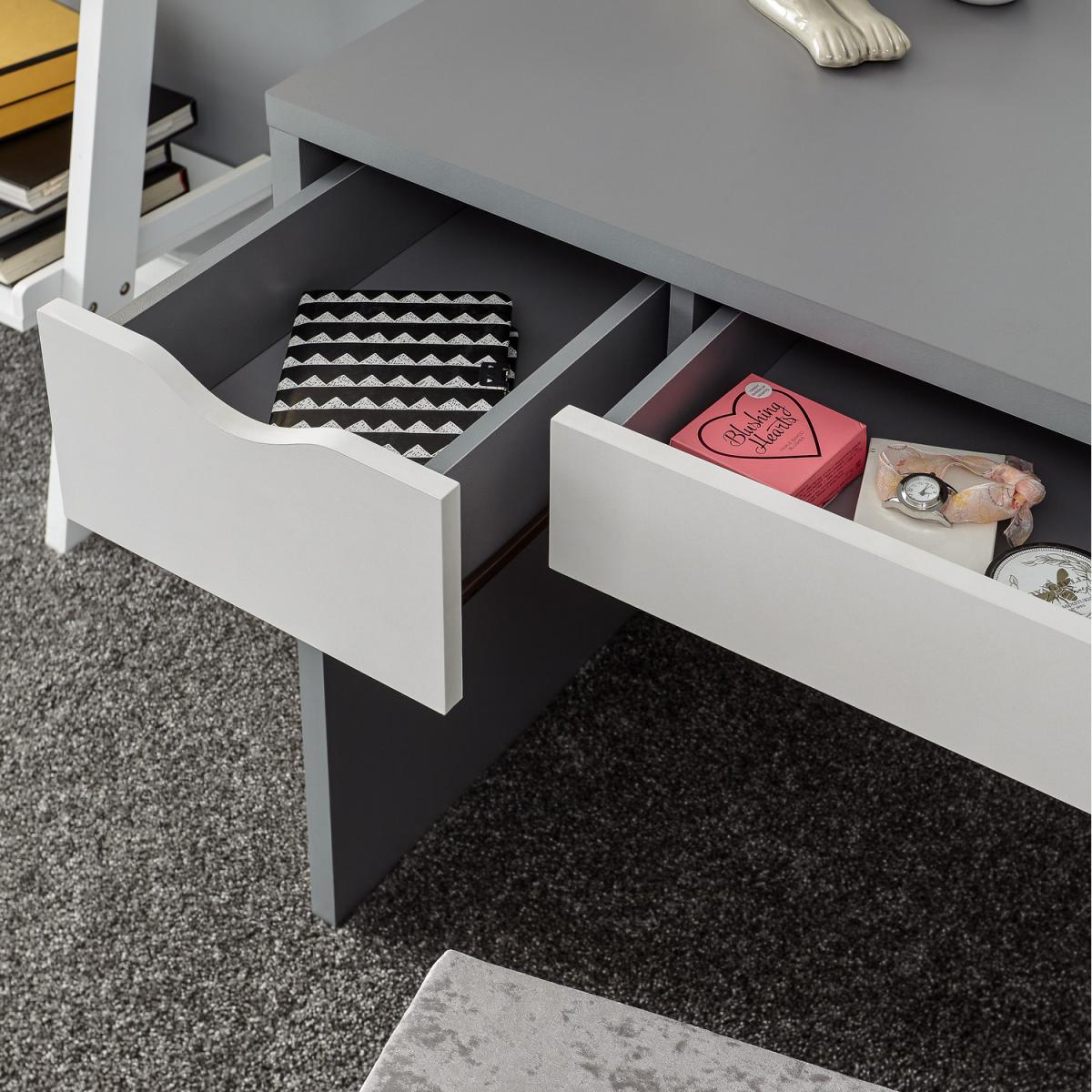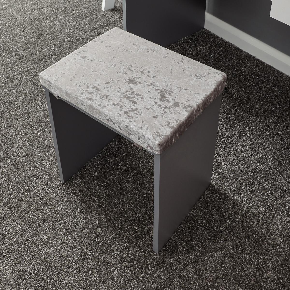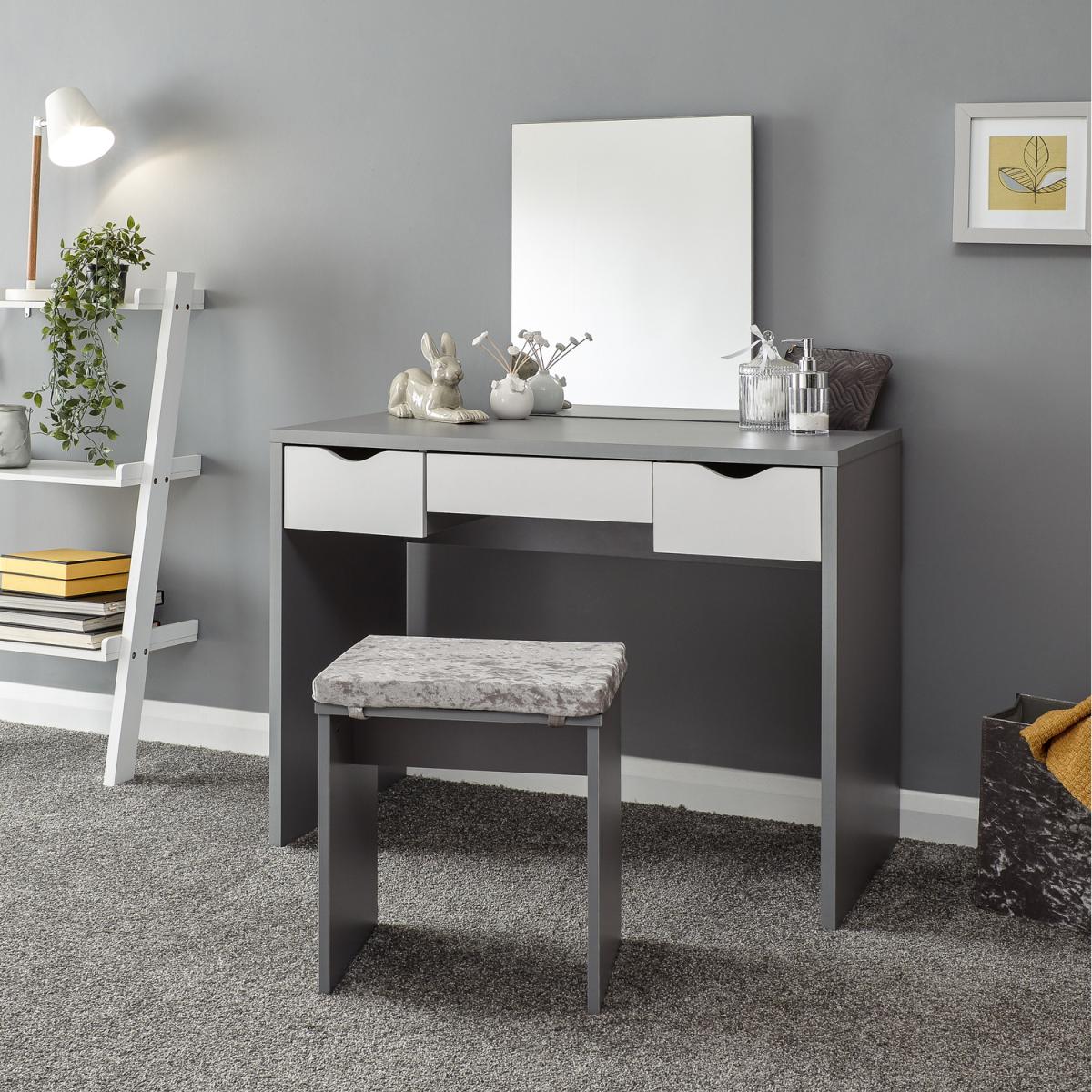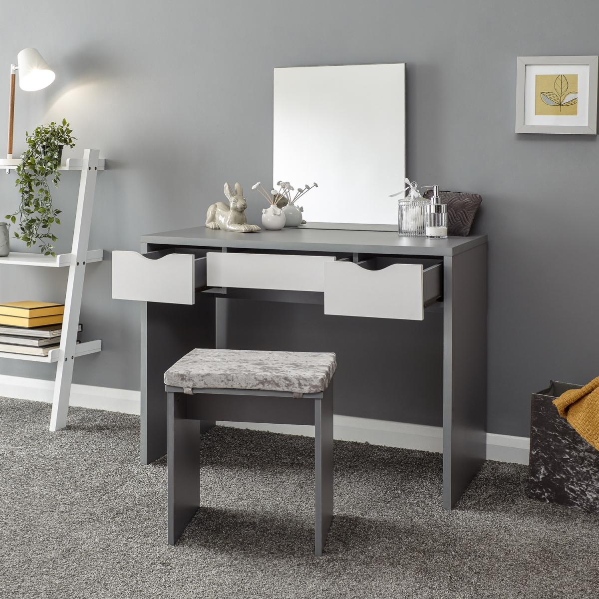 Treat yourself to a dressing table set that's compact and contemporary in design - ideal for a bedroom where space is at a premium. The simple console-style table has a painted finish, with a trio of drawers in a contrasting shade - each featuring cut-out handles. The table-top has ample space for ornaments and decorative accessories, and there's a fixed frameless mirror to the back. The matching stool has a removable padded cushion in a plush cover and is designed to slip under the table when not in use.