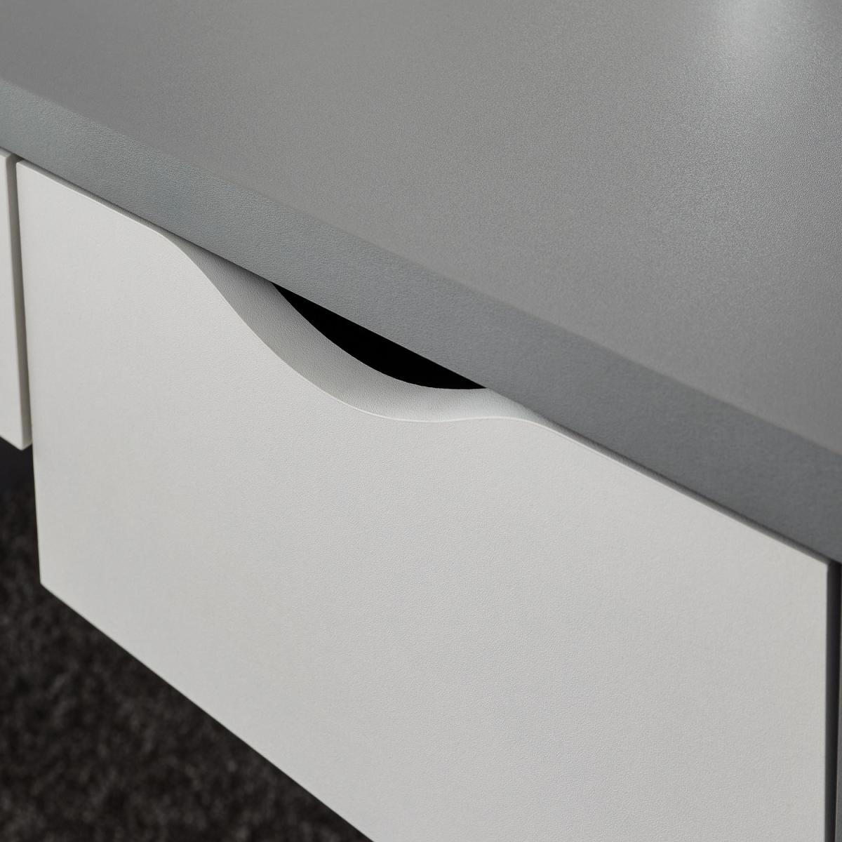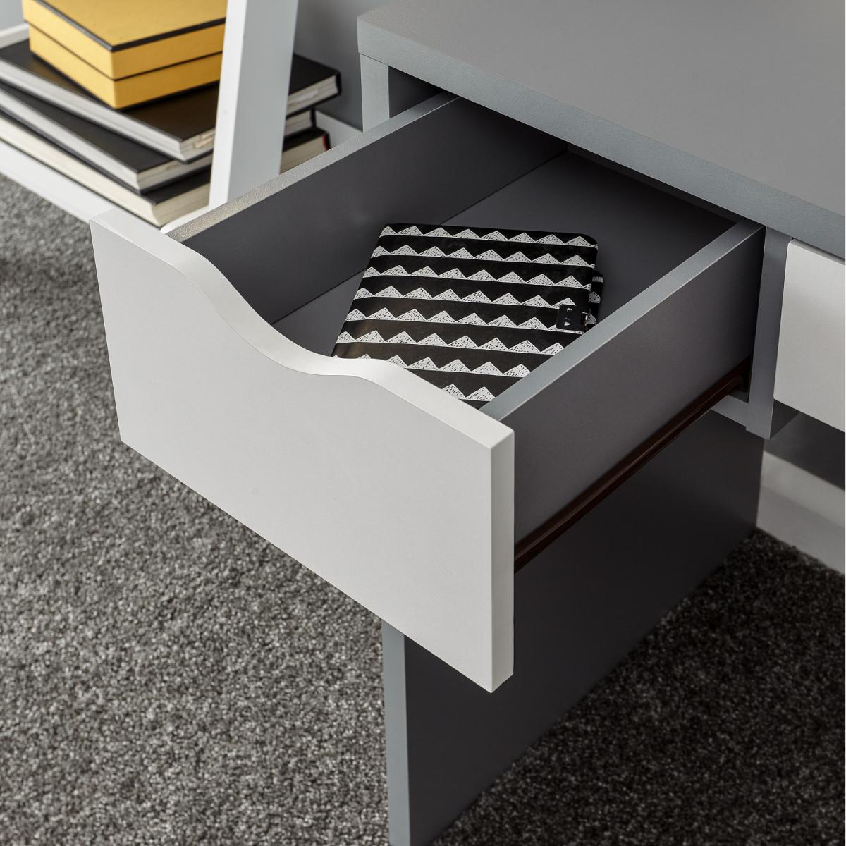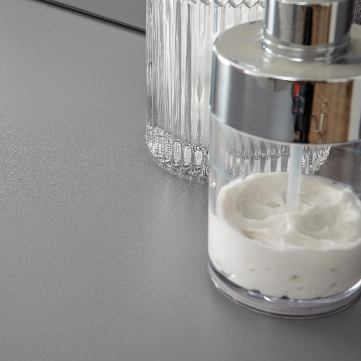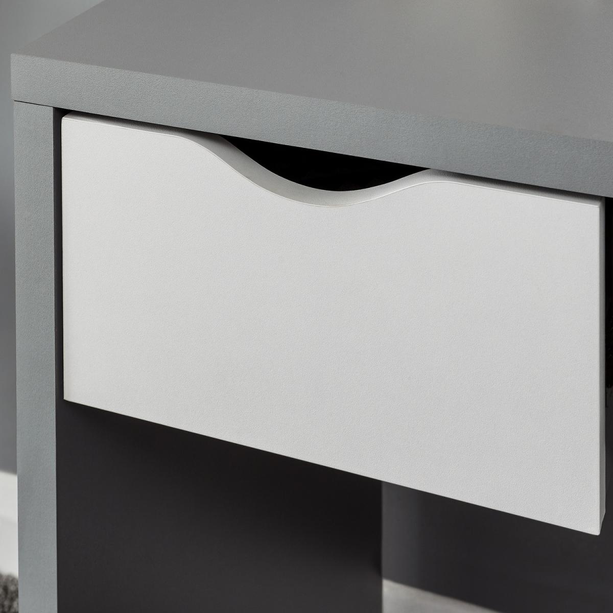 Treat yourself to a dressing table set that's compact and contemporary in design - ideal for a bedroom where space is at a premium. The simple console-style table has a painted finish, with a trio of drawers in a contrasting shade - each featuring cut-out handles. The table-top has ample space for ornaments and decorative accessories, and there's a fixed frameless mirror to the back. The matching stool has a removable padded cushion in a plush cover and is designed to slip under the table when not in use.