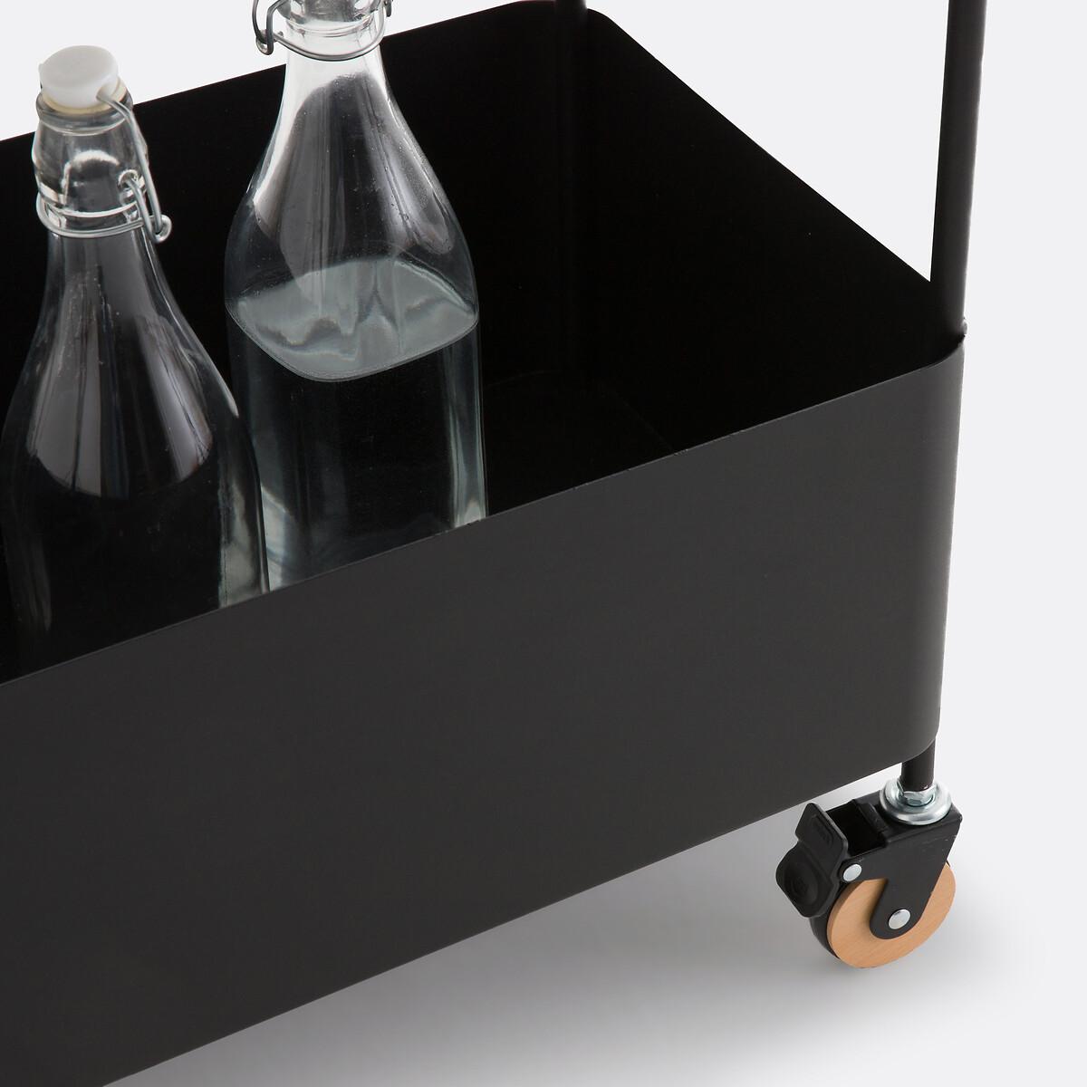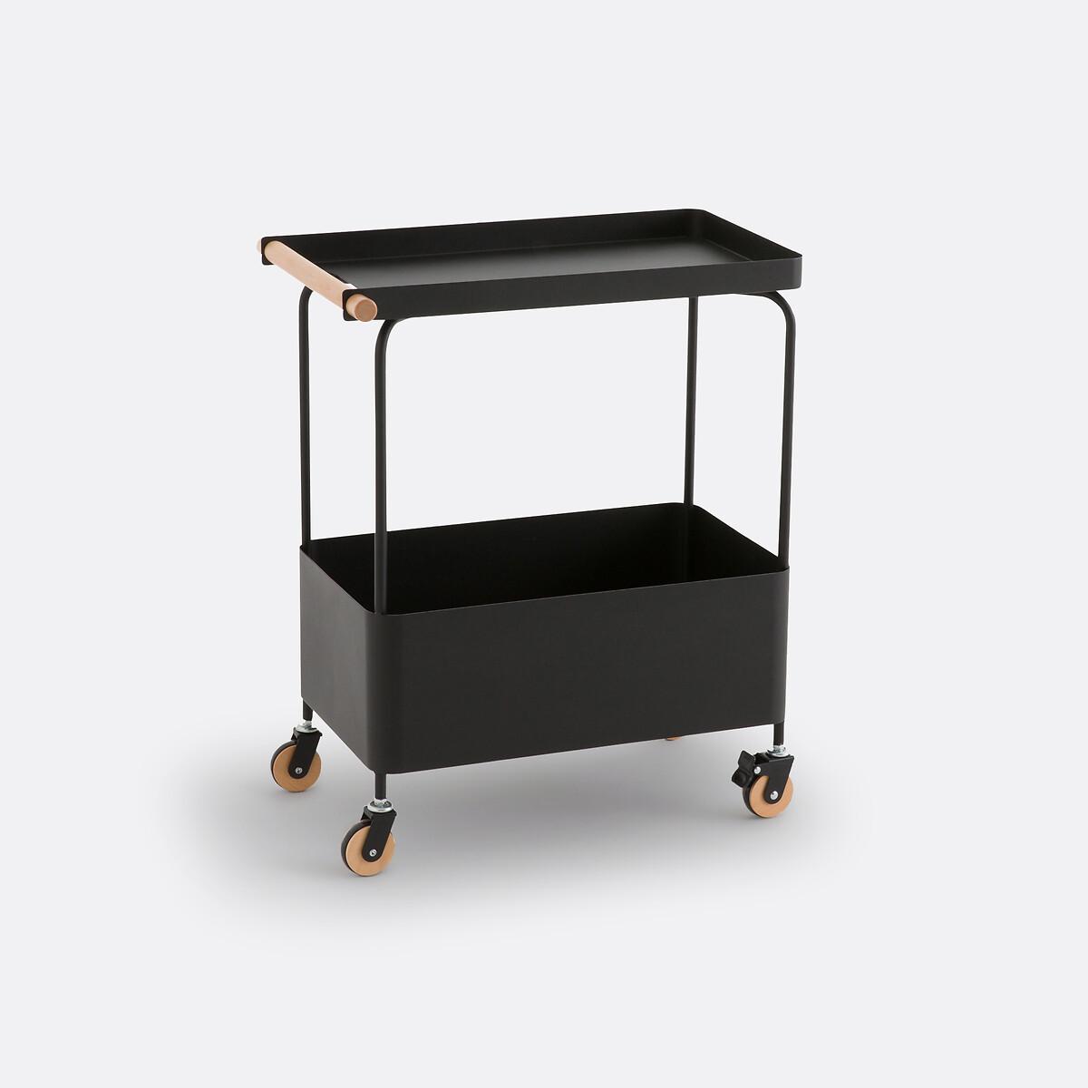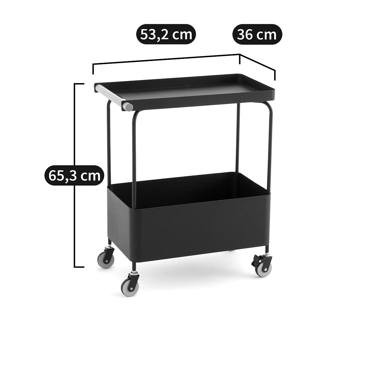Ultra functional and mobile, the Elkim tinted steel trolley on wheels is ideal for always having what you need at hand. Product Details • Steel epoxy finish • 1 large handle in solid beech, nitrocellulose varnish finish • Mounted on 4 casters • Ready to assemble: casters and bar to fixDimensions. Overall • Width: 53.2cm • Height: 65.3cm • Depth: 36cm • Weight: 8.5kg. Usable space • Upper level: L46.5 x D30 x H3.5cm • Lower storage: L50 x D30 x H18cmDelivery:. This product is sold ready to assemble. Note! Please check that all access points are large enough to accommodate your delivery (doors, stairs, lifts).Dimensions and weight of parcel • 1 parcel • L58 x H68 x DD38cm. 10kg.