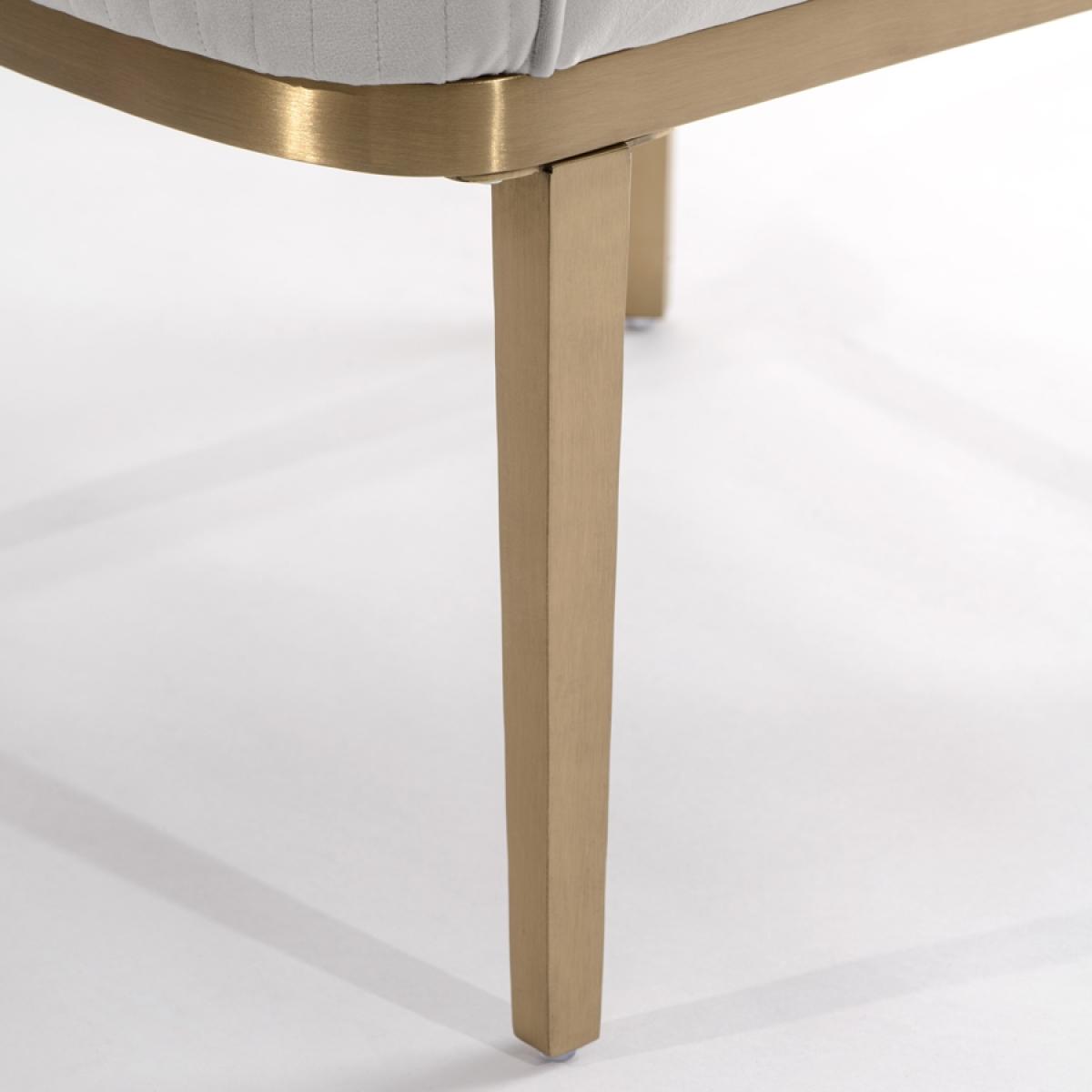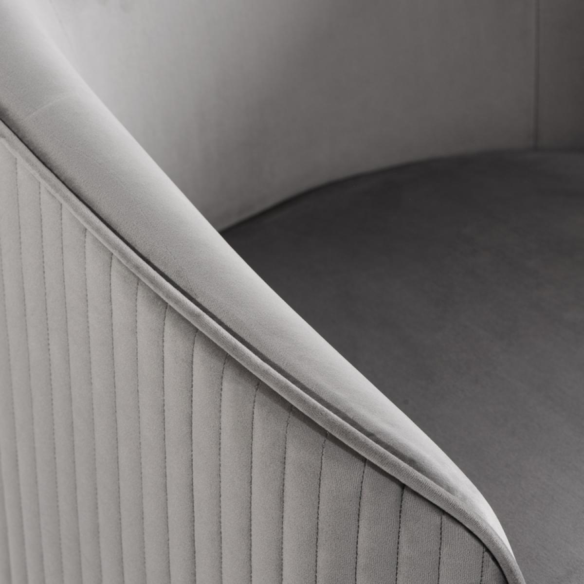 Statement chair inspired by glamorous American Art Deco interiors. Generous proportion, also suitable for use as a compact armchair. Sprung base with comfortable deep foam and fibre filling. Brushed stainless steel base with brass finish. Fluted upholstery to sides and back. Detachable legs. Velvet fabric.