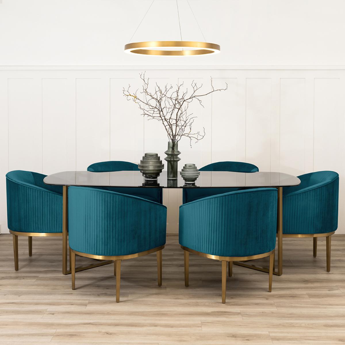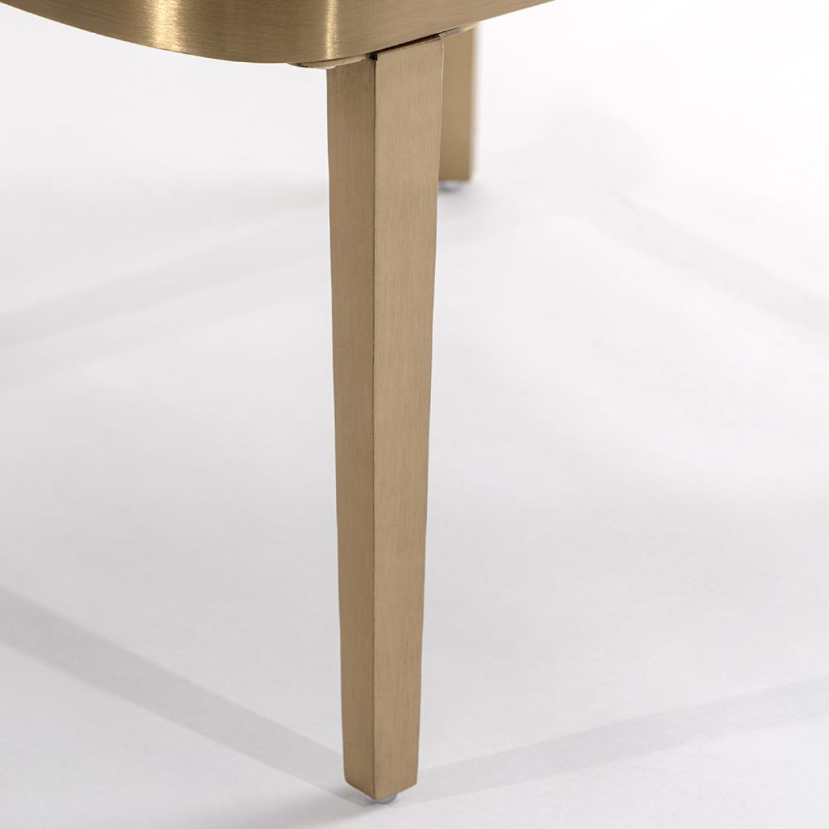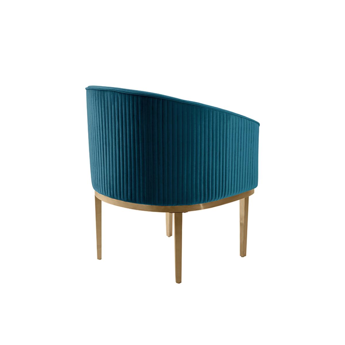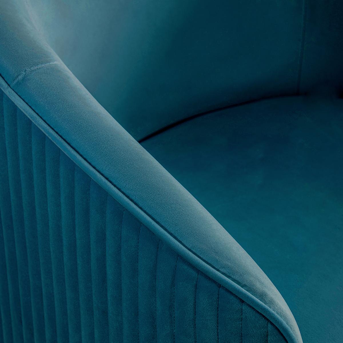 Statement chair inspired by glamorous American Art Deco interiors. Generous proportion, also suitable for use as a compact armchair. Sprung base with comfortable deep foam and fibre filling. Brushed stainless steel base with brass finish. Fluted upholstery to sides and back. Detachable legs. Velvet fabric.