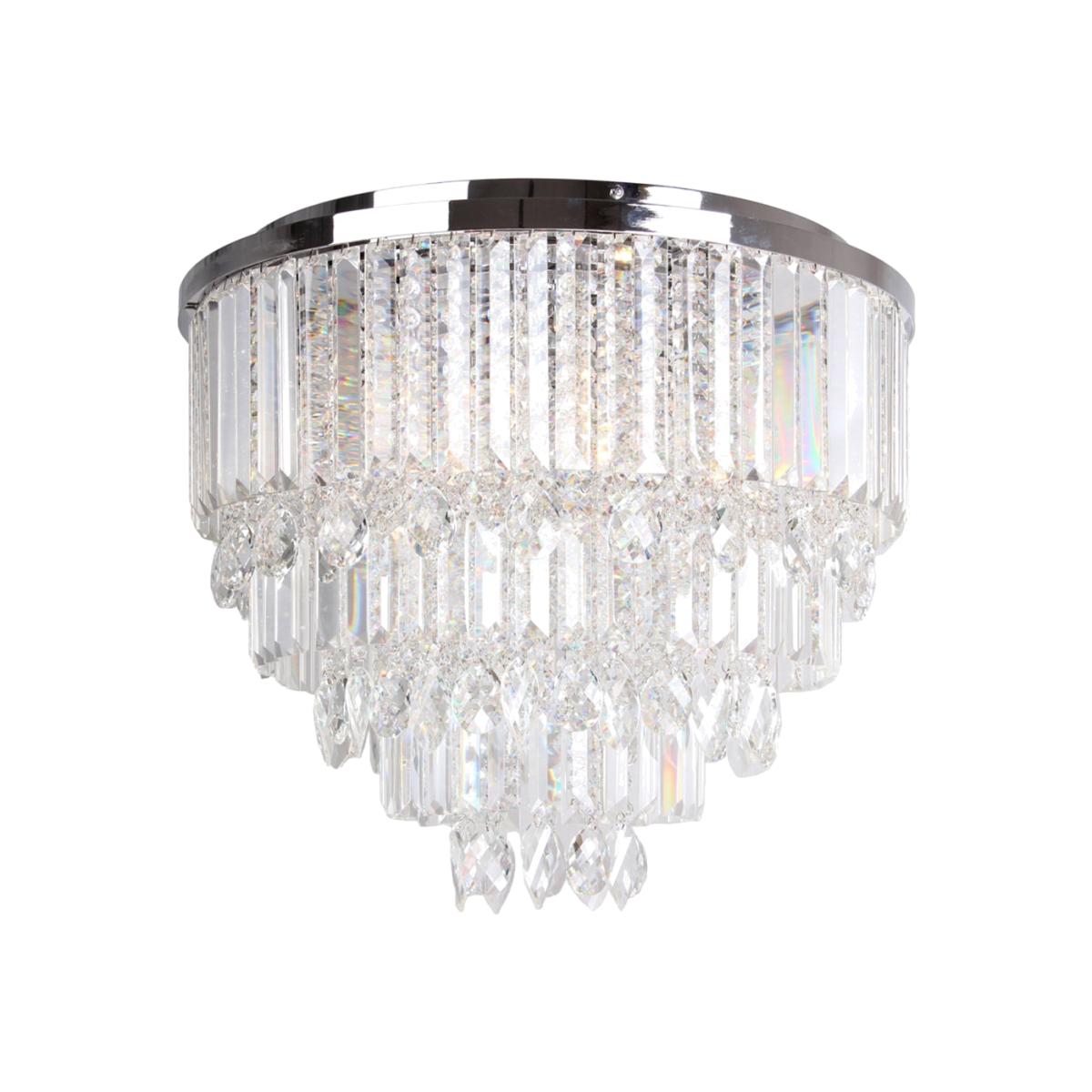 A truly show stopping piece, the Ella flush ceiling light has been designed to create a dramatic and glamourous statement in your home. The Ella ceiling light features staggered layers of sparkling cut glass crystals hanging off a circular chrome finish frame, that create a dazzling display in your room when lit. The flush finish on the Ella ceiling light means you can create a statement even in the tightest of spaces as it fits straight to the ceiling. If you would like a bit more drama, the Ella also comes in a pendant that is perfect for hanging over a dining table or in your living room.