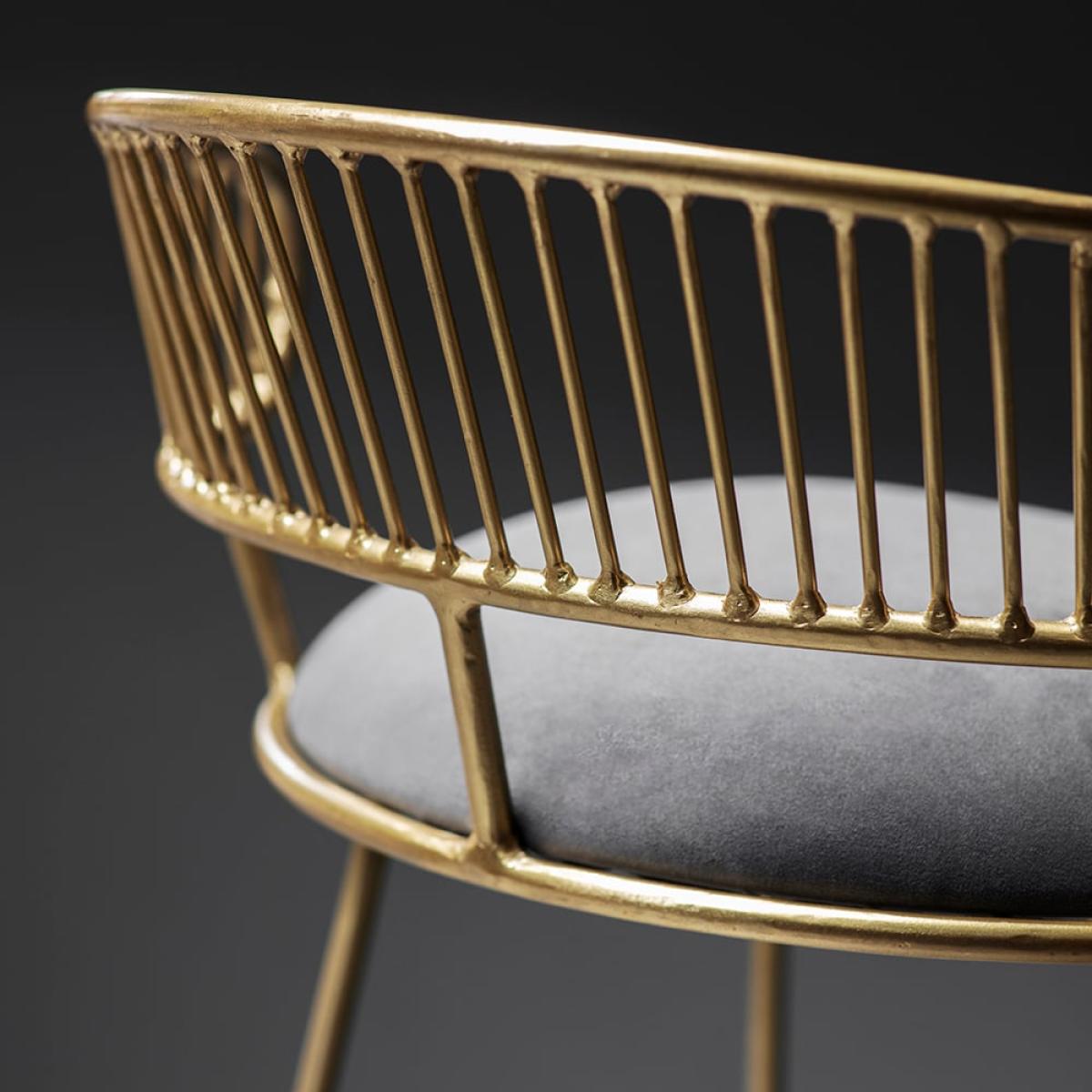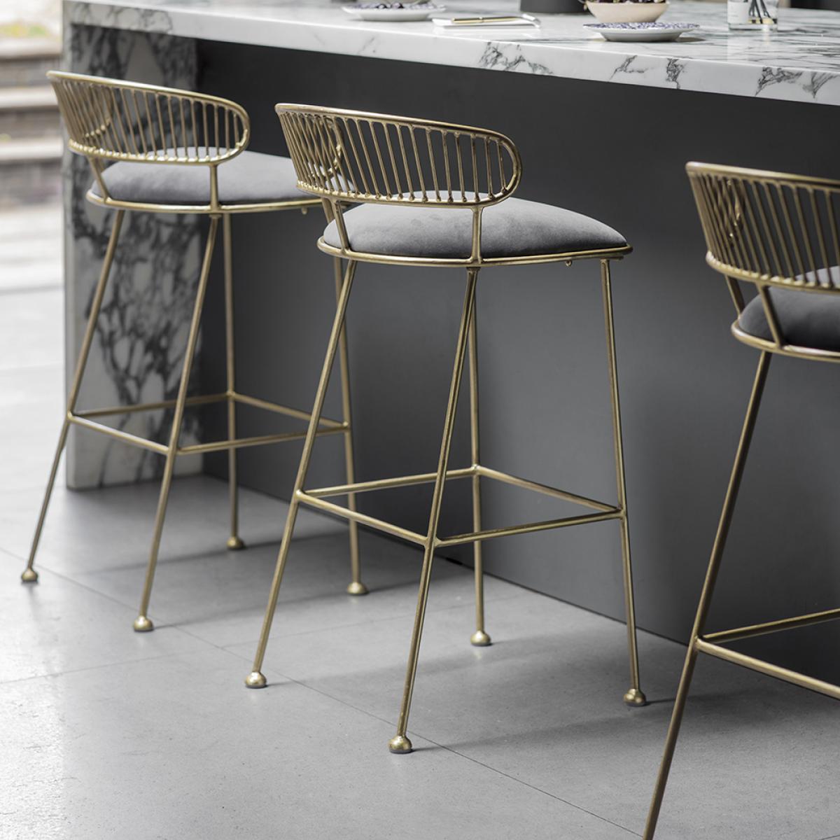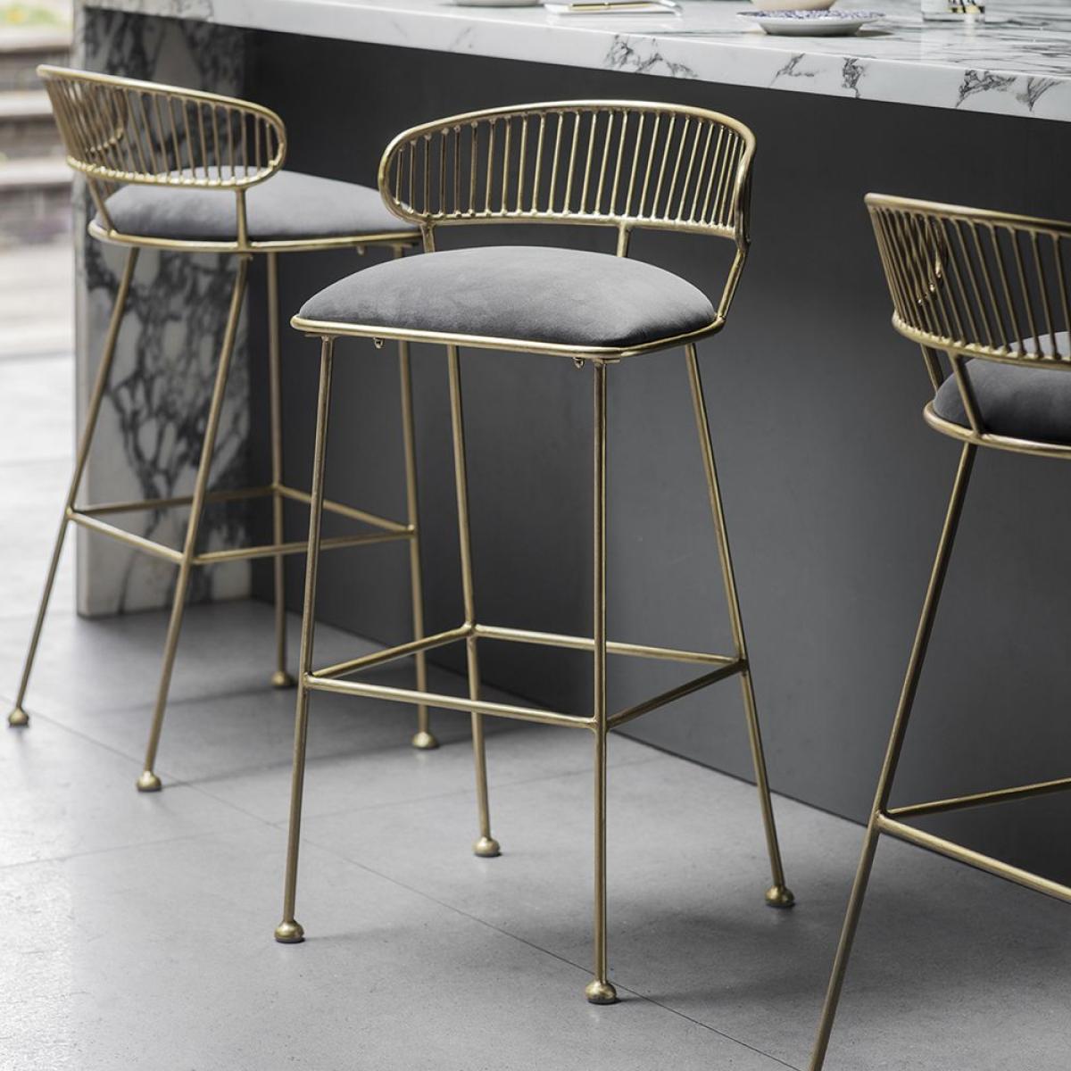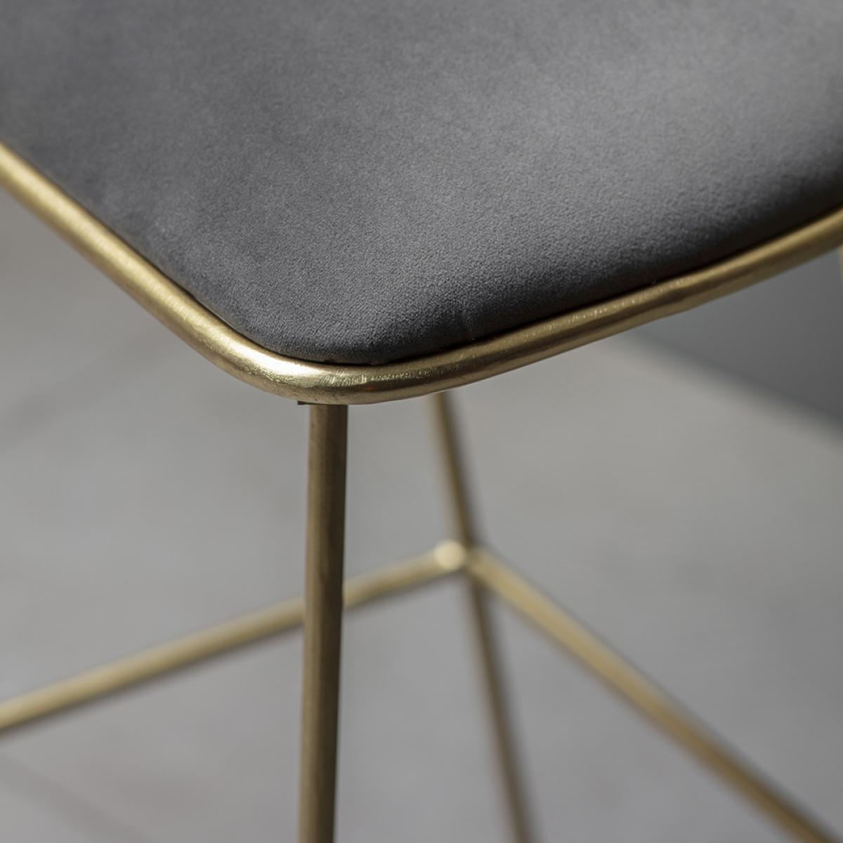 An elegant metal and upholstered barstool perfect for kitchen islands and breakfast bars, our Ella Metal Barstool in Grey Velvet combines an ultra-comfortable seat pad upholstered in soft and luxurious cotton velvet with a curved wire back and refined brass legs. Inspired by the glitz and glamour of the art deco era, this velvet barstool with metal backrest will complement any kitchen room scheme or decadent bar area. Made of iron plated in brass for a luxurious finish, this bar stool is super strong. Perfect on its own or as a set of two or three depending on how big your kitchen island is.