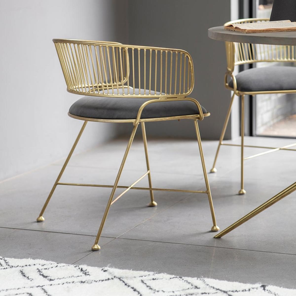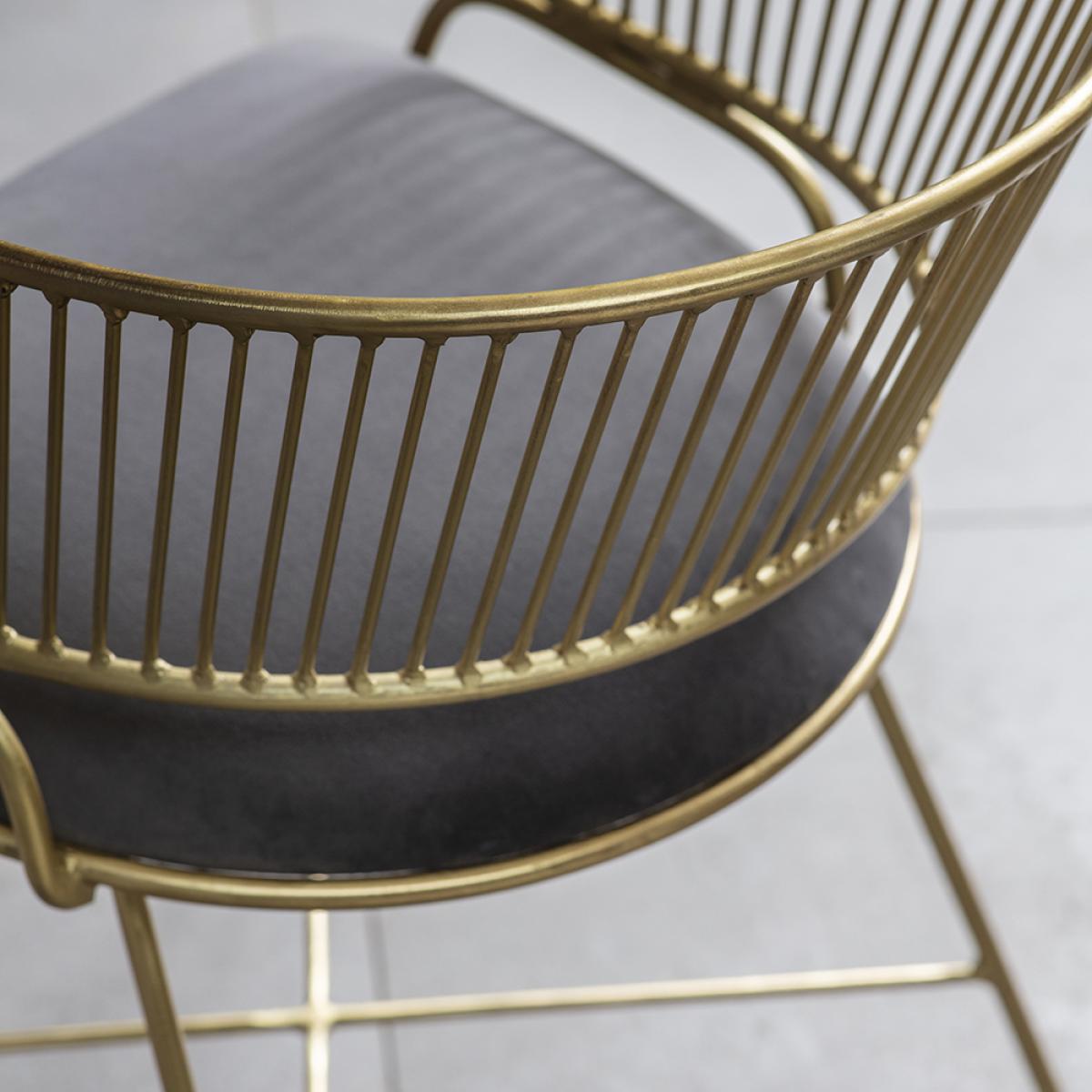 An elegant metal and upholstered dining chair perfect for pairing with any of our exquisite dining table collections, our Ella Metal Dining Chair in Grey Velvet combines an ultra-comfortable seat pad upholstered in soft and luxurious cotton velvet with a curved wire back and refined brass legs. Our Brass Ella dining chair is perfect on its own as an occasional chair for a desk or a dressing table, or as a comfortable dining chair. Inspired by the glitz and glamour of the art deco era, this velvet dining chair with metal backrest will complement both contemporary and more traditional room schemes while its medium-soft grey seat pad is extra comfy for long, lingering lunches and dinners.