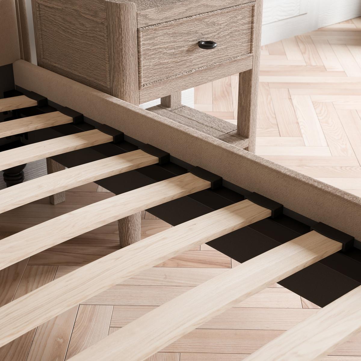 This bed frame is unique, stylish and practical. The sprung slatted base provides additional support for your mattress for added comfort and carefree nights of sleep.