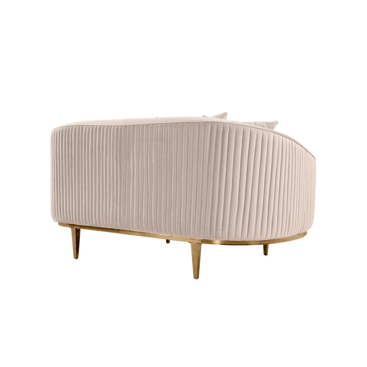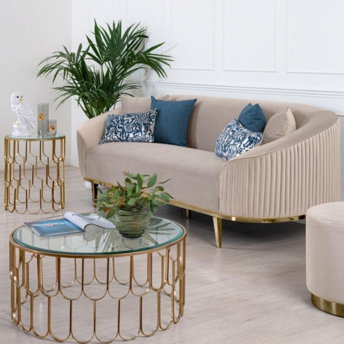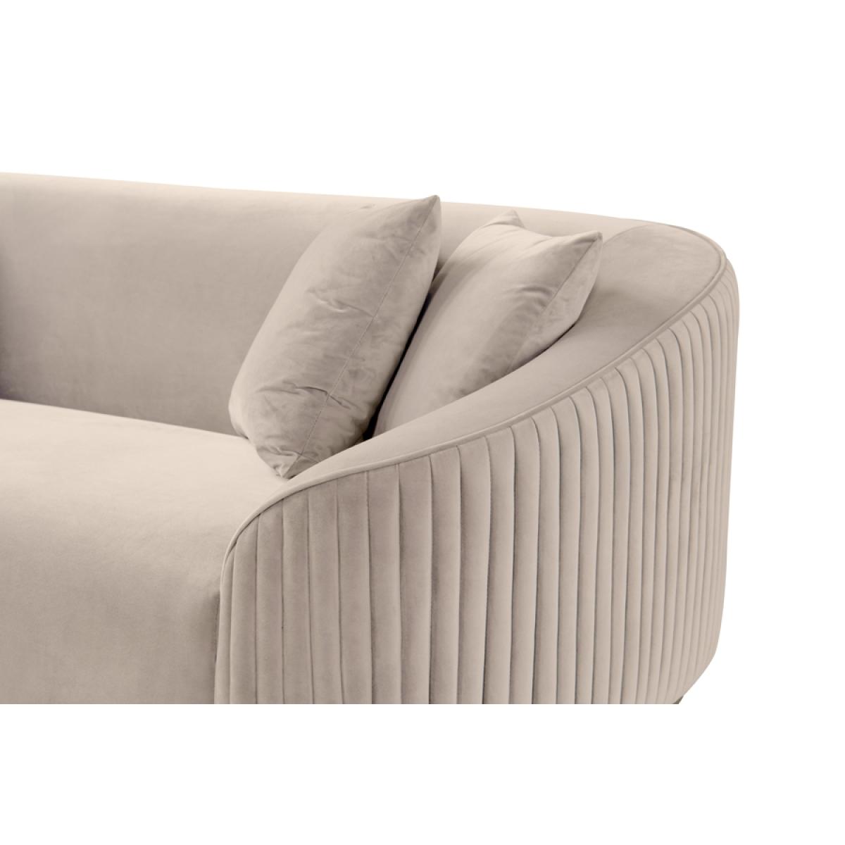 Statement sofa inspired by glamorous American Art Deco interiors. Sprung base and backrest with comfortable deep foam and fibre filling. Feather-filled scatter cushions. Brushed stainless steel base with brass finish. Fluted upholstery to sides and back. Detachable legs. Velvet fabric. Free returns on sofas if you change your mind within 7 days. Simply notify us, put the sofa back in the box, and we will collect it and send you a full refund. (This offer excludes Scottish highlands and islands & any Ireland addresses).