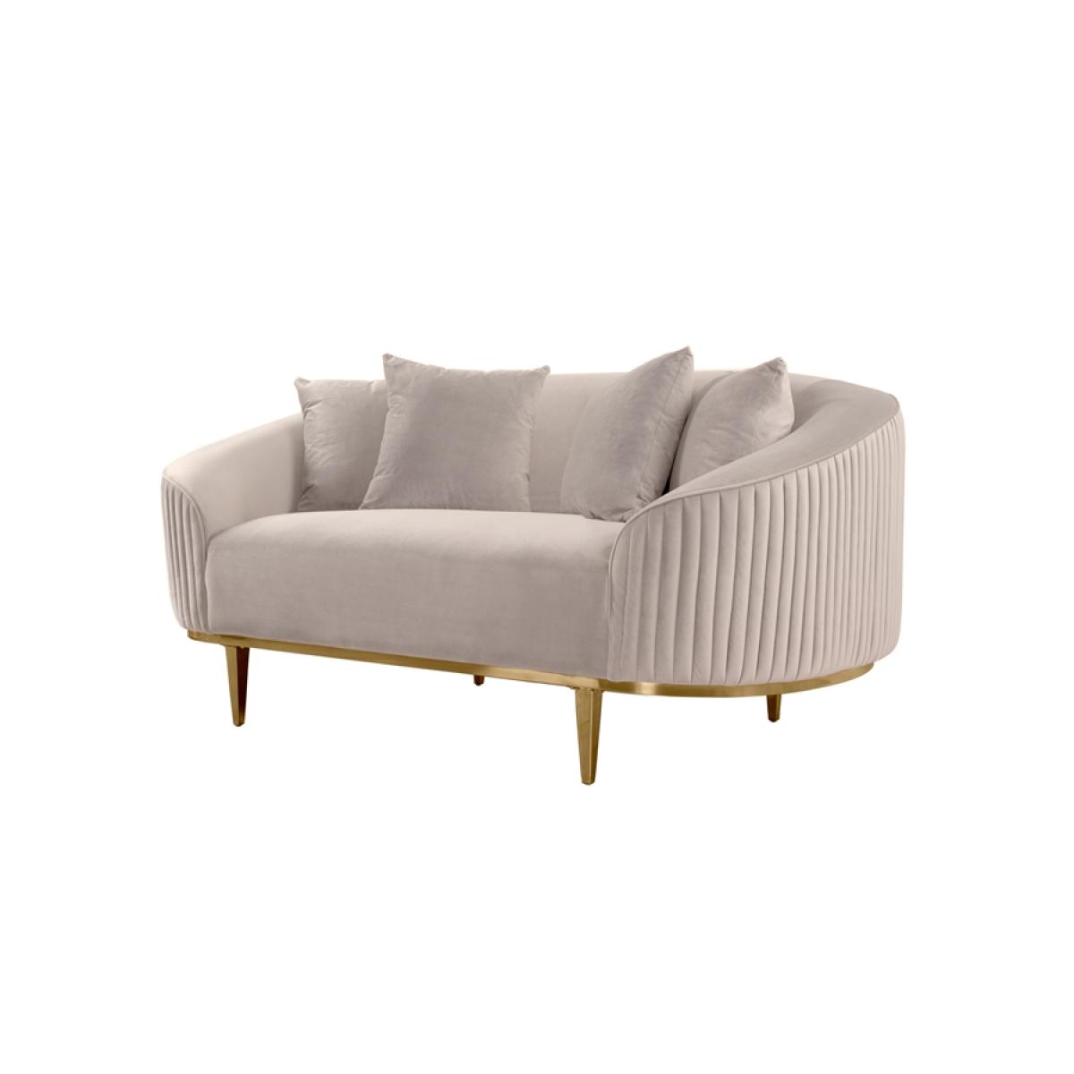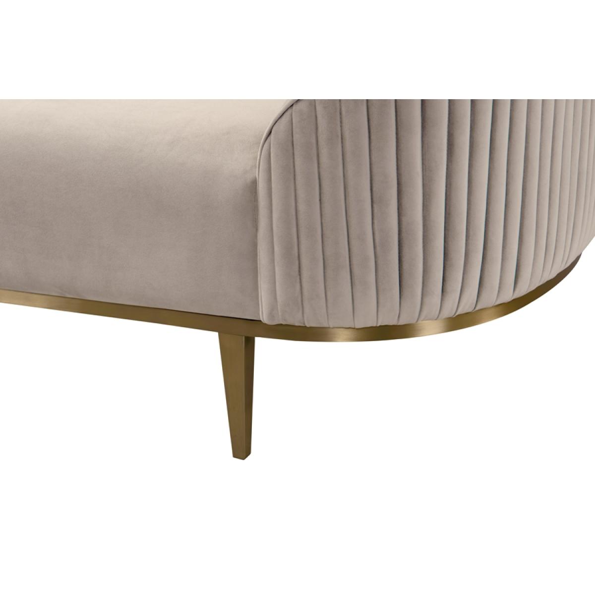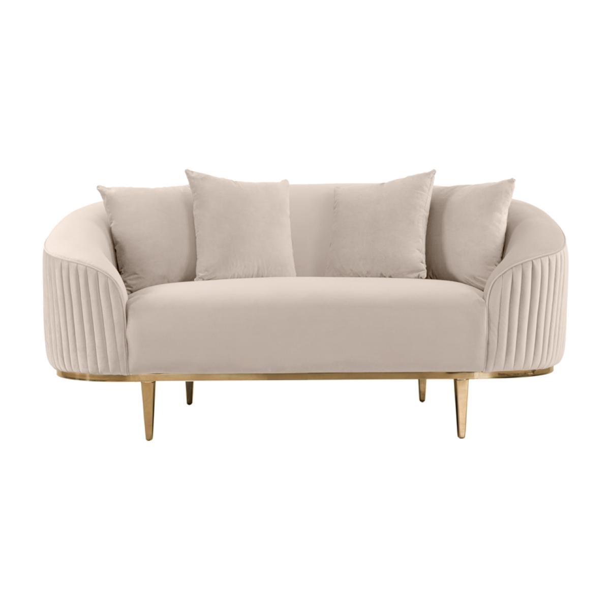 Statement sofa inspired by glamorous American Art Deco interiors. Sprung base and backrest with comfortable deep foam and fibre filling. Feather-filled scatter cushions. Brushed stainless steel base with brass finish. Fluted upholstery to sides and back. Detachable legs. Velvet fabric. Free returns on sofas if you change your mind within 7 days. Simply notify us, put the sofa back in the box, and we will collect it and send you a full refund. (This offer excludes Scottish highlands and islands & any Ireland addresses).