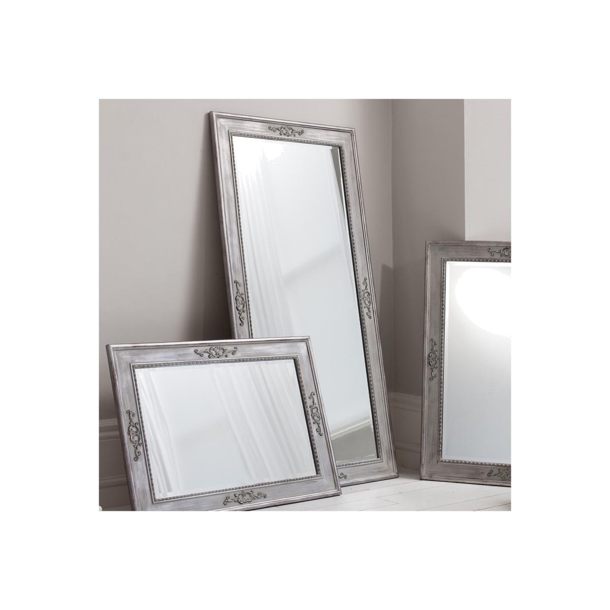 DIMENSIONS. H165 x W79cm FEATURES. Beautifully traditional looking mirror with a pretty frame decoration in a satin vintage French grey finish. Hint of vintage styling. Large mirror perfect for floor standing. Perfect for the living room dining room bedroom or hall..