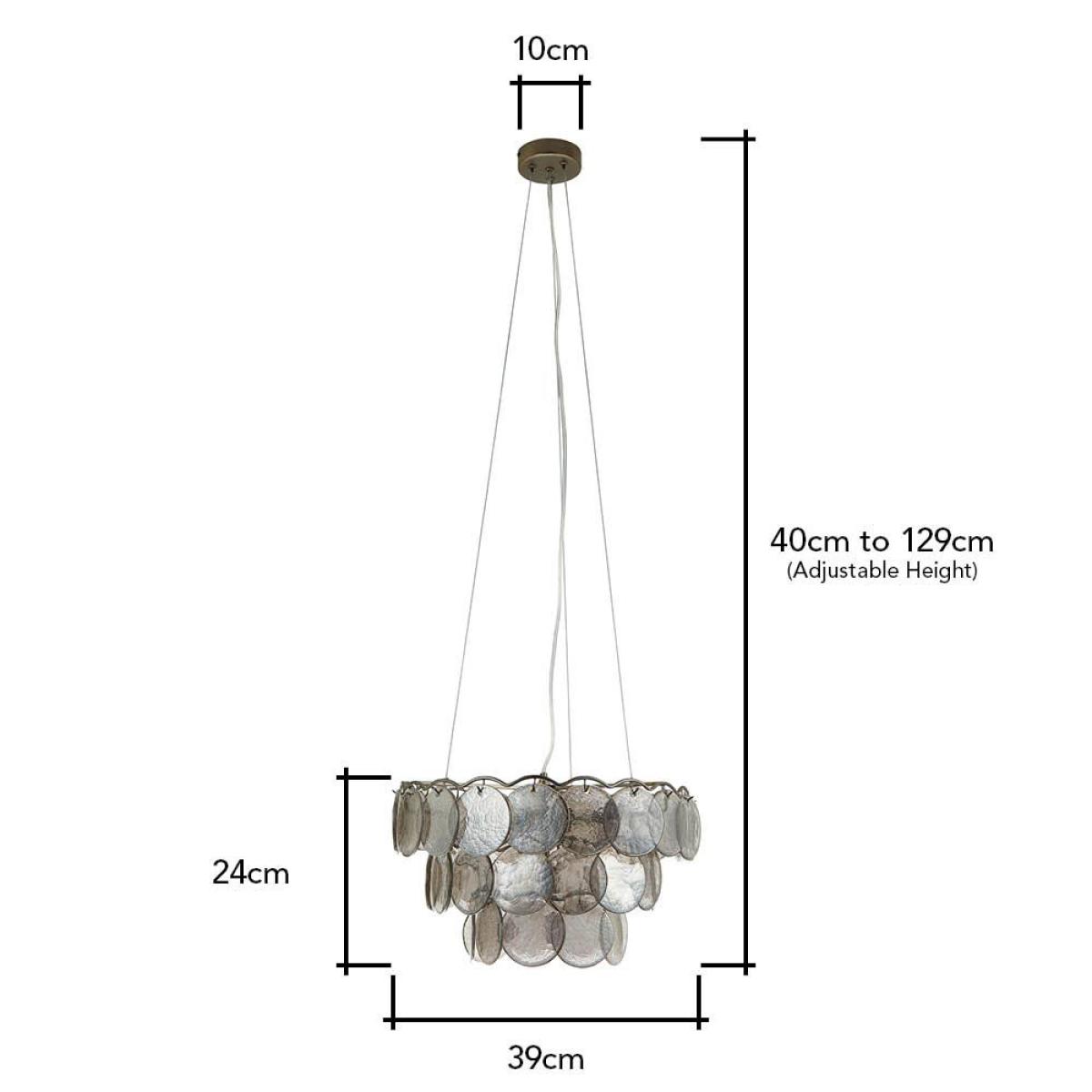Give a sophisticated modern style to any home with the gorgeous Ellie Glass Disc 3 Tier Chandelier. This elegant suspended ceiling light fitting is perfect as the centrepiece of any décor, with decorative smoked glass discs suspended on a chrome frame allowing the light to glow through with a warm ambiance.