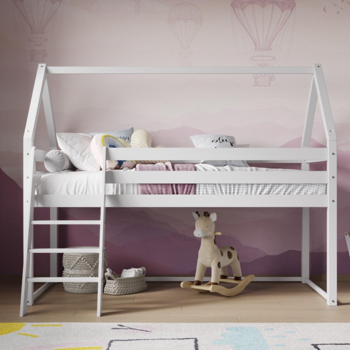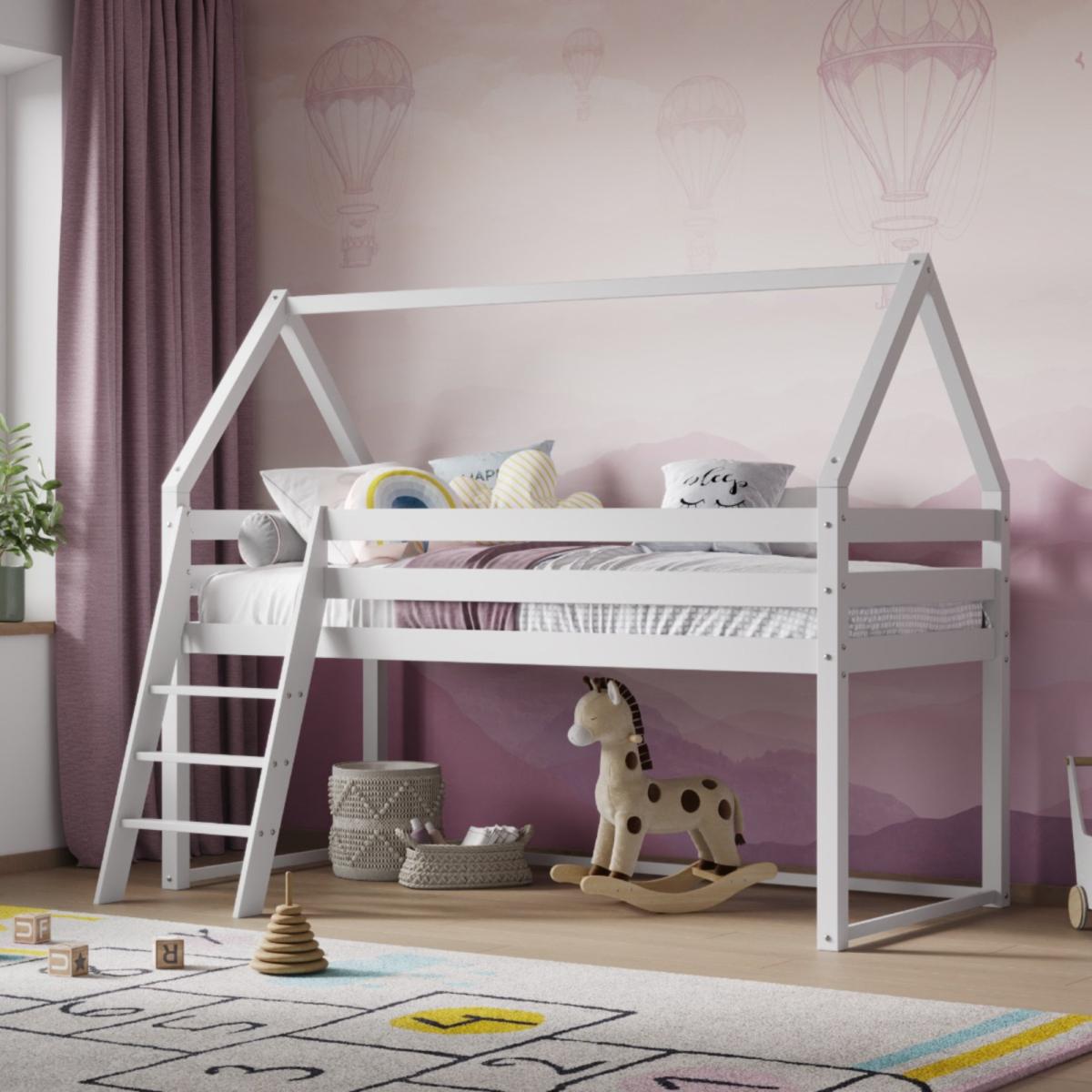 I love how this house-style mid-sleeper keeps things light and airy - its clean white frame slots straight into Scandi, modern or soft-pastel schemes. The roof silhouette adds instant character without overwhelming a small room, while the raised platform frees up space underneath for storage baskets, a cosy reading nook or a play area. For styling, layer in natural-fibre rugs and a couple of textured cushions on the mattress, then drape a string of warm LED lights along the roofline. Keep under-bed storage tidied with woven bins or labelled wooden crates, and finish with a simple wall shelf or low-level gallery rail nearby to display books and toys.
