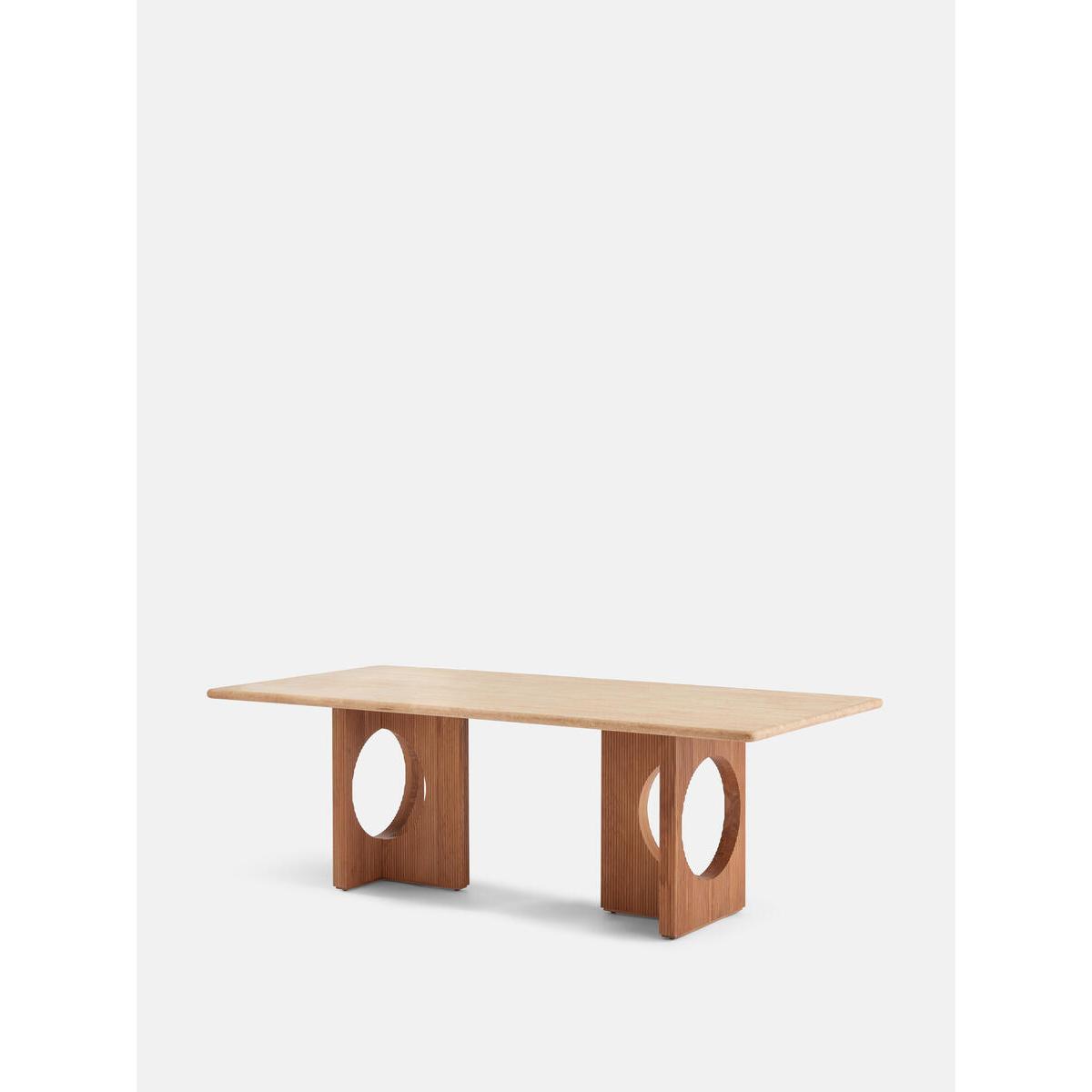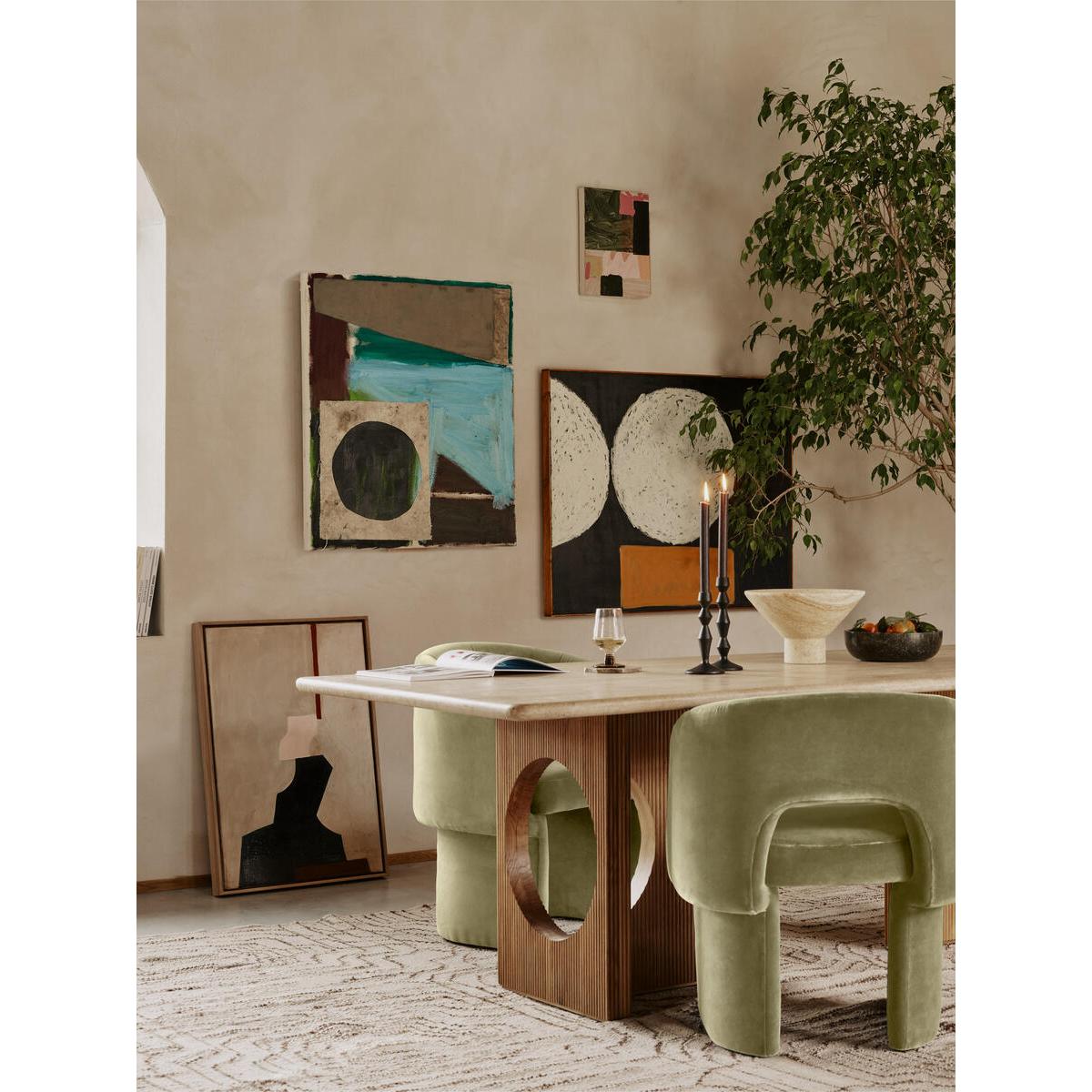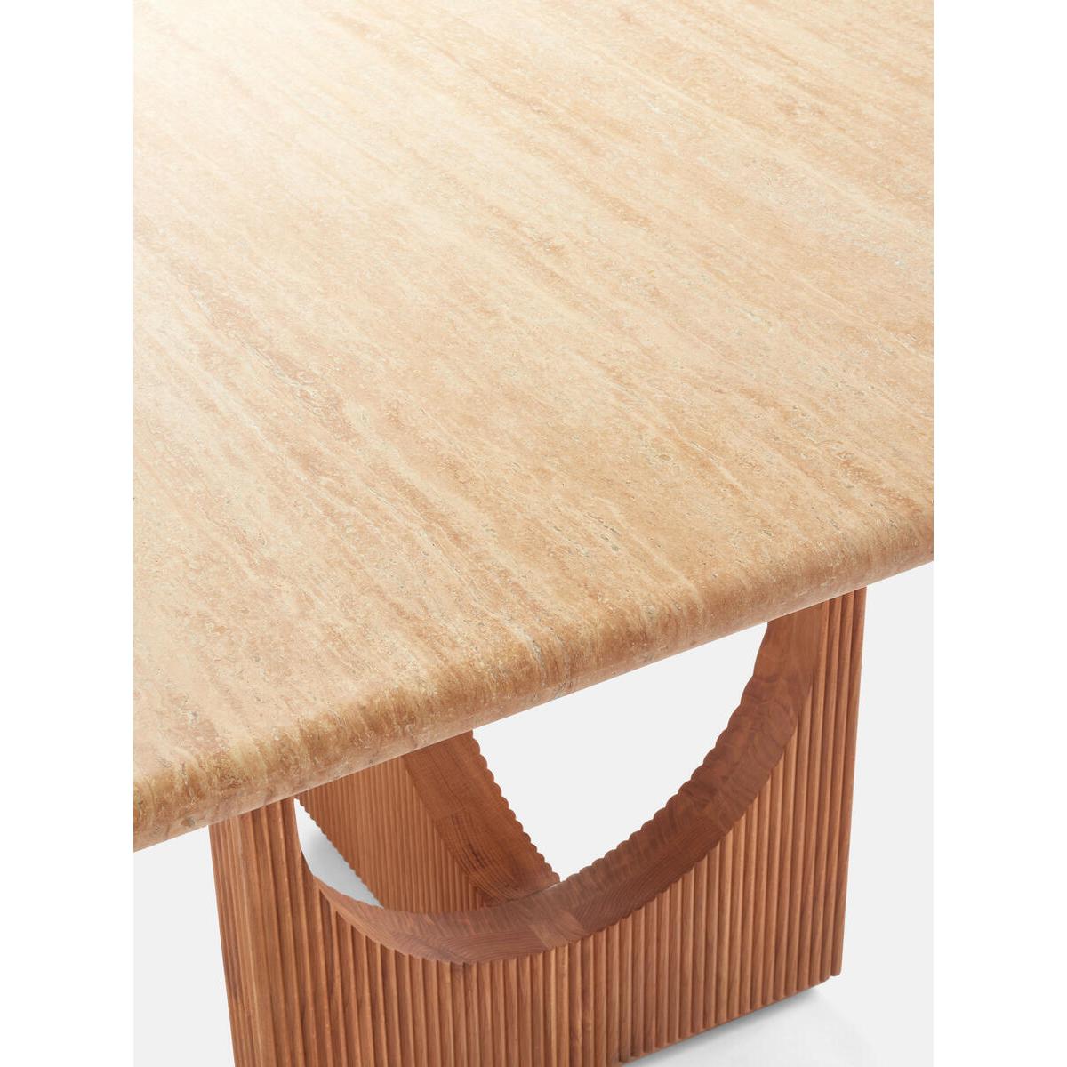 I love this table for its clean, contemporary look that balances natural textures with modern design. The Travertine top adds warmth and subtle patterning, making it versatile enough to suit both minimalist and more eclectic interiors. It works particularly well in neutral, earthy colour schemes, but can also act as a statement piece against darker or bolder backgrounds. Practical styling tips include pairing it with sleek, understated chairs for a streamlined look or adding textured textiles and ceramics to enhance its tactile appeal. Because of its timeless appeal, it's equally suited to both open-plan kitchens and more formal dining rooms. Just keep in mind that the Travertine surface can be delicate, so using coasters and avoiding sharp objects will help maintain its beauty over time.