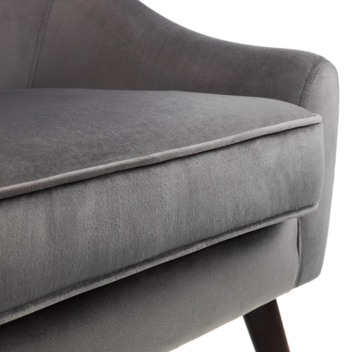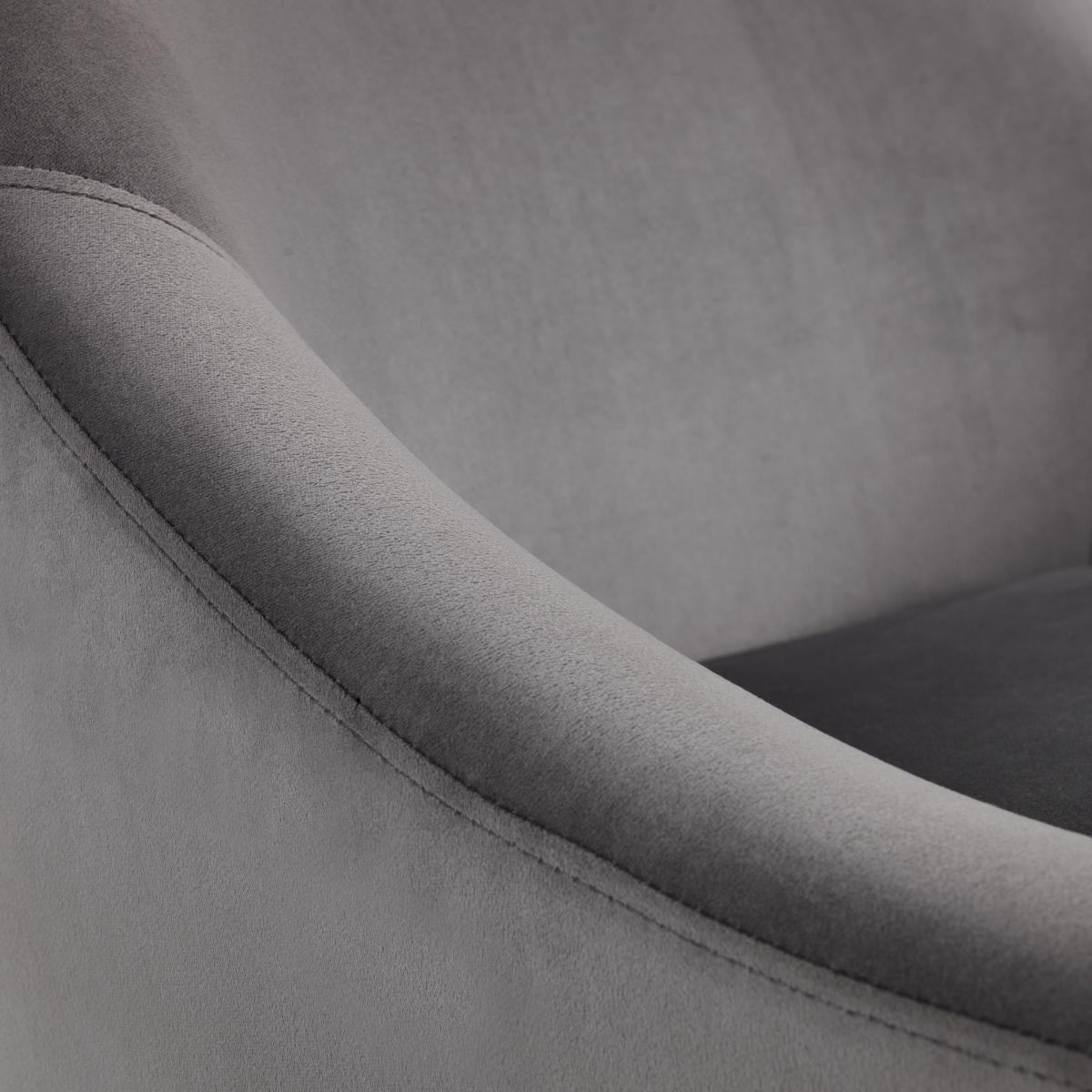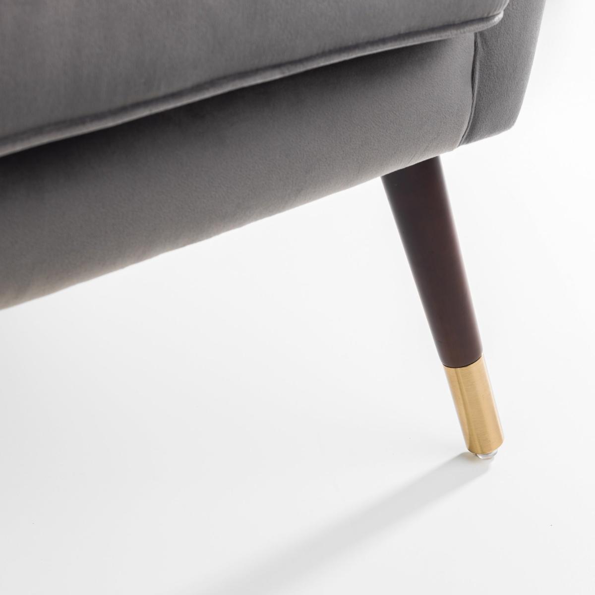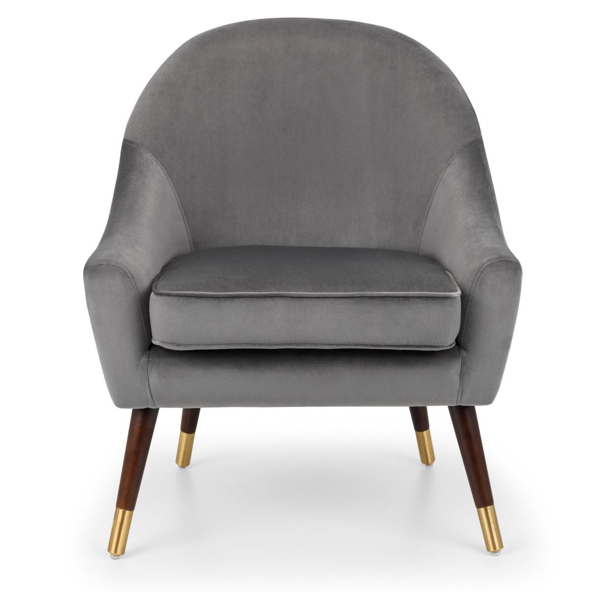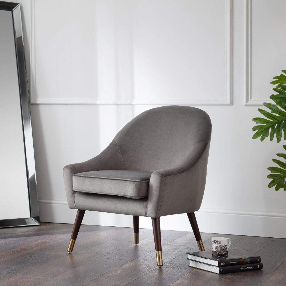 * Chic velvet upholstery* Oak legs with gold detailing* Curved arms and back With its gracefully curved arms and back upholstered in chic grey velvet, this armchair exudes sophistication and elegance, adding a touch of timeless charm to any space. This armchair features oak legs tipped with timeless gold accents, elevating its aesthetic appeal and ensuring durability. Whether placed in a living room, bedroom, or study, this chair is sure to enhance the ambiance of any room while providing exceptional comfort.