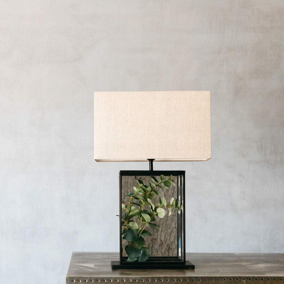 The Elliot wide mirror table lamp with natural shade will bring space and depth to your interior. The glass doors encase a mirror, whilst also providing a terrarium inspired place where botanicals could be displayed. The black metal work contrasts against the natural rectangular shade that is included with this lamp. A contemporary lighting option for a range of interior settings. Total: H60 x W40 x D16cm. Base: H44. 5cm x W30. 5 x D16cm. Requires 1 x E27 Max 60W (not included). Lamp shade is included. Prop inside not included. Shot with one of our faux flowers inside.