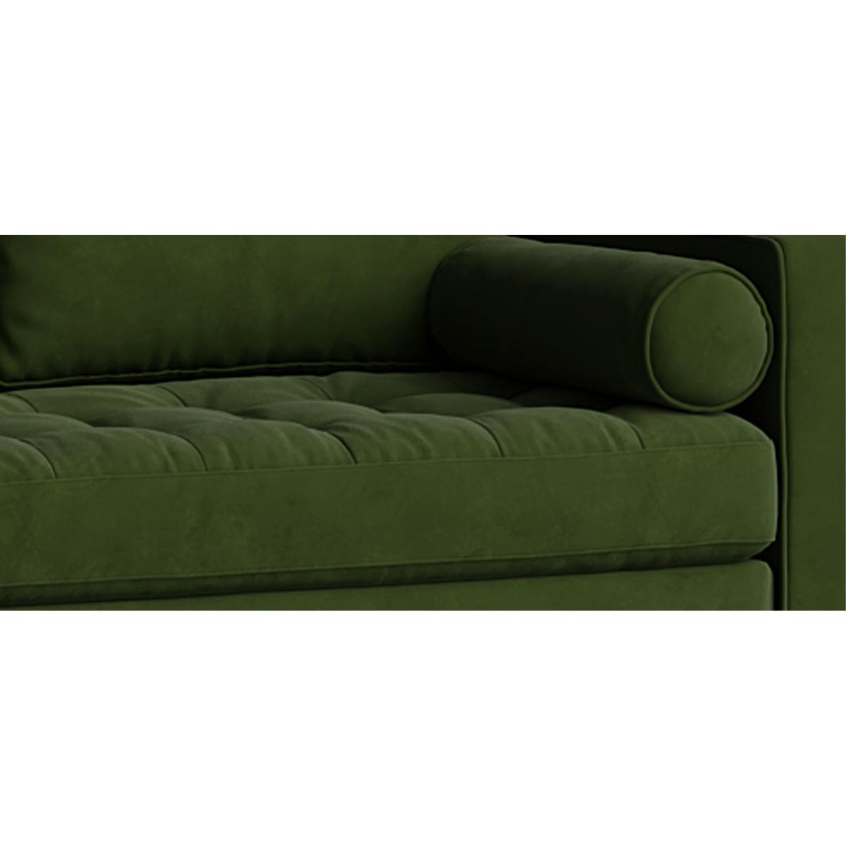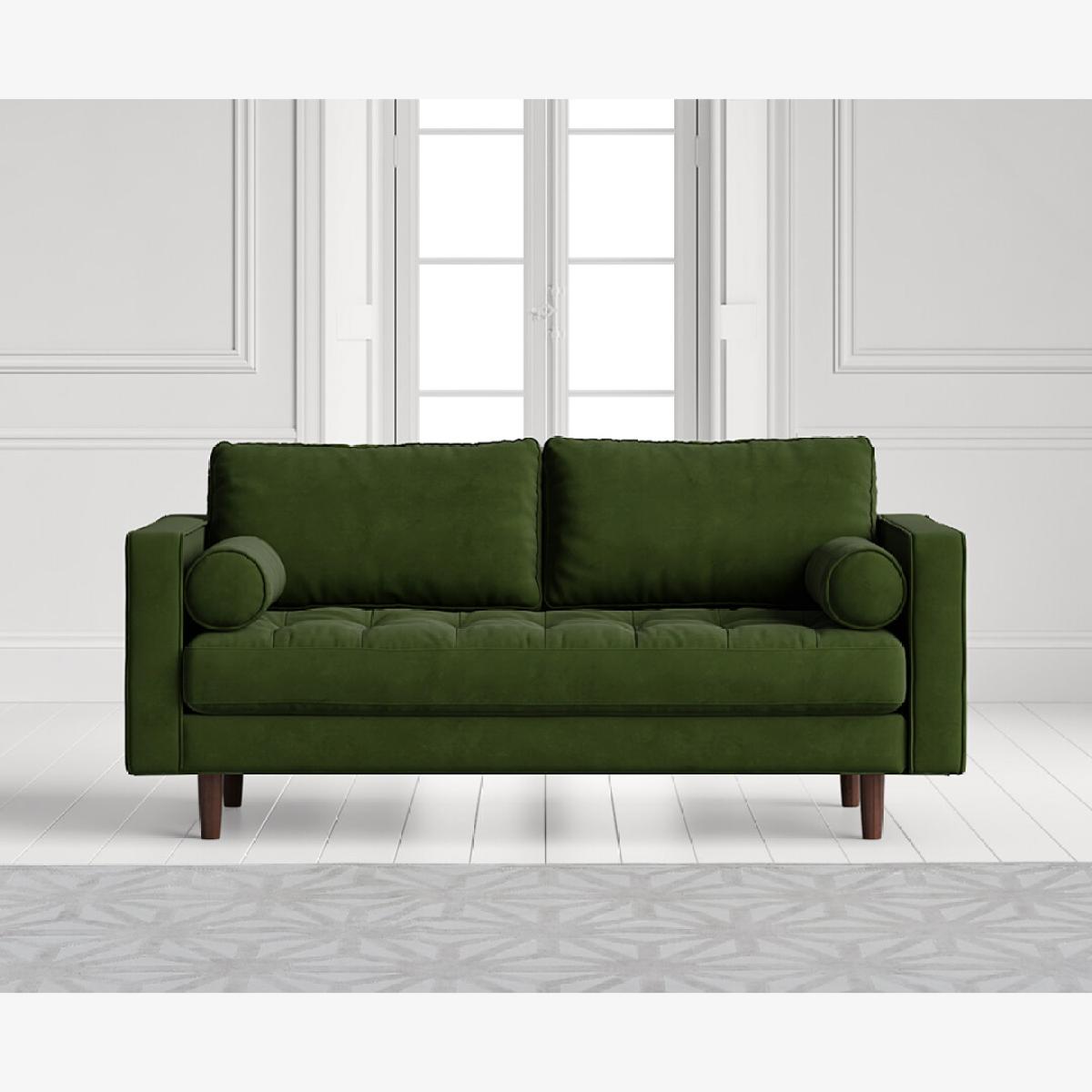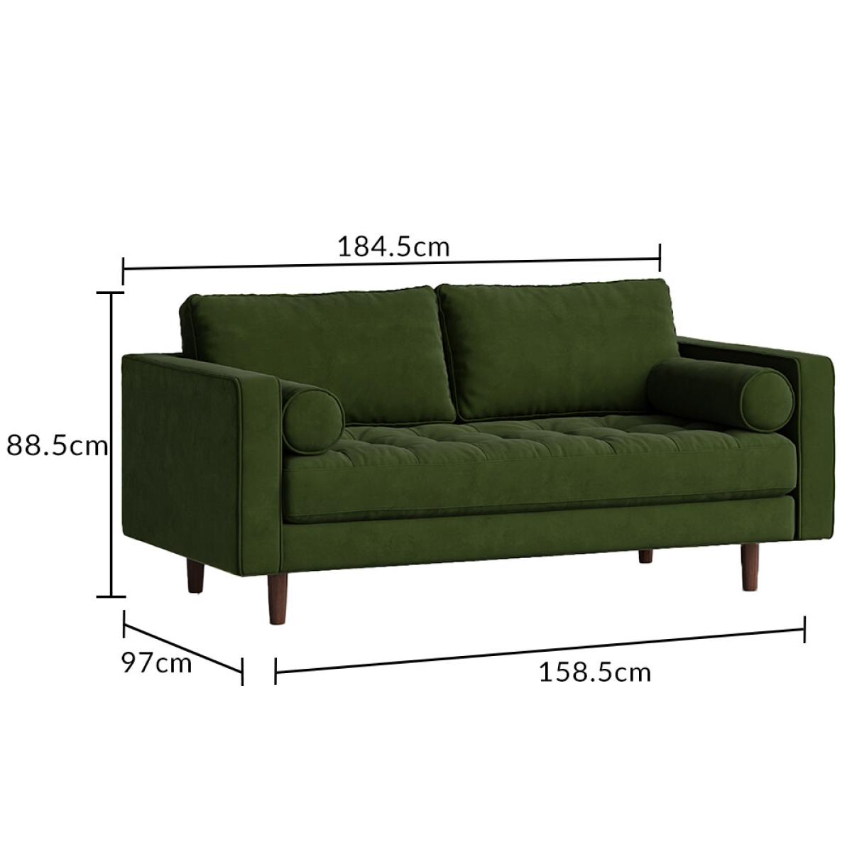The Elliott Green Velvet Two Seater Sofa features soft green velvet with a stylish stitched design and is complete with sturdy dark solid wood feet.