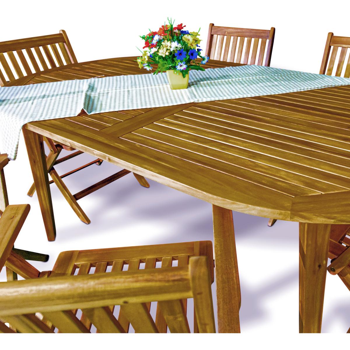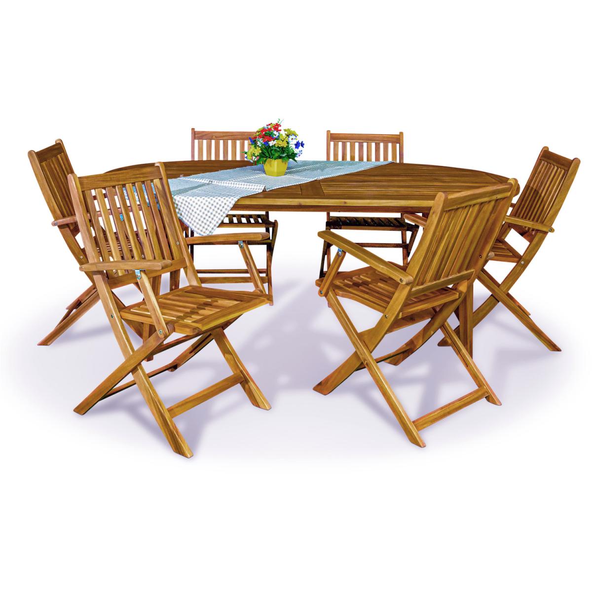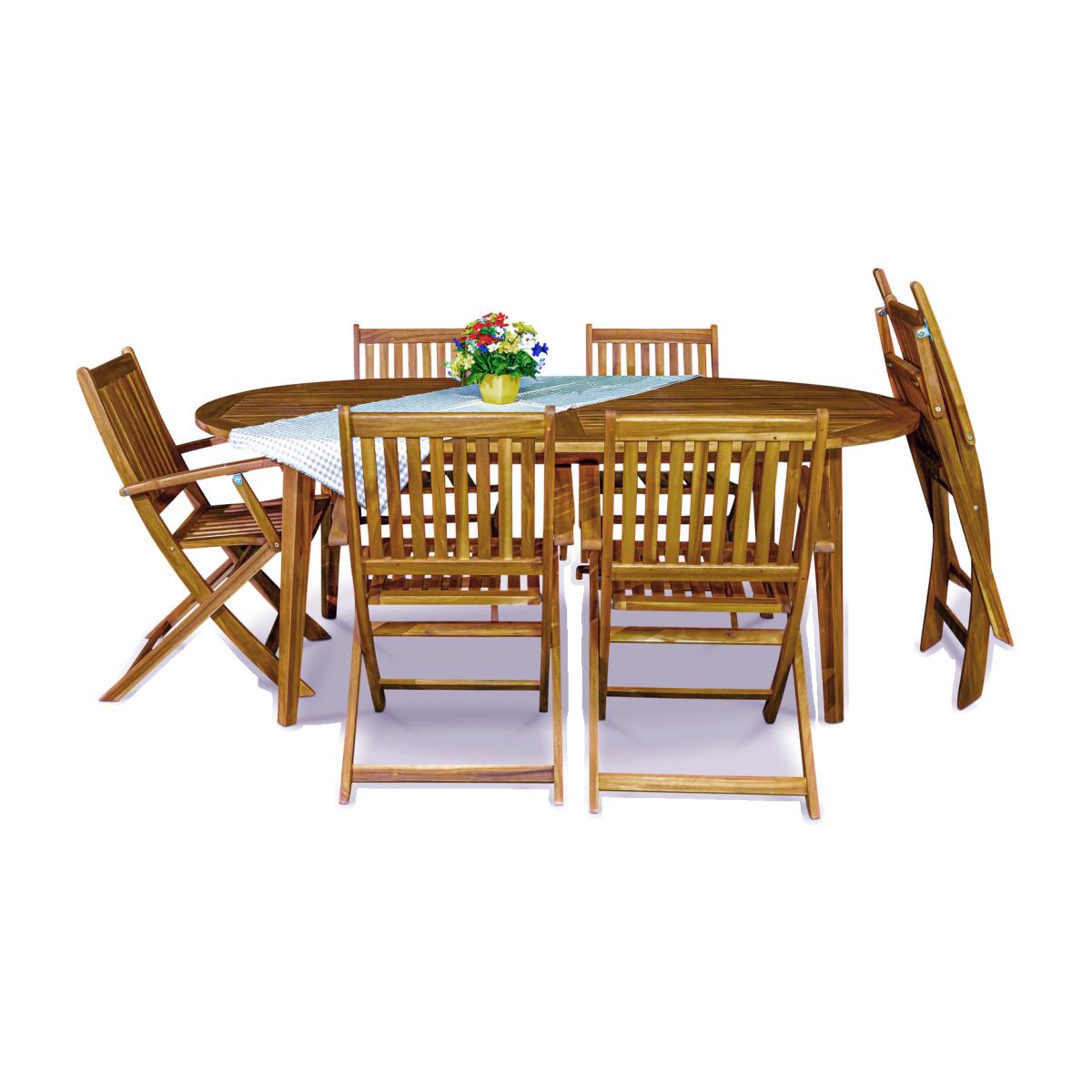 This ELIPSE 6 Seater Dining Set with 6 Folding Armchairs Chairs will add timeless style to any outdoor space at an affordable price. Consisting of 195cm x 105cm ellipse folding table and 6 Manhattan folding armchairs it is perfect for folding away for easy storage. The Acacia hardwood is perfect for creating high-quality furniture due to its warm tones and natural beauty. The acacia tree grows very slowly which makes the wood incredibly hard and durable allowing the furniture to be used for many years.