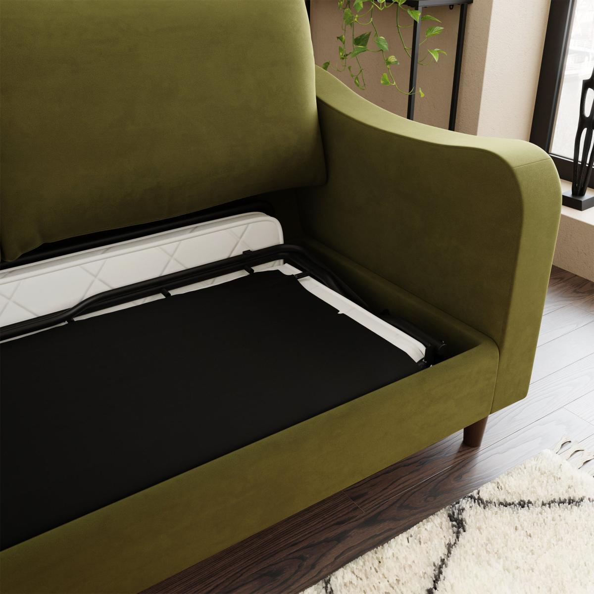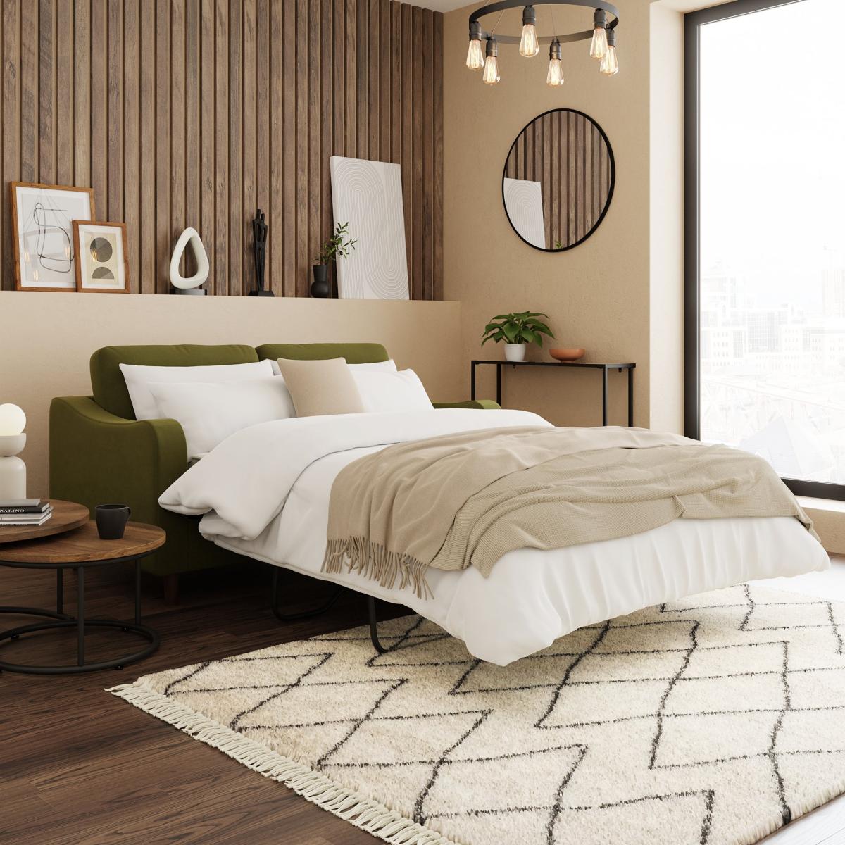 I love this green velvet sofa bed for its versatility and rich colour, which works well in both contemporary and eclectic interiors. It’s a great choice for smaller spaces given its dual purpose, making it ideal for guest rooms or multifunctional living areas. Pair it with neutral tones and textured accessories, like a chunky knit throw or geometric cushions, to add cosy layers and visual interest. For styling tips, consider placing it against patterned wallpaper or a statement wall to make it pop, and keep the surrounding decor minimal to let the sofa bed be the focal point. Its plush velvet finish adds a touch of luxe that instantly elevates any room.