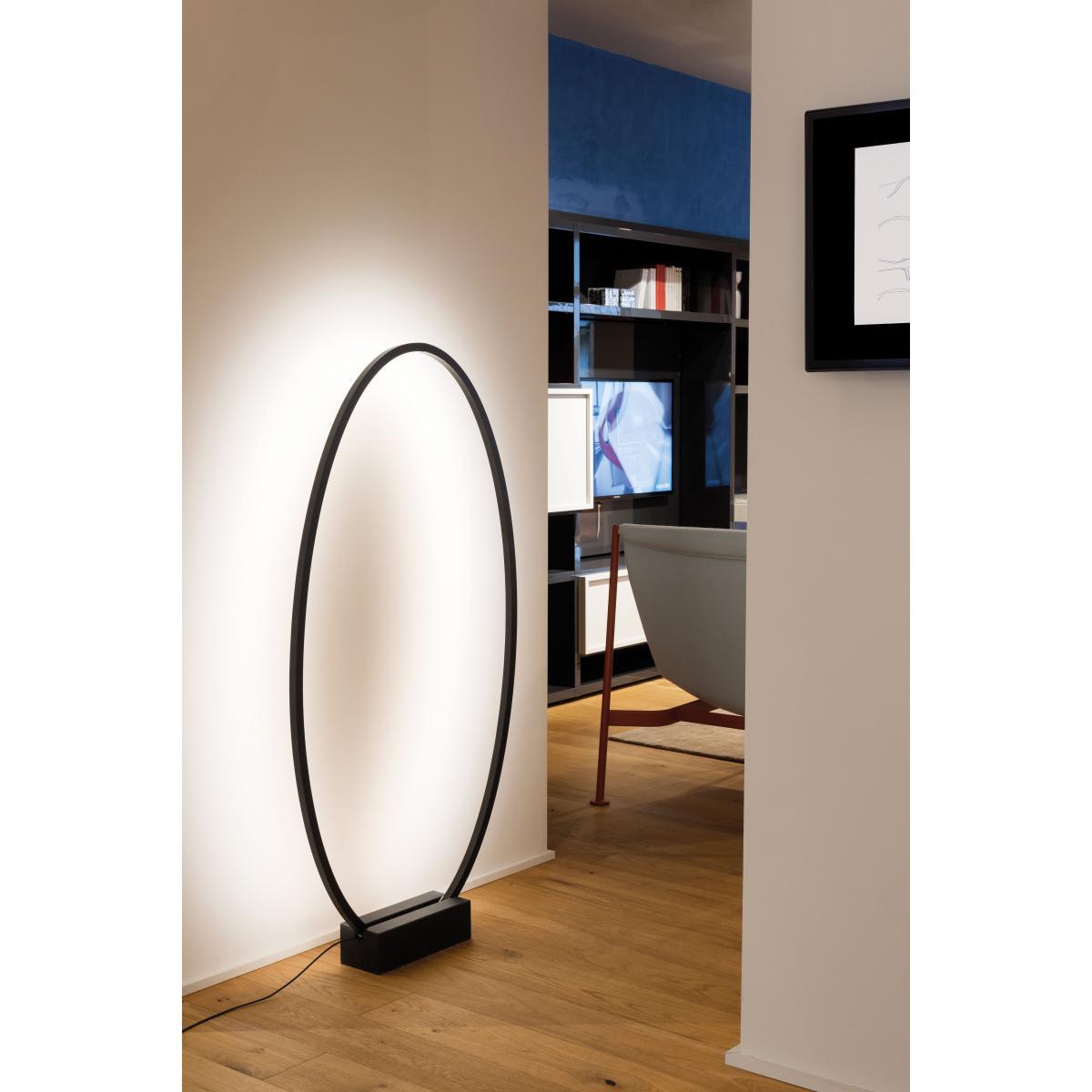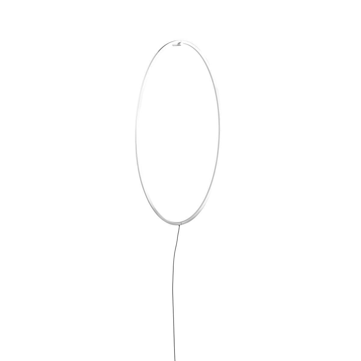 This light ring is used with two accessories sold separately: either a wall hook to hang the ring from a wall (like a wall lamp), or a marble base to put the ring on the floor (like a standing lamp). This ring comes with a cable (L 500 cm) to connect to the mains. A magnificent light sculpture, the Ellisse lamp has a simple, pure and very graphic shape. The large oval ring creates a frame in the air, delimiting an empty space and filling it with light. This ultra-minimalist open extruded aluminium structure is like a trace in space, a pencil line drawn in the air, a three-dimensional sign. Ellipse highlights the essential: namely, light, which becomes the central player in the aesthetics of the lamp. The void fills with a luminous substance that radiates all around, without revealing the light source. The poetry of this emptiness inevitably makes us think of its opposite: the materiality of the world. The LED strip runs for the entire circumference of the ring. The opaline polycarbonate diffuser is located on one of the side faces of the ring. A dimmer on the cable lets you choose the light intensity: sustained lighting for reading, or mood lighting.