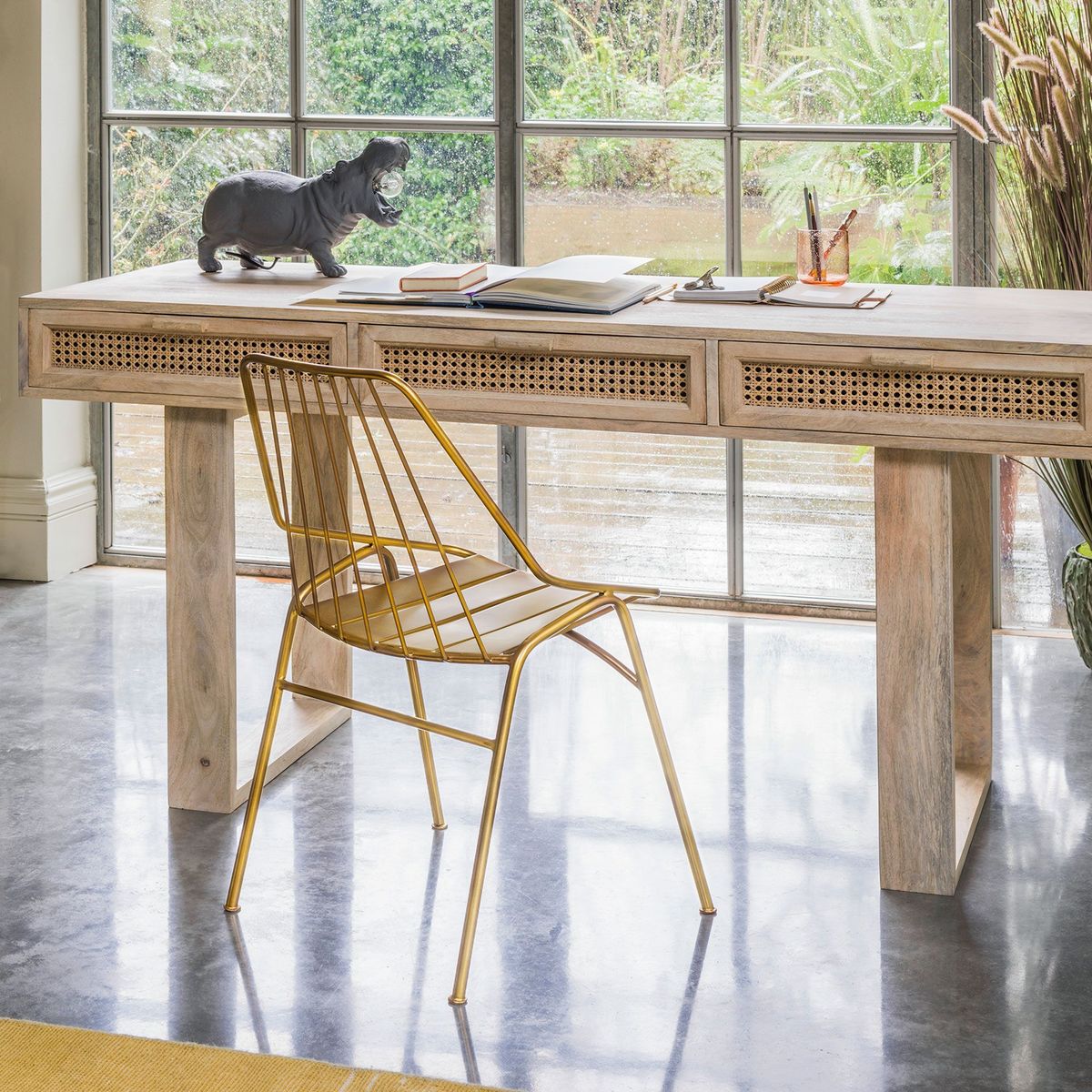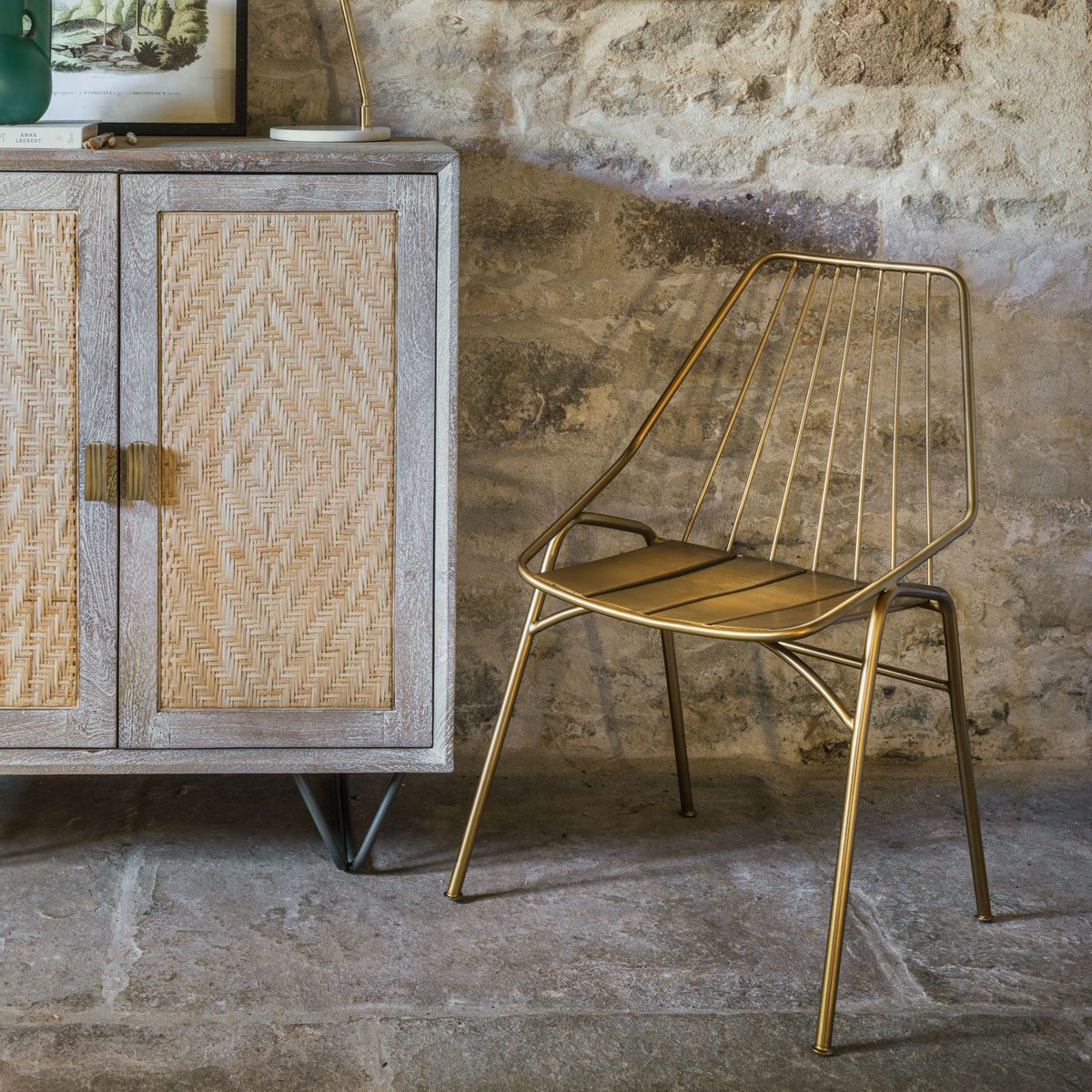 A glamorous twist on a scandi-inspired chair that features a simplistic silhouette and wire detailing. Create texture by adding cosy sheepskins to this piece.