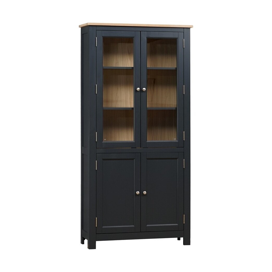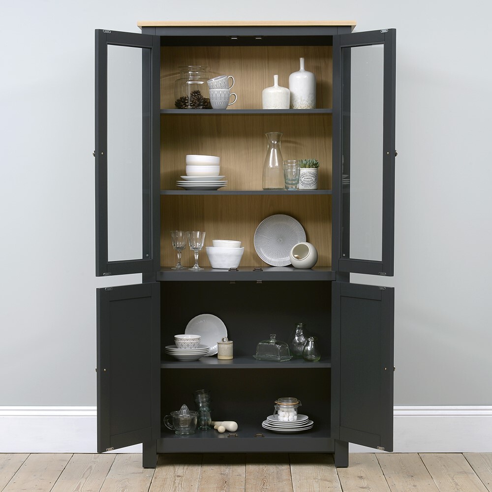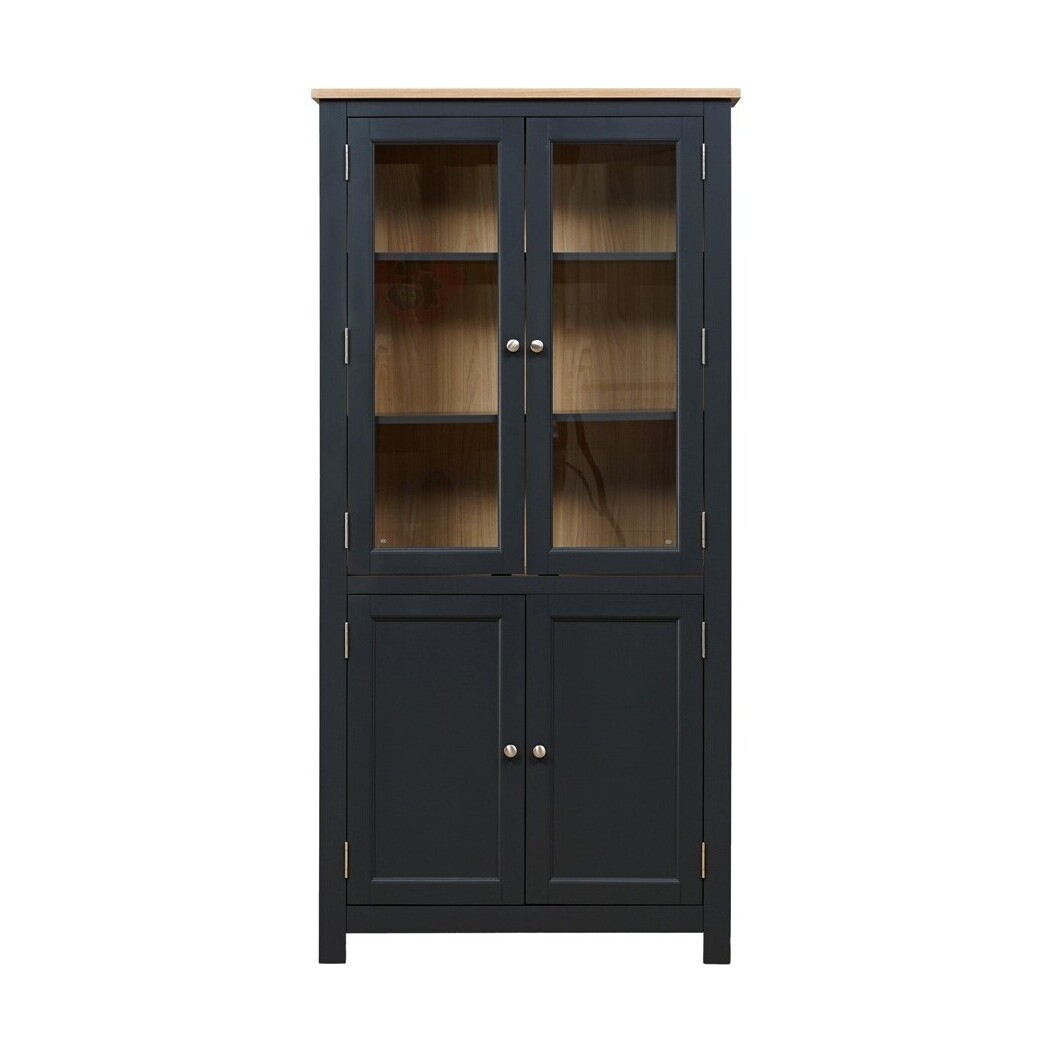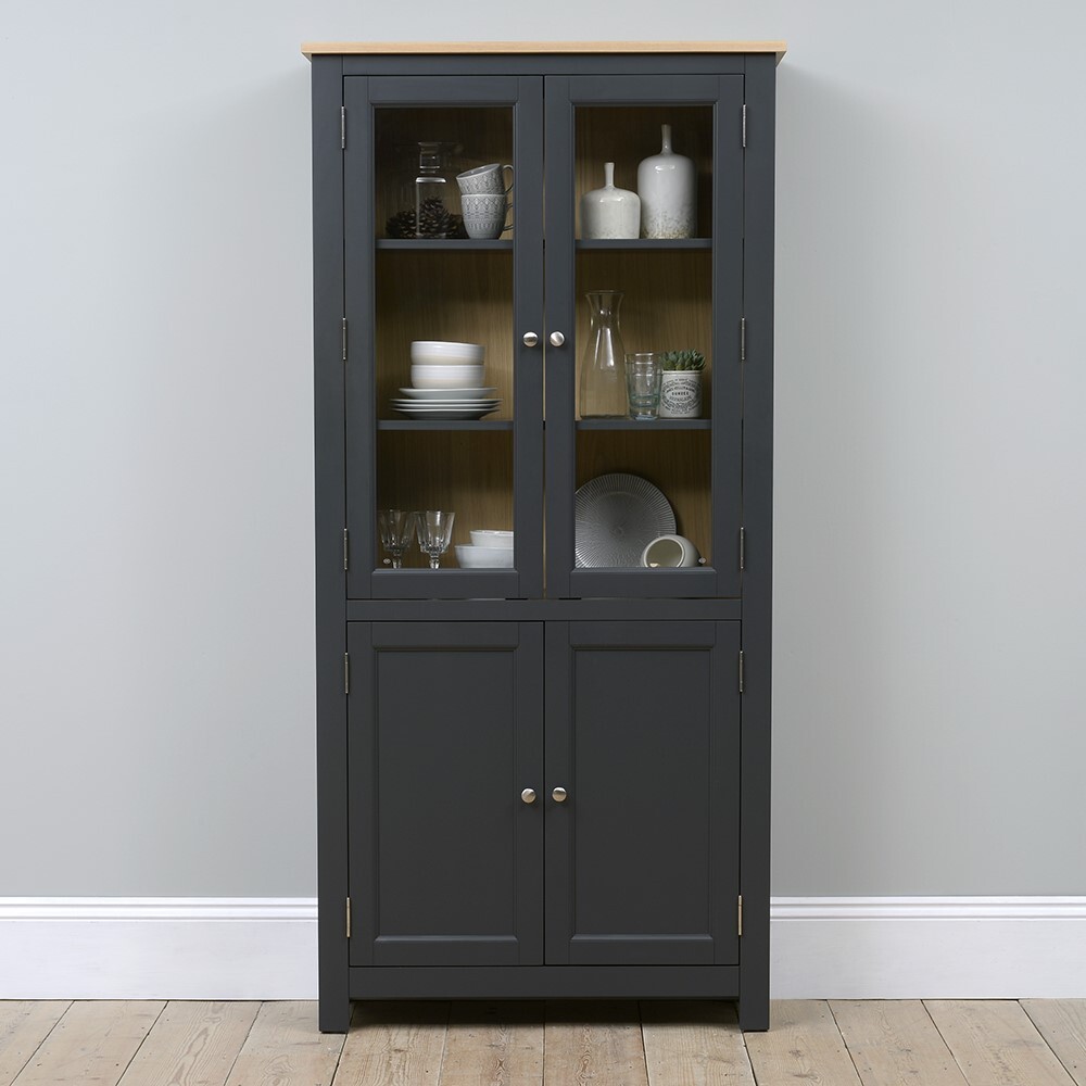 Offering modern country elegance and ideal for showing off your best china, glasses or collectables. It has a sophisticated grey painted frame (suggested colour match Farrow & Ball No.31 Railings), with sturdy shelves behind glazed double doors, and a double cupboard for items you don't want on show. Simple brushed metal knobs add stylish detail, while the white wash wooden top adds interest and contrasts beautifully with the painted body. This beautifully made glazed unit will make a lovely focal point in a living room, dining room or on a landing.