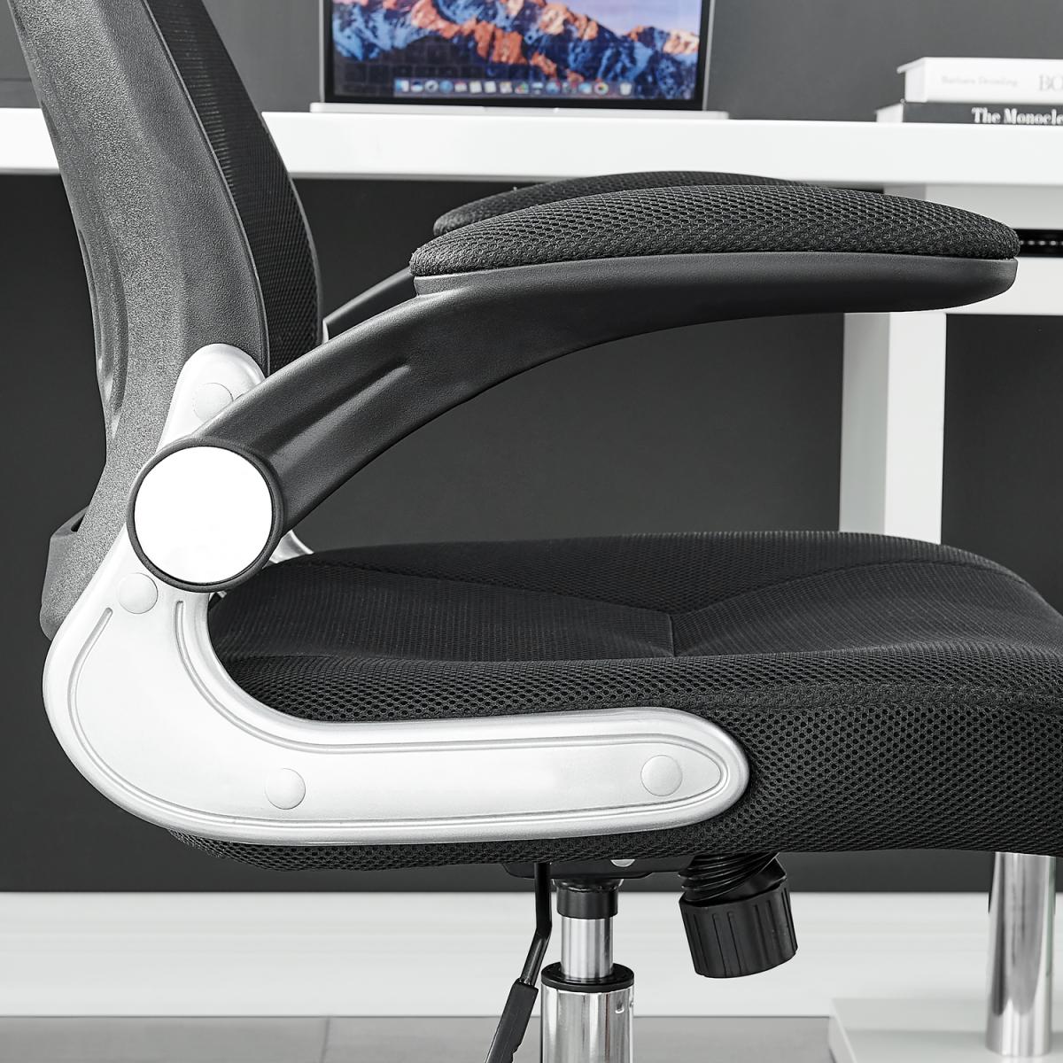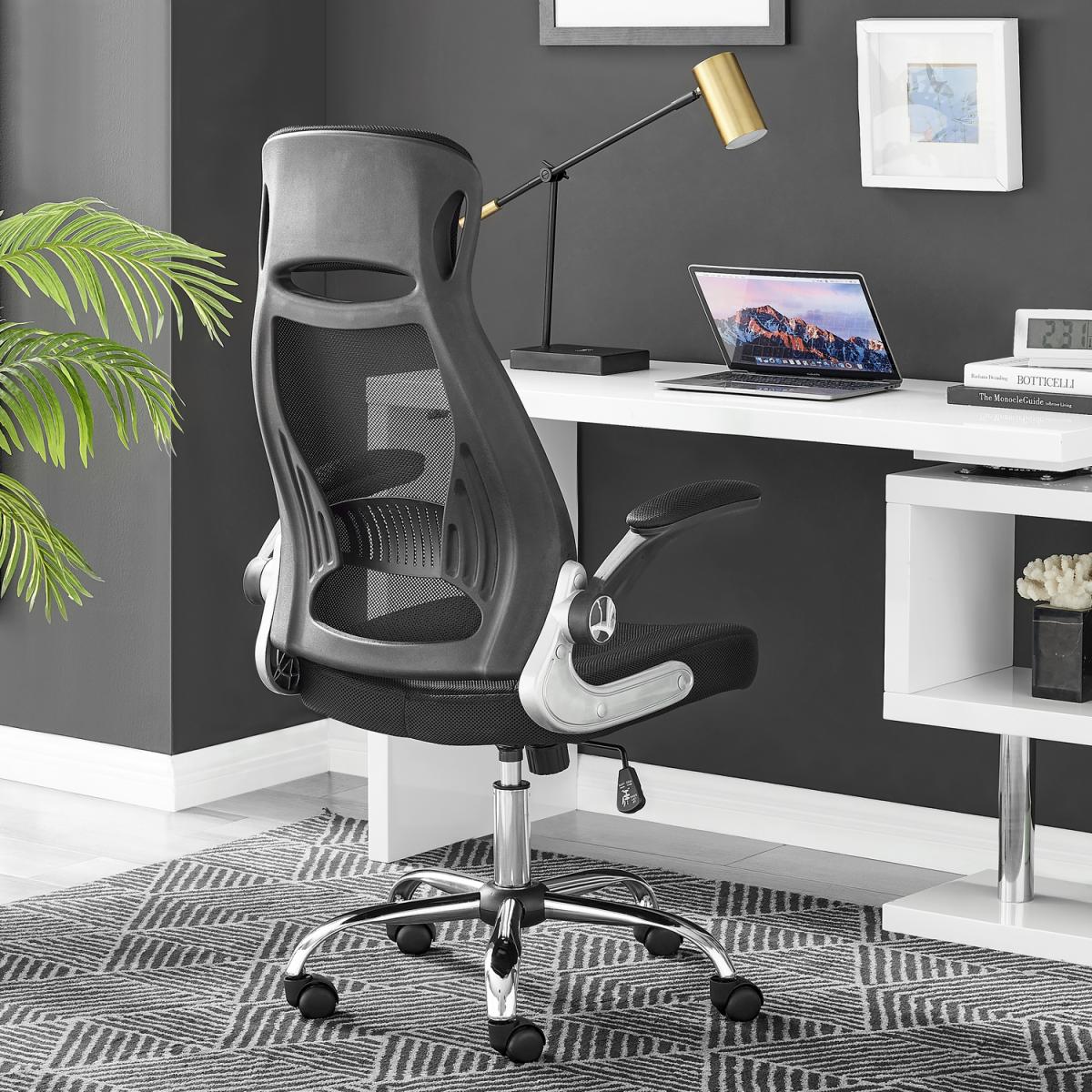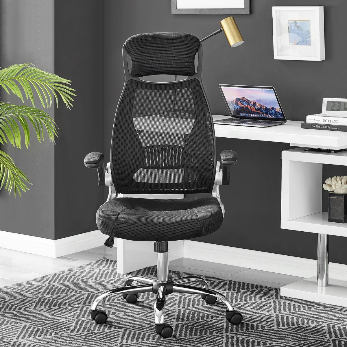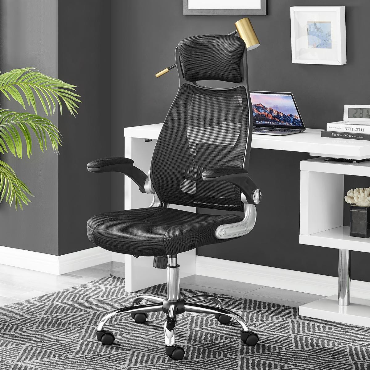 The Ellwood high-back executive office chair is modern and ergonomically designed for optimum support and comfort. A mesh back and thick 6.5cm foam padded seat, with neck, back and leg support to keep you comfy while you work or game. Sat on silver metal legs with caster wheels. The height and arms are fully adjustable will ensure you have a seating position perfect for you.