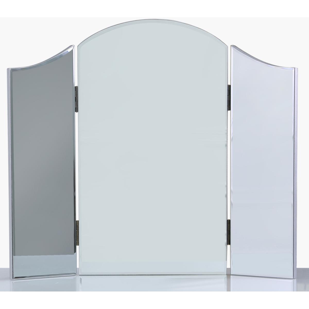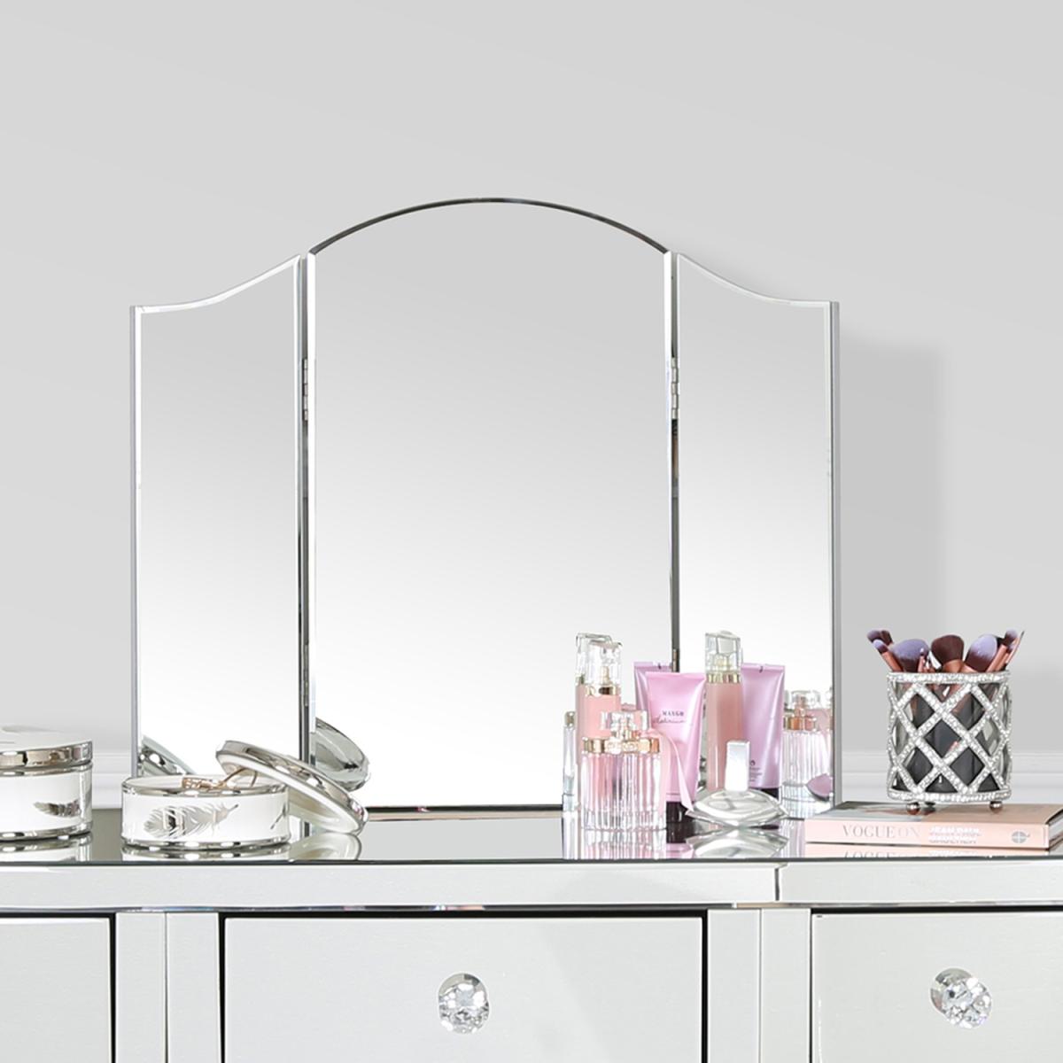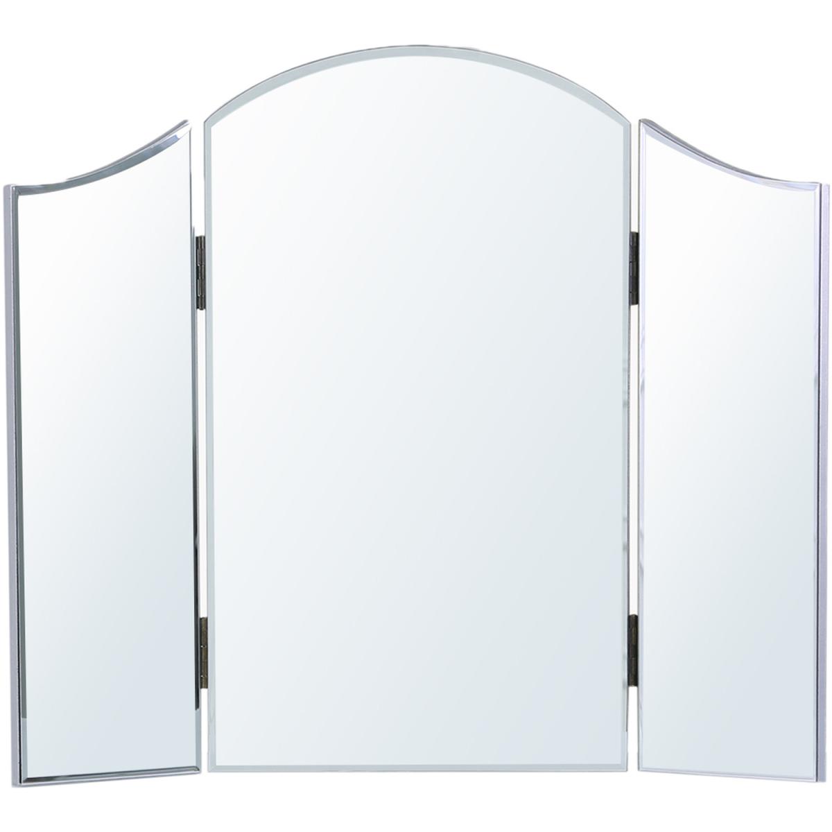 Simple, yet stylish and modern edge, this makeup free-standing dressing table mirror features a curved finish in the bevelled mirror with 3 mirrors on hinges, making it easy to fold up and put away when you require more space. This mirror is a must to have for your dressing area.