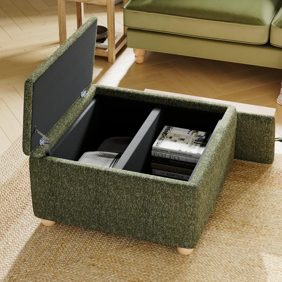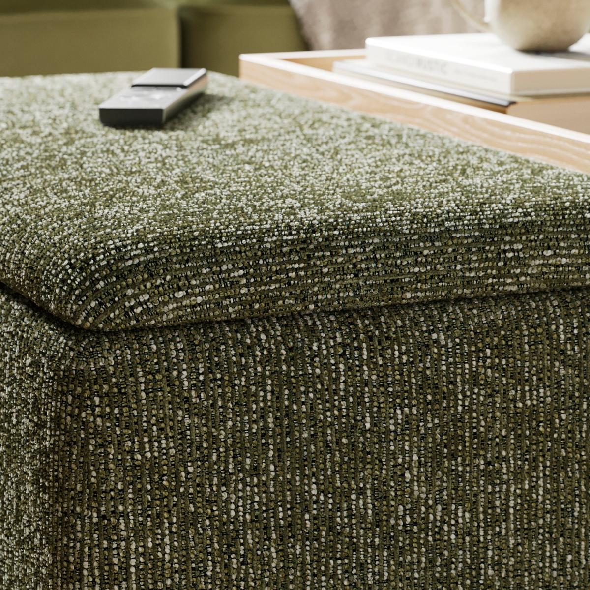 * Upholstered in a chunky boucle fabric * Built in reversible tray allows for easy swapping from a footstool to a tray table * Two storage compartments, perfect for cushions and blankets * Solid oak, round feet For those who love a pop of colour, the Elma Coffee Tray Table Ottoman in Mixed Boucle Green is a striking addition to your living room. Its vibrant green fabric and unique boucle texture create a bold focal point, while the built-in tray, made from ash veneer, is perfect for serving drinks. Whether you use it as a footrest, coffee table, or extra seating, the Elma Ottoman is as practical as it is stylish, and features a sturdy frame and solid wooden feet.