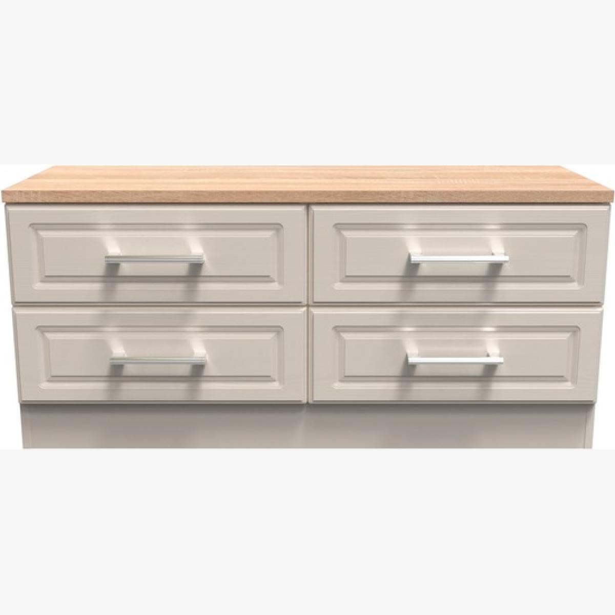 This compact 4 Drawer Bed Box from the elegant Elmley range has 4 storage drawers on smooth metal drawer runners with linen effect drawer linings. The Elmley range comes in a eye catching design and features elegant metal pull handles and a contrasting top. This piece provides plenty of storage in any room of the house as well as proving a great place for lamps, photogrpahs or other ornemantation.