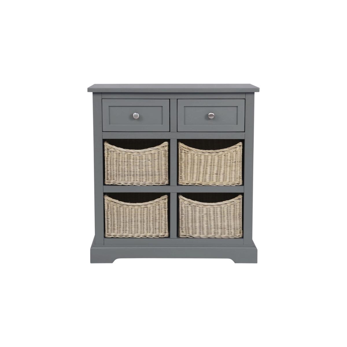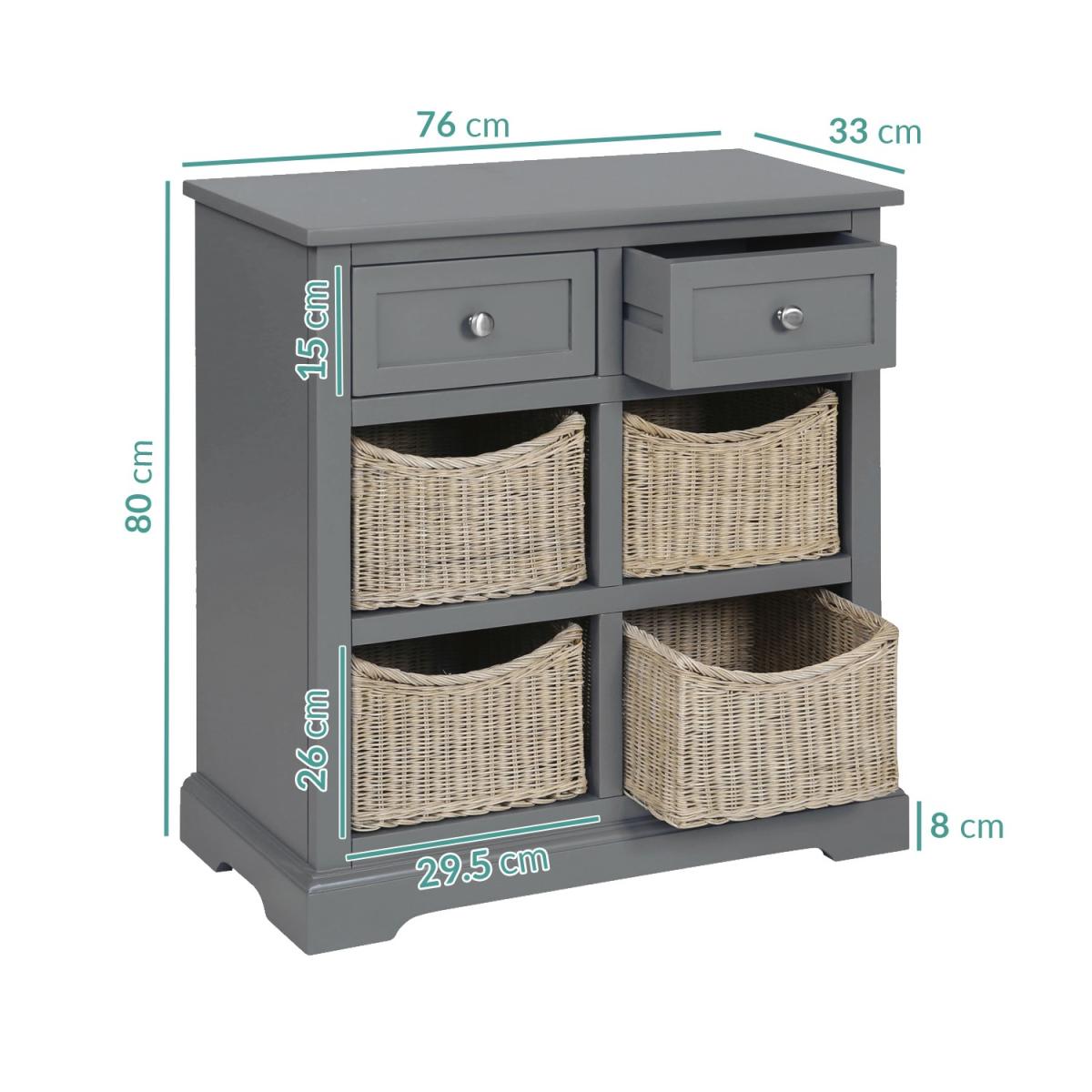 Features we love Two spacious drawers are ideal for keeping items in easy reach. Removable handwoven wicker baskets are ideal for hiding away clutter. A spacious top provides plenty more storage space or the perfect place for displaying items. Its classic farmhouse design produces a warm homely feel. There's absolutely no assembly required! All about me. The perfect addition to your hallway the Elms farmhouse inspired sideboard helps you to hide away clutter and unsightly essentials. Not only is it convenient but it is also a great looking piece which offers a cosy and warm effect to any room. Featuring two drawers and four removable handwoven wicker baskets you can really use this piece as you wish whether that's to hide away magazines and paperwork or simply to keep the kids toys out of the way. On top there's a really spacious surface which is perfect for displaying photos and more. With a hand painted dark grey finish and natural wicker this sideboard is fitting for any décor style. Crafted from both acacia wood and a strong wood combination this sideboard is really solid and will withstand everyday wear and tear. And best of all it's fully assembled so you can use it right away!. Need to know. Dimensions. H 80 x W 76 x D 33cm Drawer dimensions. H 20 x W 29.5 x D 28cm Material. Acacia wood and; a solid wood combination Finish. Hand painted dark grey. No assembly required More info Neat and compact design. Two drawers built in. Four individual cubbyholes. Four handwoven wicker baskets. Perfect for shoes and clutter Ideal for smaller spaces.