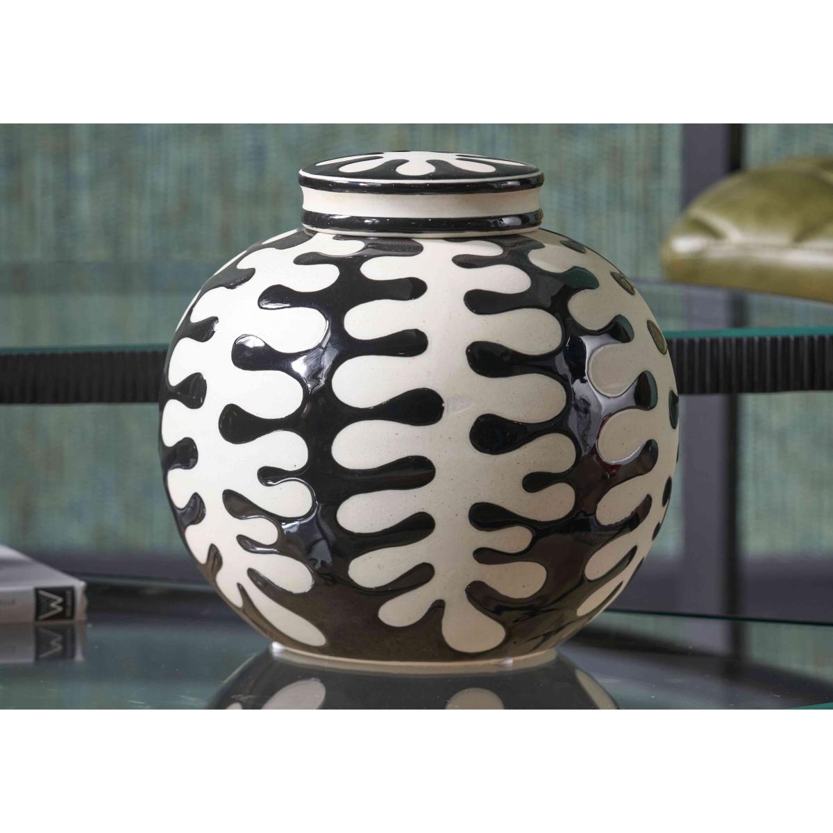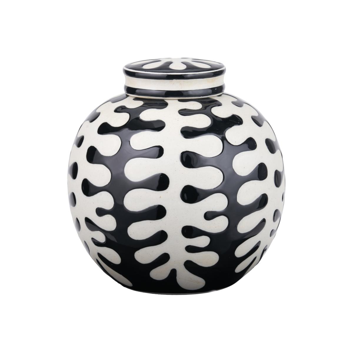 Add a touch of style to any surface with the Elodie ginger jar. In striking monochrome, it's both a functional storage piece and a luxurious decorative element. Why you'll love it Guaranteed to make a statement. Chic raised coral design. Perfectly proportioned sphere. Complements console tables, coffee tables and bedside tables. What you need to know Ceramic. Timeless black and white colour palette. Dust with a soft, clean, lint-free cloth. Dimensions Height: 20 cm (8 in). Width: 20 cm (8 in). Depth: 20 cm (8in).