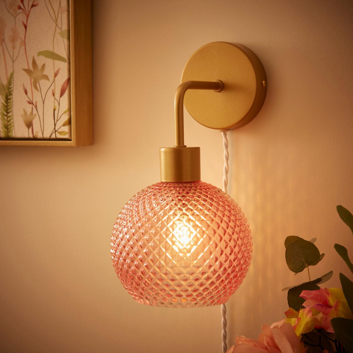 * Wall Light* 3 Colourways* Gold Painted Finish* Easy Fit - No Electrician Required Make a statement with the Elodie Plug In Wall Light. With its gold painted finish, this light fixture adds a touch of glamour to your space. Eye-catching and stylish, the three beautiful colourways - green, pink and clear - allow you to choose the one that best complements your decor. For your added convenience, the Elodie Plug In Wall Light doesn't require an electrician to install - have your light ready to shine bright, quickly and easily!