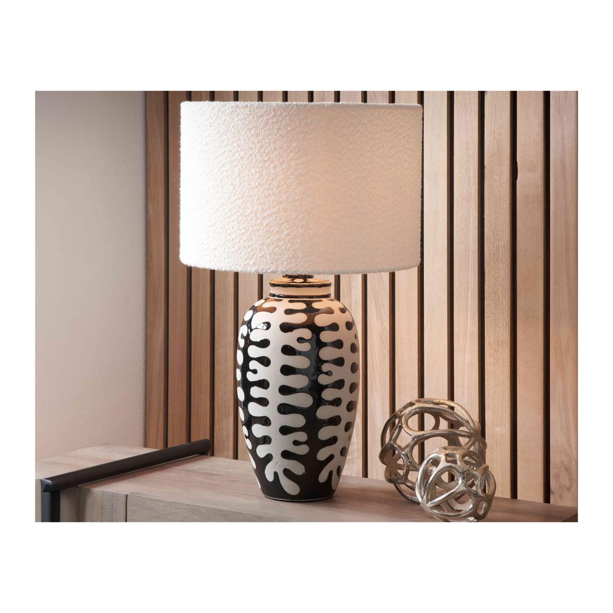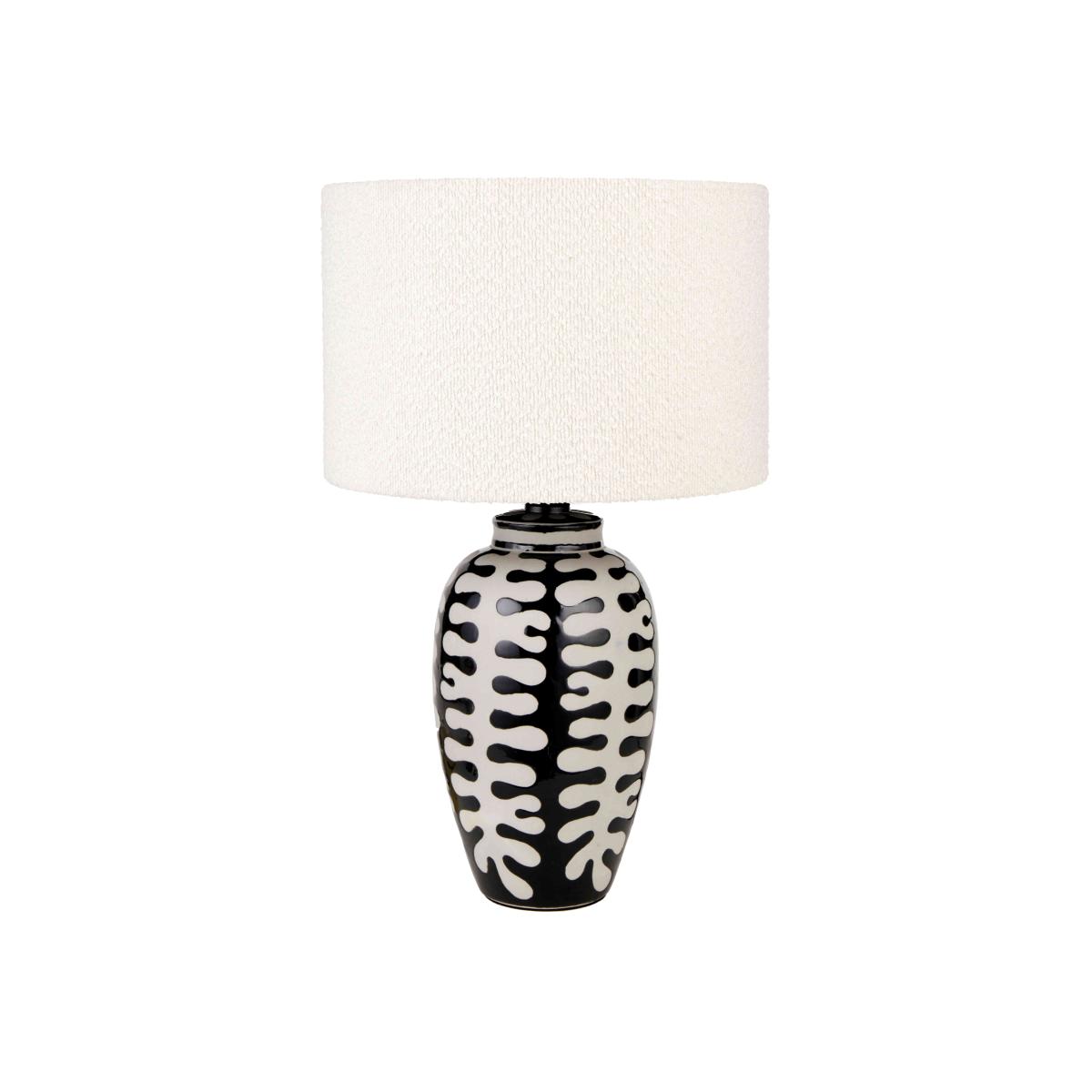 Coral design meets contemporary monochrome in the Elodie table lamp. It's beautifully hand-finished and comes with a stylish boucle shade. Why you'll love it Truly timeless and a real conversation piece. Brings a touch of drama to your interior. Unique raised coral design. On-trend boucle shade. Complements various interior aesthetics. What you need to know Ceramic base. Lamp shade included. Requires 1 x LED E27 max. 12W bulb, not included. Supplied with 200 cm of cable. Dust with a soft, clean, lint-free cloth. Dimensions Height: 57 cm (23 in). Width: 35 cm (14 in). Depth: 35 cm (14 in).