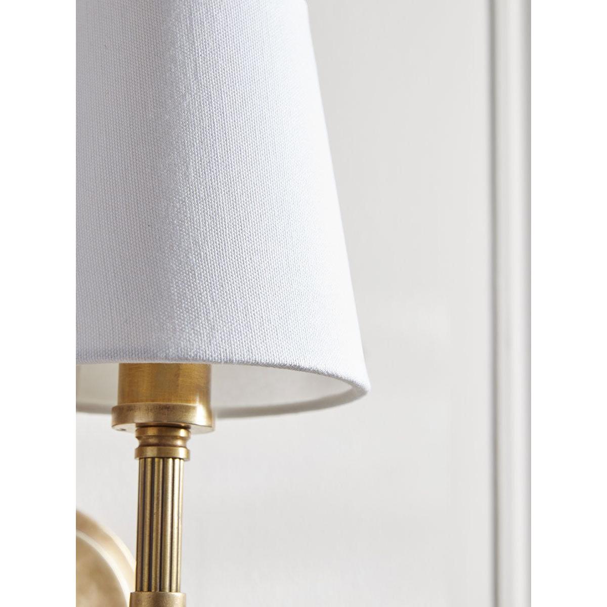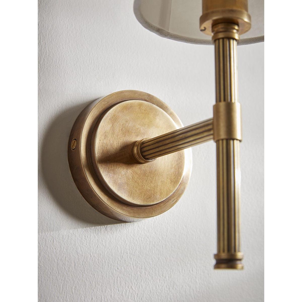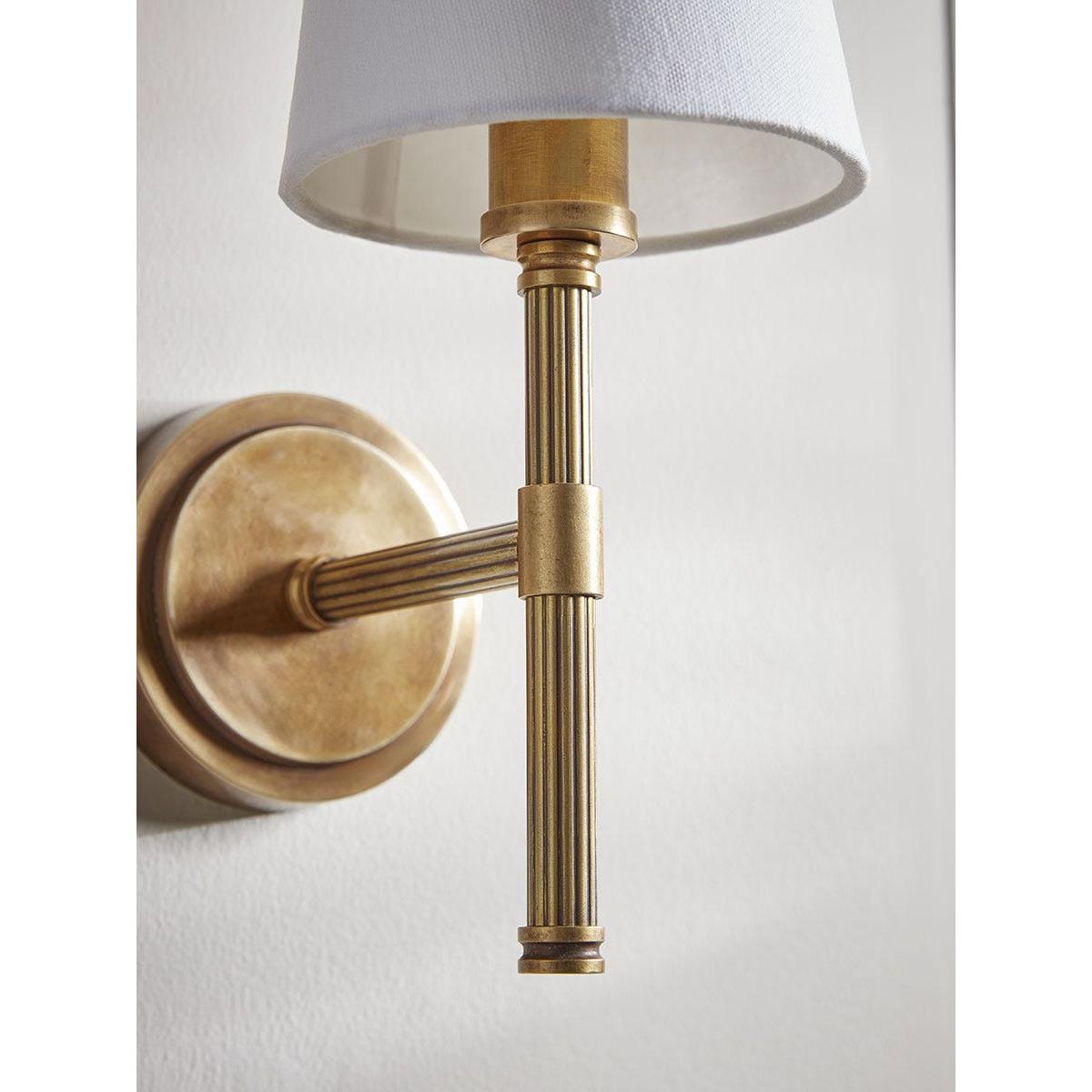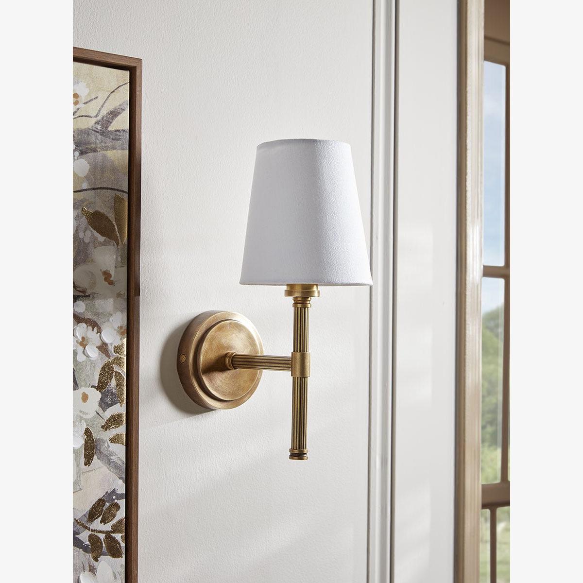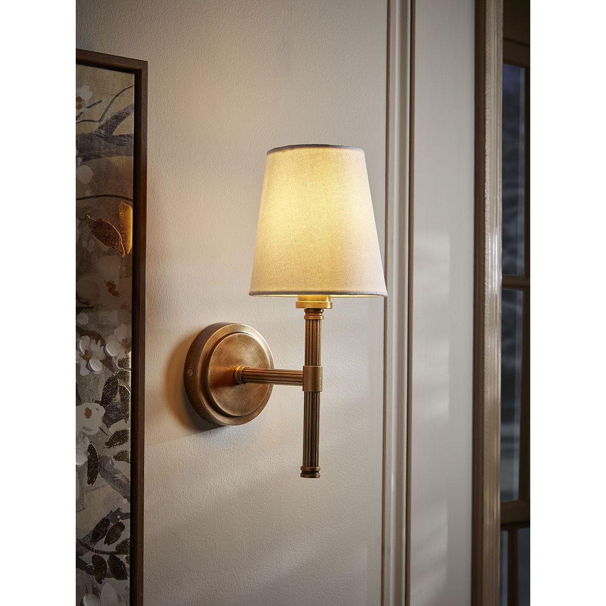 Gently warm your home with our Eloise Wall Light. An antique brass wall plate supports a brass arm engraved with elegant fine lines which holds a bright white cotton shade, inviting vintage charm and sophistication into your home.  Discover how to create the perfect lighting scheme for your home using our Lighting Buying Guide.