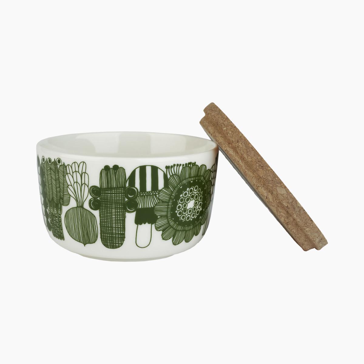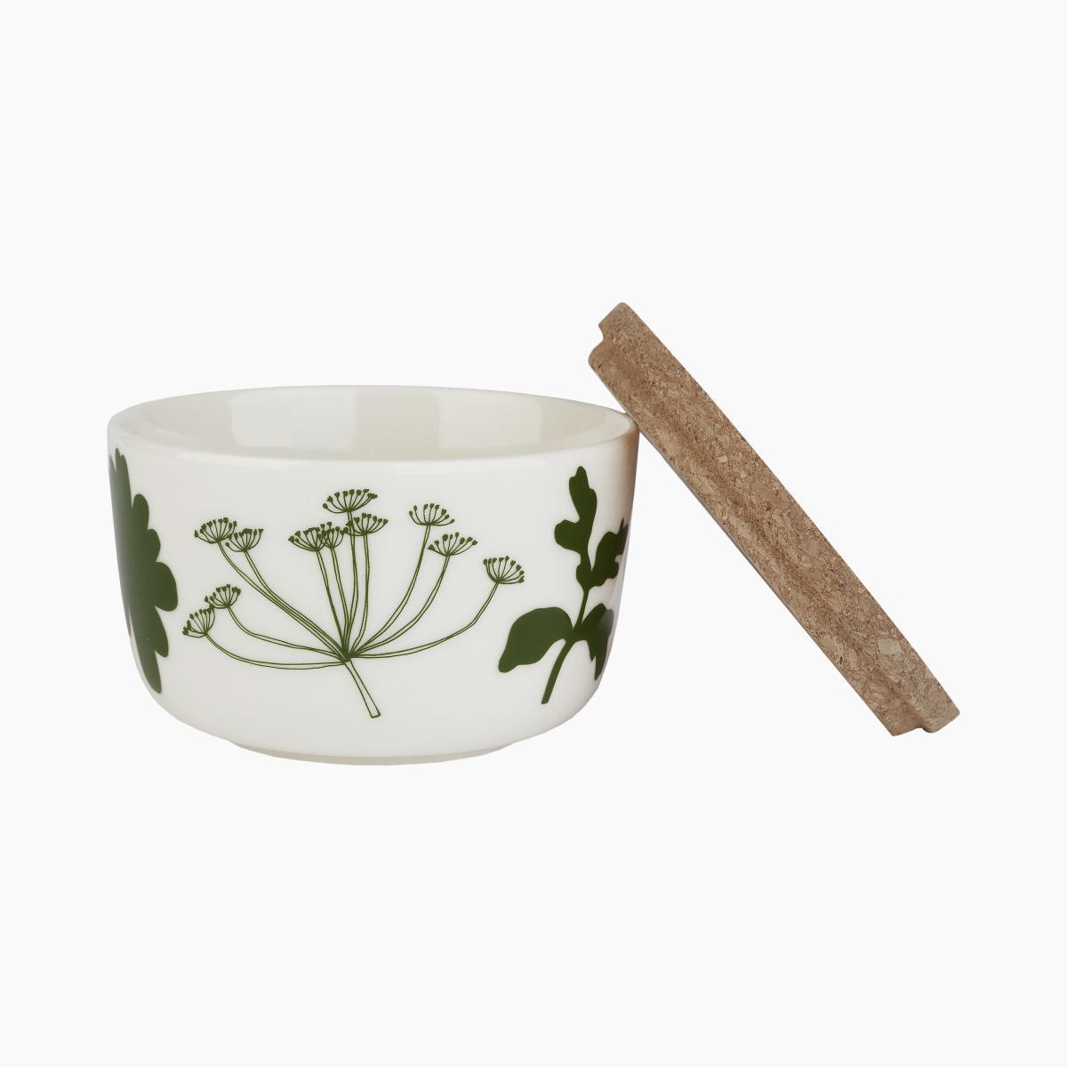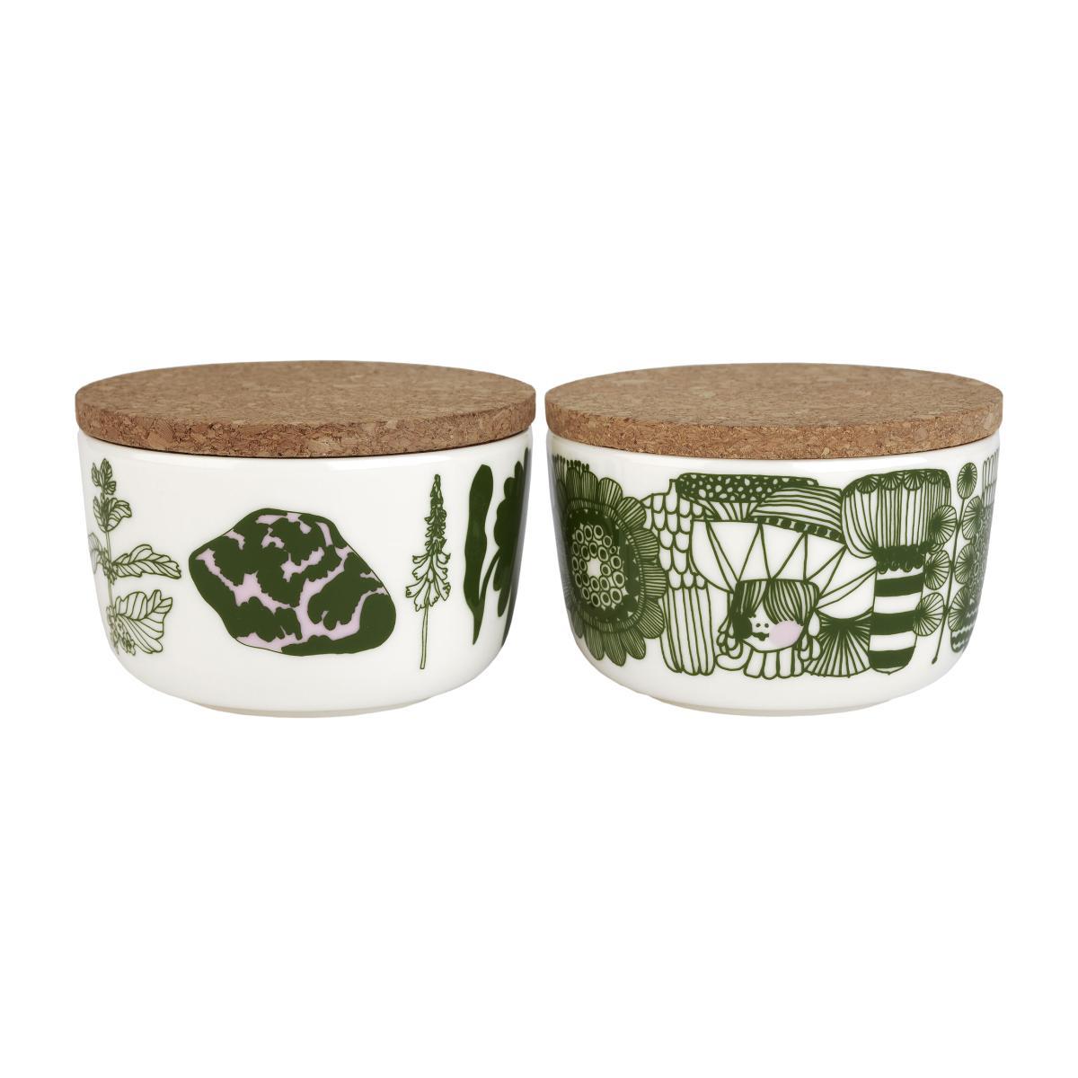 These set includes 2 sandstone pots with cork covers. The pots have two different patterns created by Maija Louekari: the Siirtolapuutarha pattern and the Elokuun Varjot pattern. To create the Elokuun pattern, the young Finnish illustrator found inspiration in her own wildflower garden. The designer was fascinated by the changing seasons in the north - new beginnings and abundantly growing vegetation which grows back year after year. This pattern is a tribute to greenery, freedom and warm breezes. The Siirtolapuutarha depicts the saturated abundance of an urban cottage garden. The flat colour tints and freehand lines are typical of the Marimekko collection. Cheerful, chic and graphic, the Marimekko accessories collection brightens up your interior! The simple shapes showcase the collection’s stunning designs. You can compose a coordinated service yourself, or mismatch cups, plates and bowls to create your own style! Created in 1951, Marimekko is a state of mind, a way of life based on creativity, freedom of spirit and inventiveness. Its notoriety dates back to 1960, the year in which Jackie Kennedy made several public appearances in dresses designed by Marimekko. The brand went on to enjoy enormous success, which continues today with a range of clothing and decorative accessories in vibrant colours, for a house full of inspiration!.