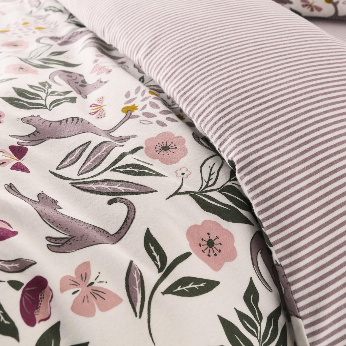 A rich repertoire of plants and animals in warm tones, for the Elona child's bed linen, in soft, warm flannel. Designed by La Redoute Intérieurs. The cotton flannel is a brushed cotton giving it a felted and fluffy appearance, very soft to the touch. Very thick and warm, it is the ideal bedding to face winter's chill. Product Details • 100% cotton flannel • cotton flannel • 144 thread count • Cat print on front, stripes on back • Straight buttoned hem. As the seasons change, add your own personal touch by mixing the Elona range with our range of Scenario flannel plains. Care Advice • Machine washable at 40°CDimensions • 140 x 200cm: Single • 200 x 200cm: Double • OEKO-TEX® Standard 100. Standard 100 certification by OEKO-TEX® tests textile products for harmful substances via an independent, international label.