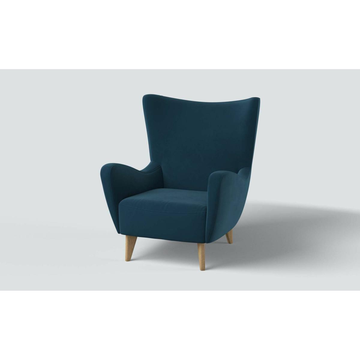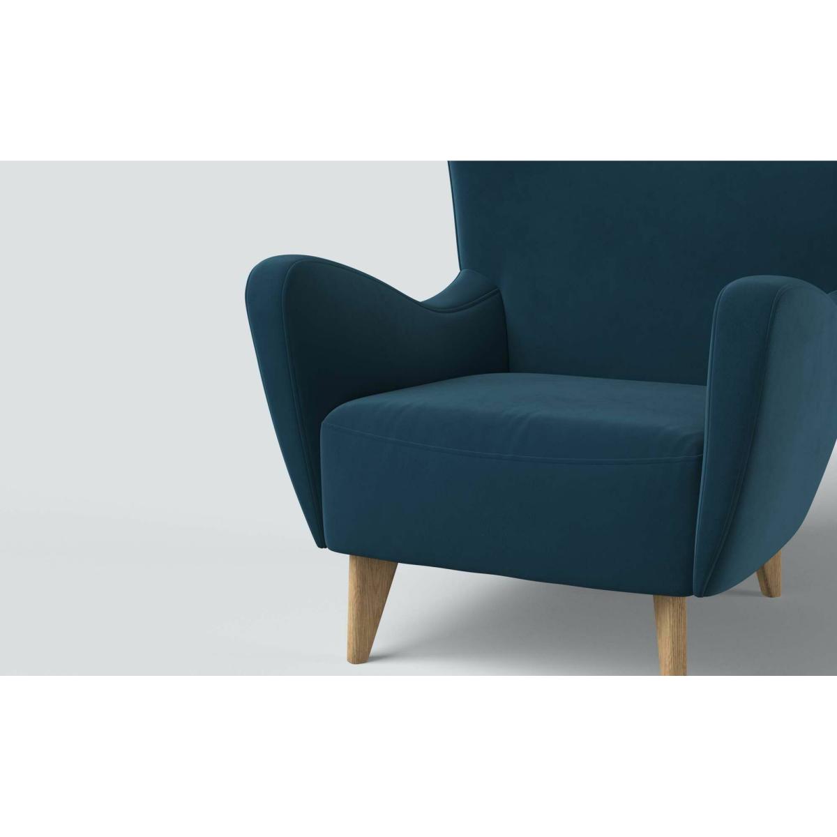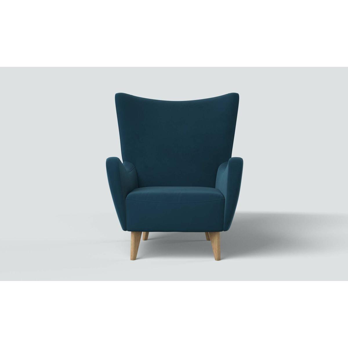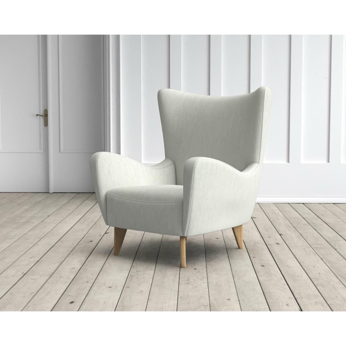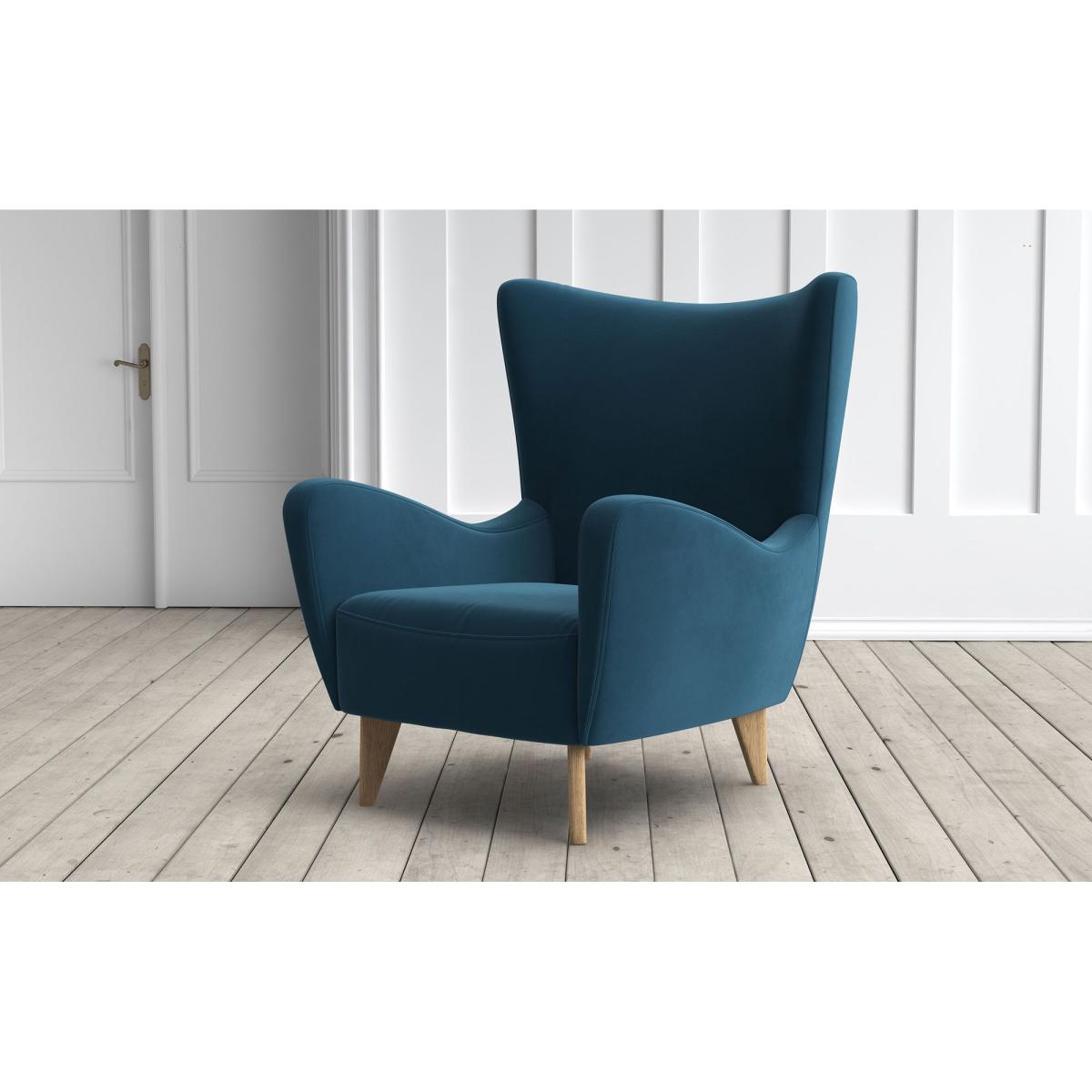 With graphic lines and bold styling, our Elsa wingback chair is a true statement piece. Sat atop natural oak wood legs, the high backed, embracing shape and foam filling make for a well-supported seat. Available in a range of luxurious fabrics and colours, the Elsa can be tailor-made to complement any interior space. Pictured: armchair and footstool in Olive Green Lario Velvet. Handmade in 8-10 weeks and then delivered usually within 10 working days. All pieces from this collection will be delivered without the legs attached. Our delivery specialists will assemble your item for you and take away the packaging.