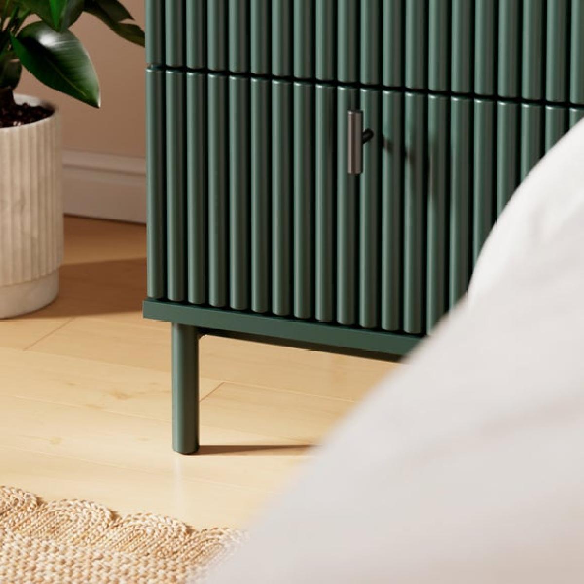I really like this Elsie bedside table for its sleek, contemporary design and practical storage. The slatted front adds texture and visual interest, making it versatile enough to complement modern, Scandi, or even eclectic interiors. It’s perfect for adding a touch of colour or pattern through decorative accessories on top, like a statement lamp, small plants, or cosy bedtime essentials. Its compact size makes it ideal for smaller bedrooms, while the two drawers provide handy storage for overnight items. For styling, consider pairing it with soft textiles, like a textured rug or throw, to create a welcoming look. Its minimalist yet functional design makes it a stylish and practical addition to most bedroom schemes.