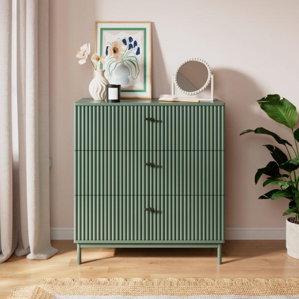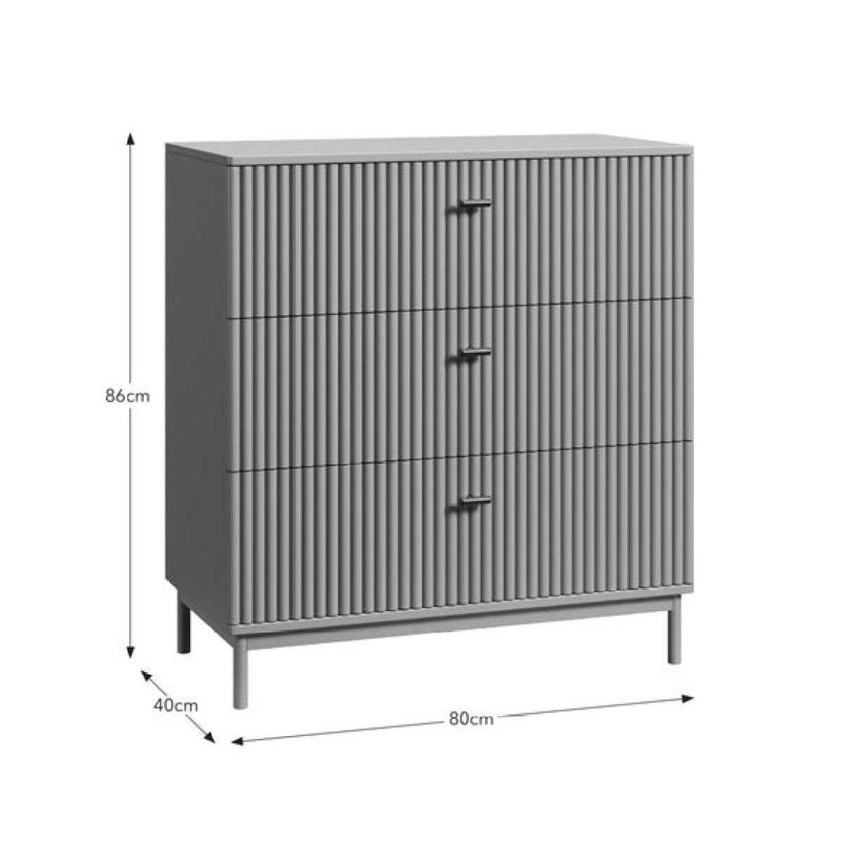 Dunelm Exclusive - Designed and Developed by Dunelm * Modern chest of drawers * Soft closing drawers * Painted finish This three drawer chest is a beautifully balanced piece that offers generous storage without overwhelming your space. With a calming painted finish, it brings a sense of serenity and softness to your bedroom. Each drawer glides open smoothly, revealing ample space for clothing, accessories, or linens. The design is clean and classic, with subtle detailing that adds just the right amount of charm.