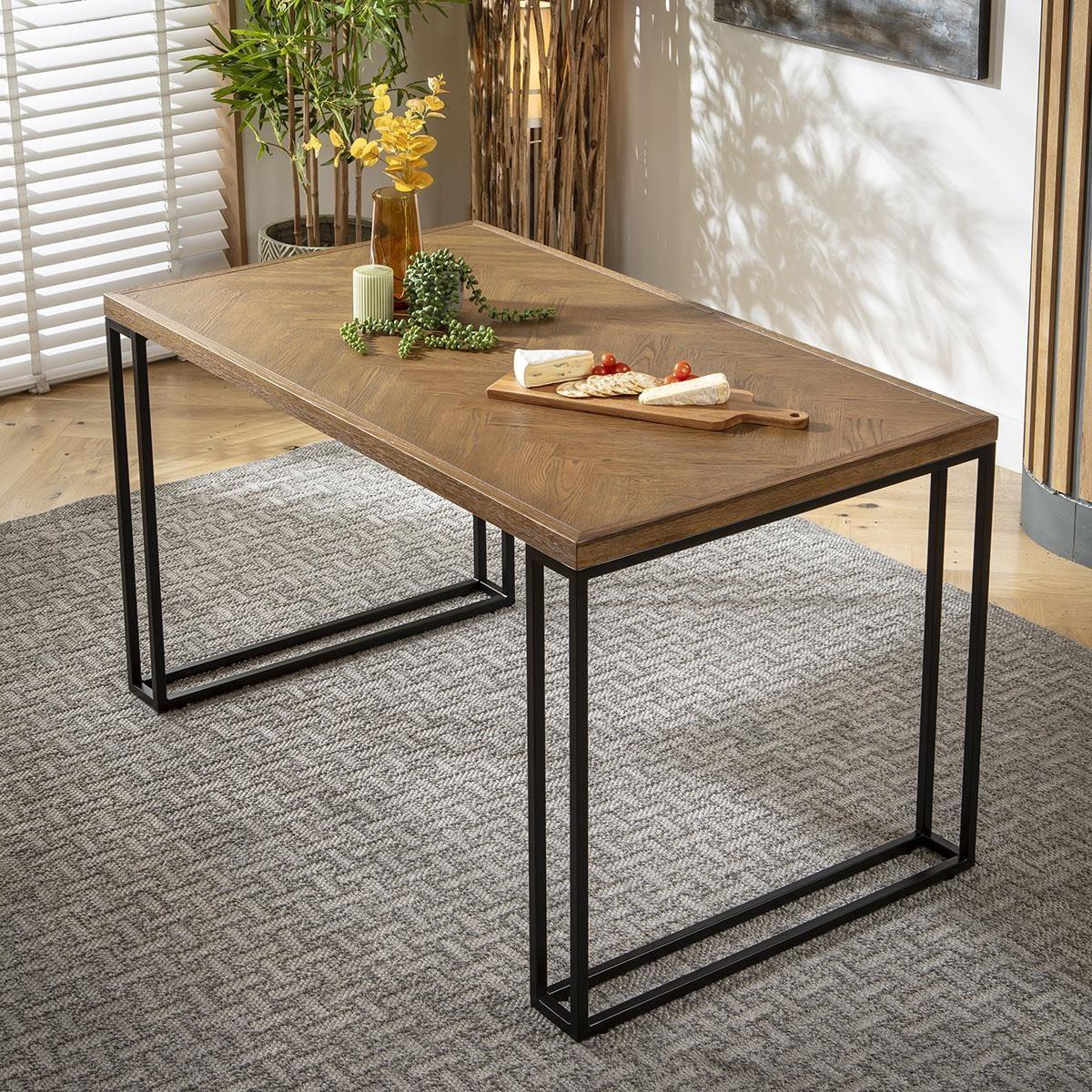 This 6 seater dining table and chairs set includes modern swivel dining chairs, featuring a chic wingback design and a quilted backrest in cream fabric, with our modern, industrial dining table adorned with durable herringbone tabletop and black metal legs. This modern dining set is crafted for durability and comfort. Enhance your space with the modern, industrial dining table for 6, designed with a 140cm by 80cm size. A perfect dining table set for 6, its durable herringbone tabletop showcases a stylish stained finish atop black metal box frame legs. Ideal for modern, minimalist dining rooms with a touch of industrial flair. Elevate your dining experience with the set of 6 modern swivel dining chairs in this dining set. Featuring a chic wrap-around wingback design and a quilted backrest, this unique dining chair combines style and comfort. Its cream luxury fabric and 4-point black swivel base make it perfect for contemporary dining rooms or kitchen spaces. This 6 seater dining set combines modern Elsie chairs with the stunning Gemini table. Whether you love the Elsie chairs and would like to purchase them individually, or you think the Gemini table would complete your dining room decor better with another chair, you can easily mix and match our modern dining tables and chairs to curate something truly unique. Table Size W140cm D80cm H78cm Chair Size W59cm D56cm H82cm Modern Dining Table And Chairs Set For 6