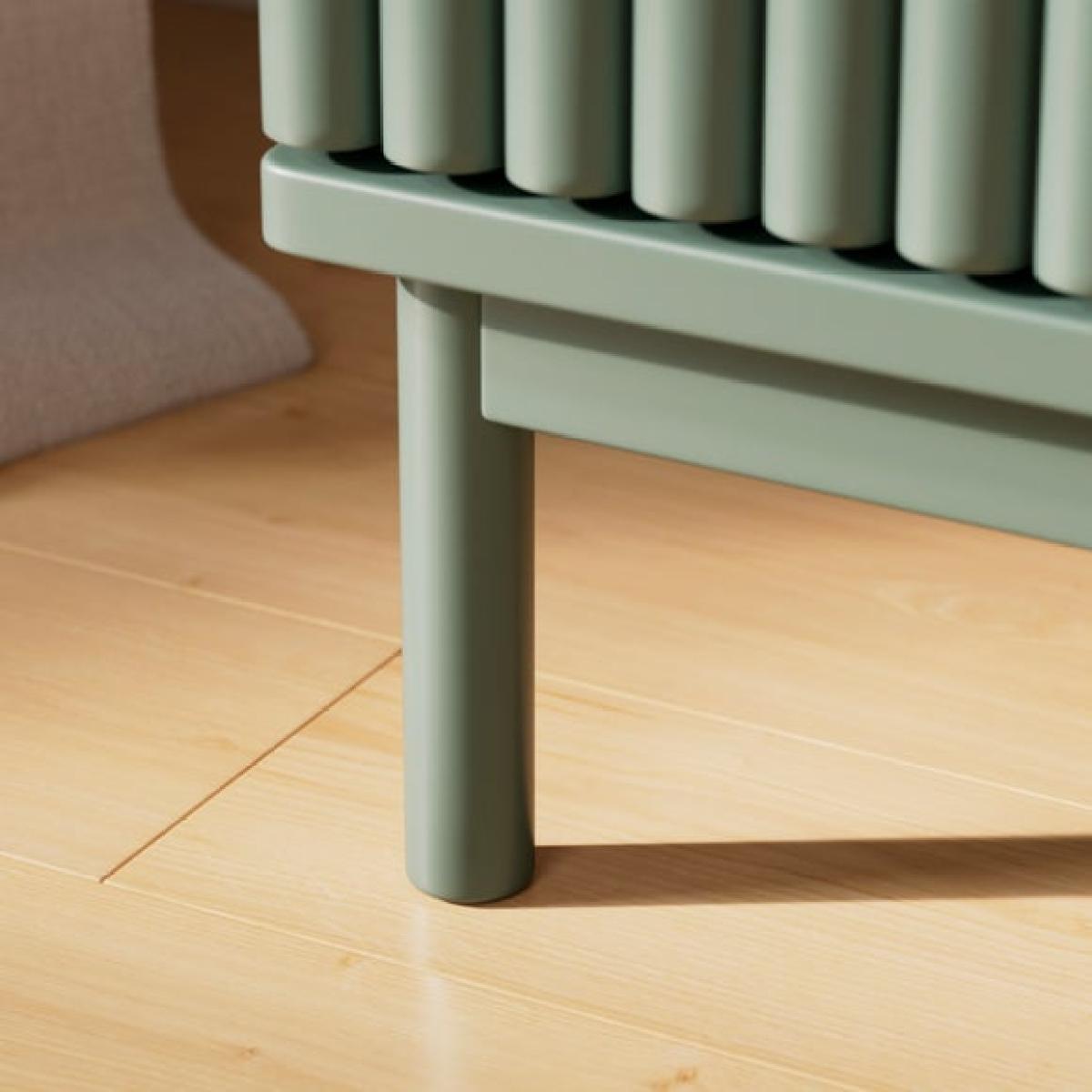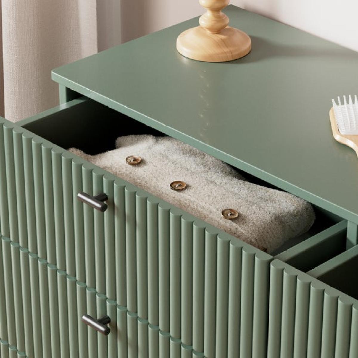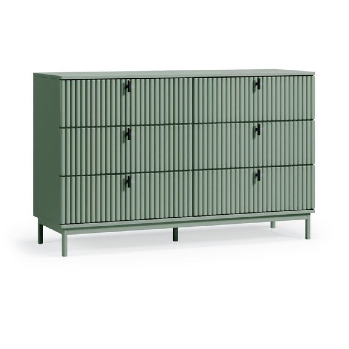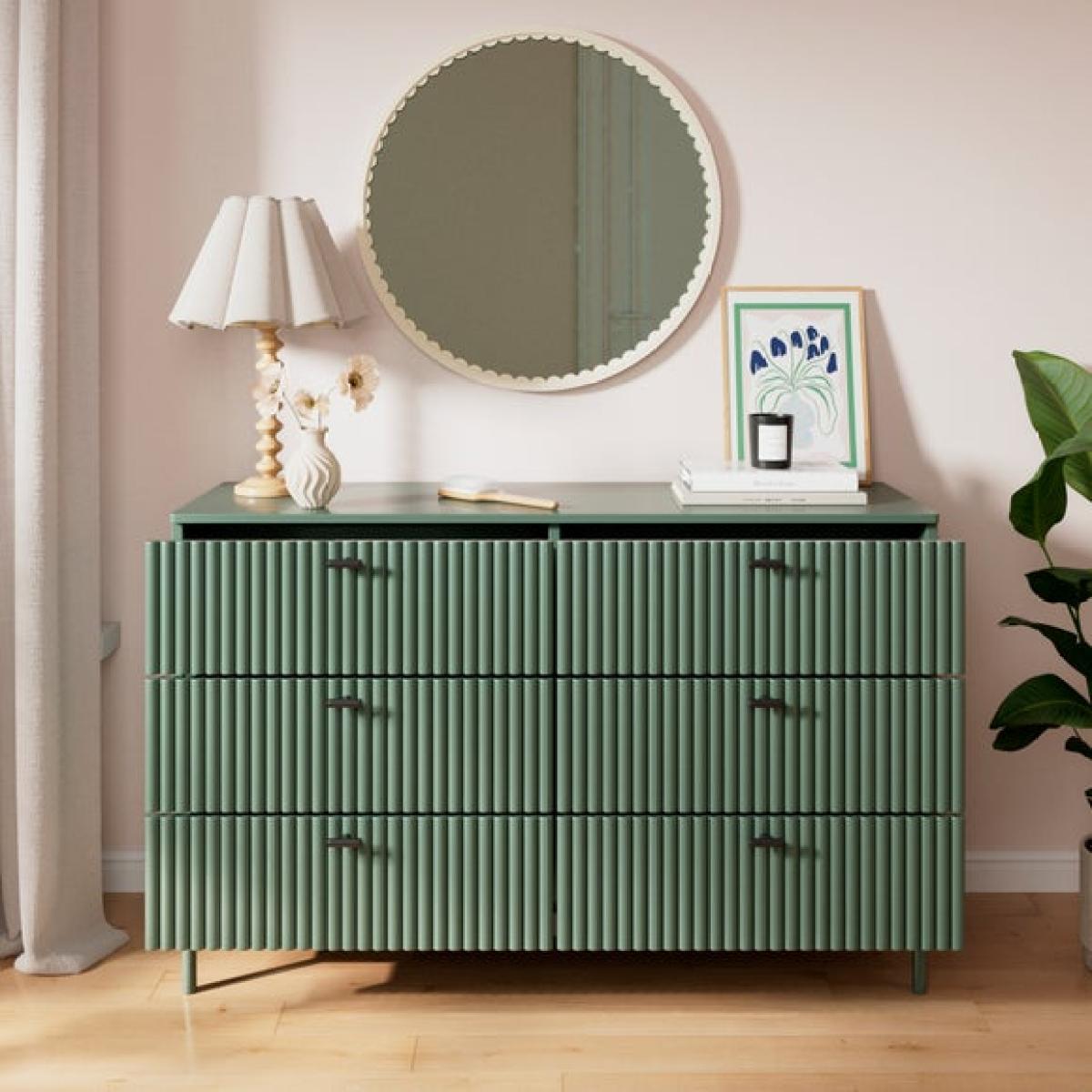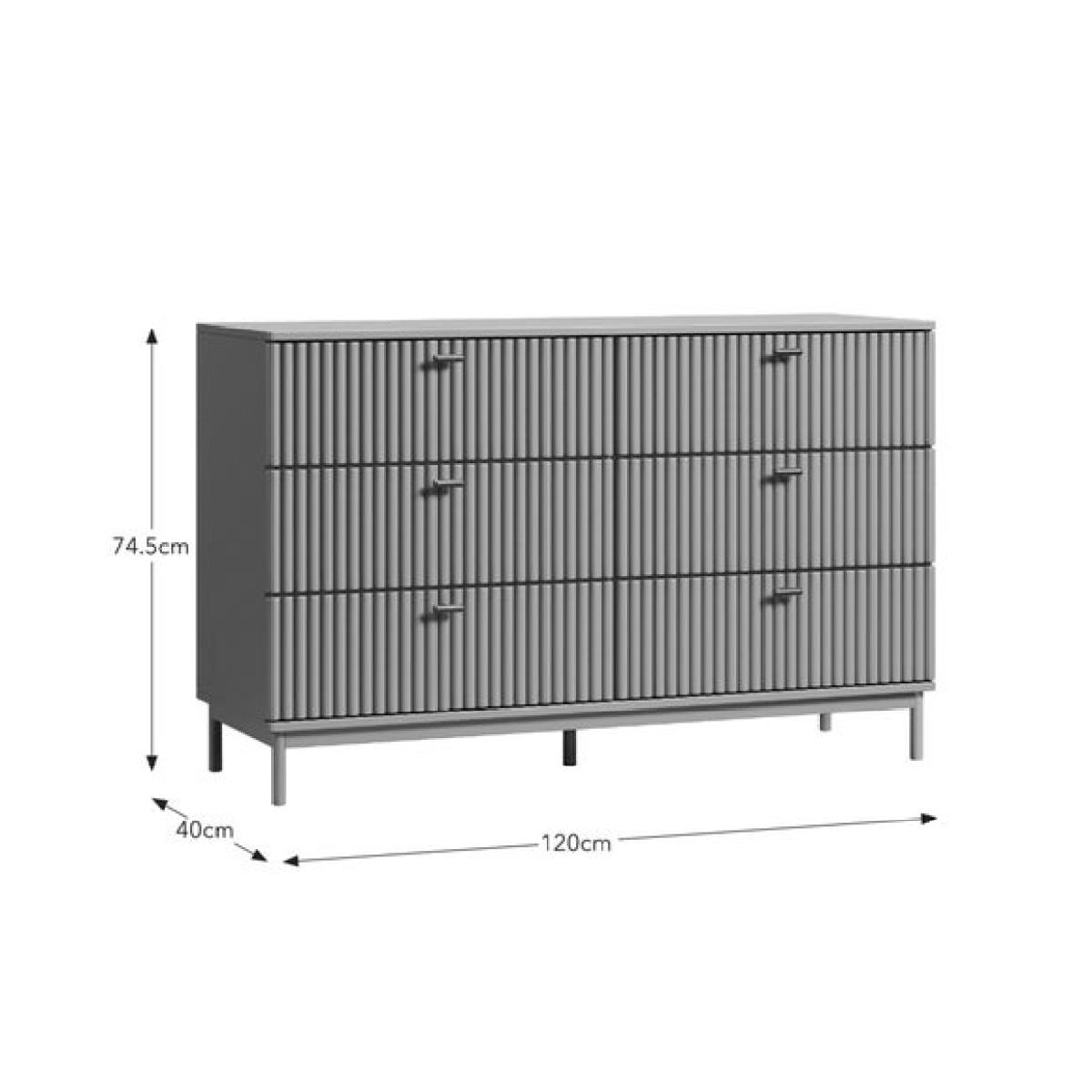 I love this dresser for its versatile style and practical storage. Its clean lines and textured front make it an excellent choice for contemporary interiors, but it can also add interest to more eclectic or boho spaces. The six drawers provide ample storage, making it ideal for bedrooms or even living rooms where organisation is key. For styling tips, consider pairing it with minimalist or nature-inspired accessories to enhance its textured look, and add a small table lamp or decorative objects on top for a personalised touch. Its muted colour works well with both soft neutrals and bold accents, making it a flexible piece to incorporate into various interior schemes.